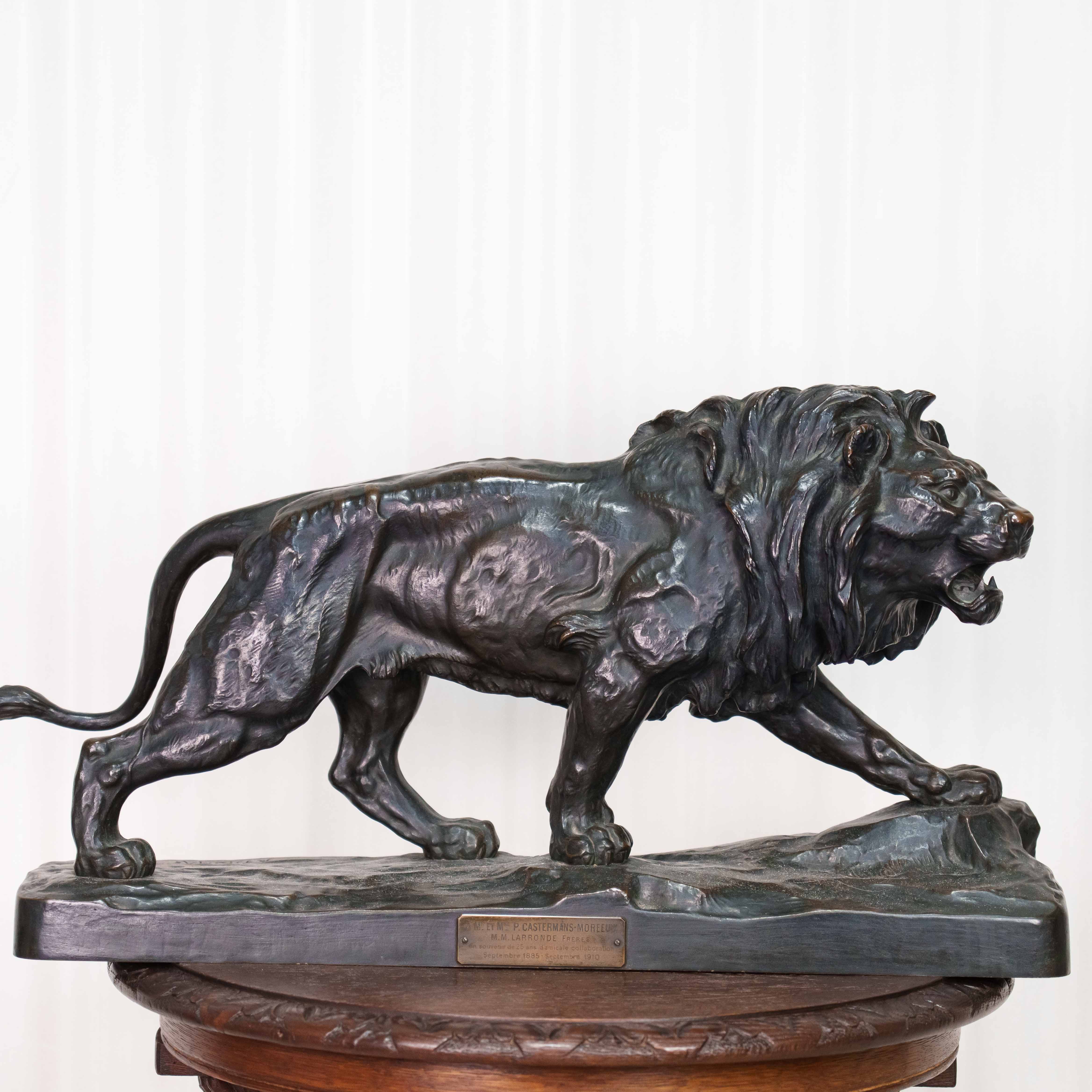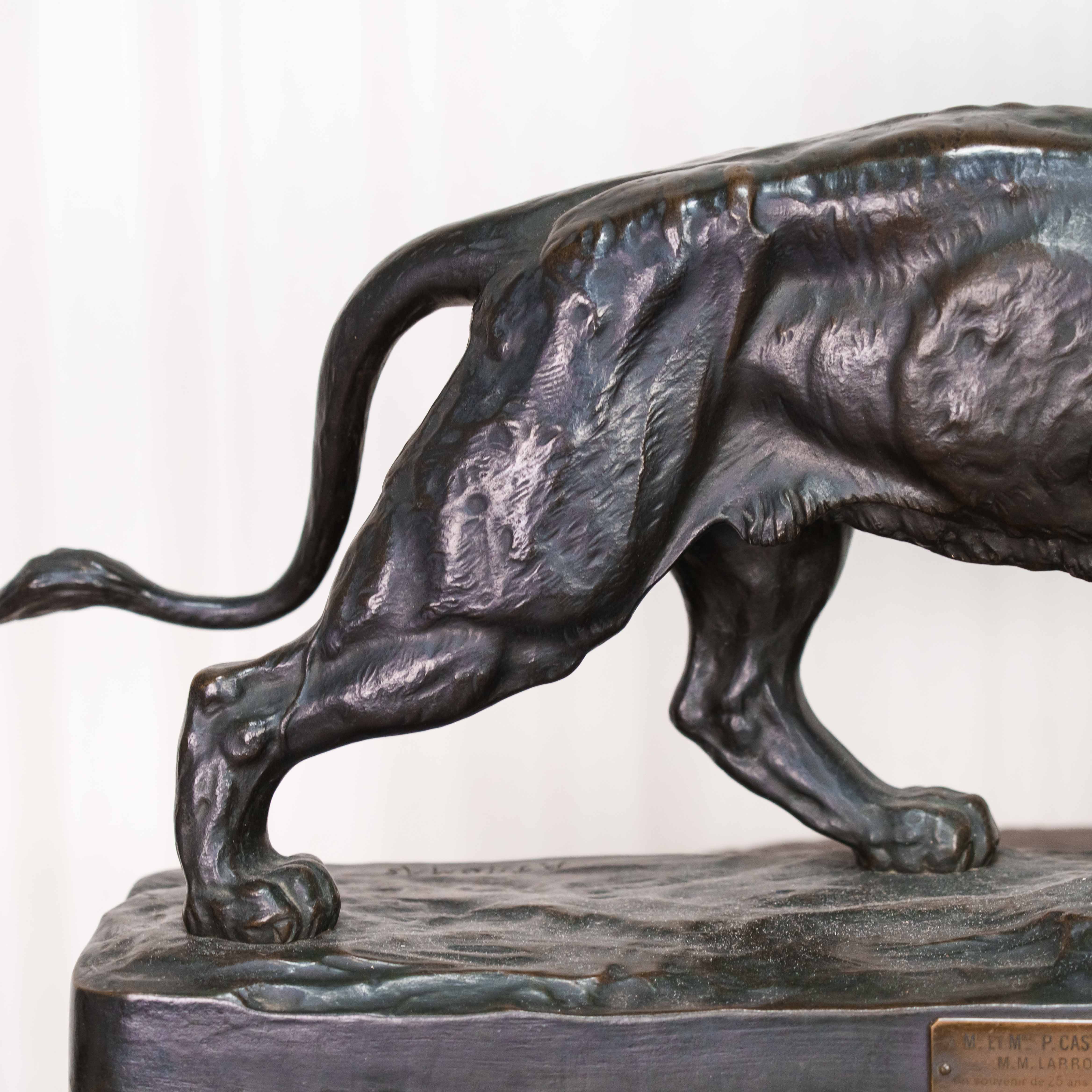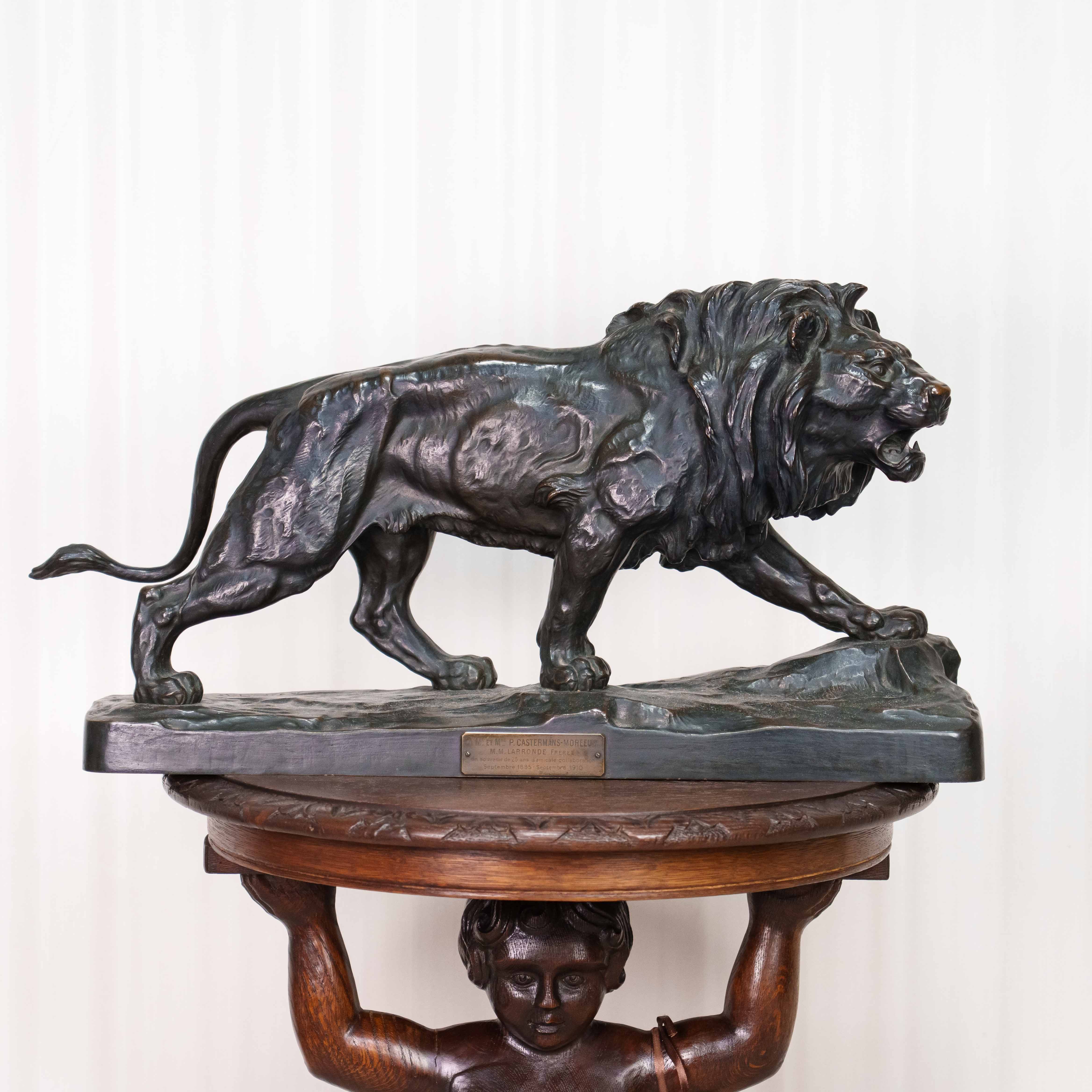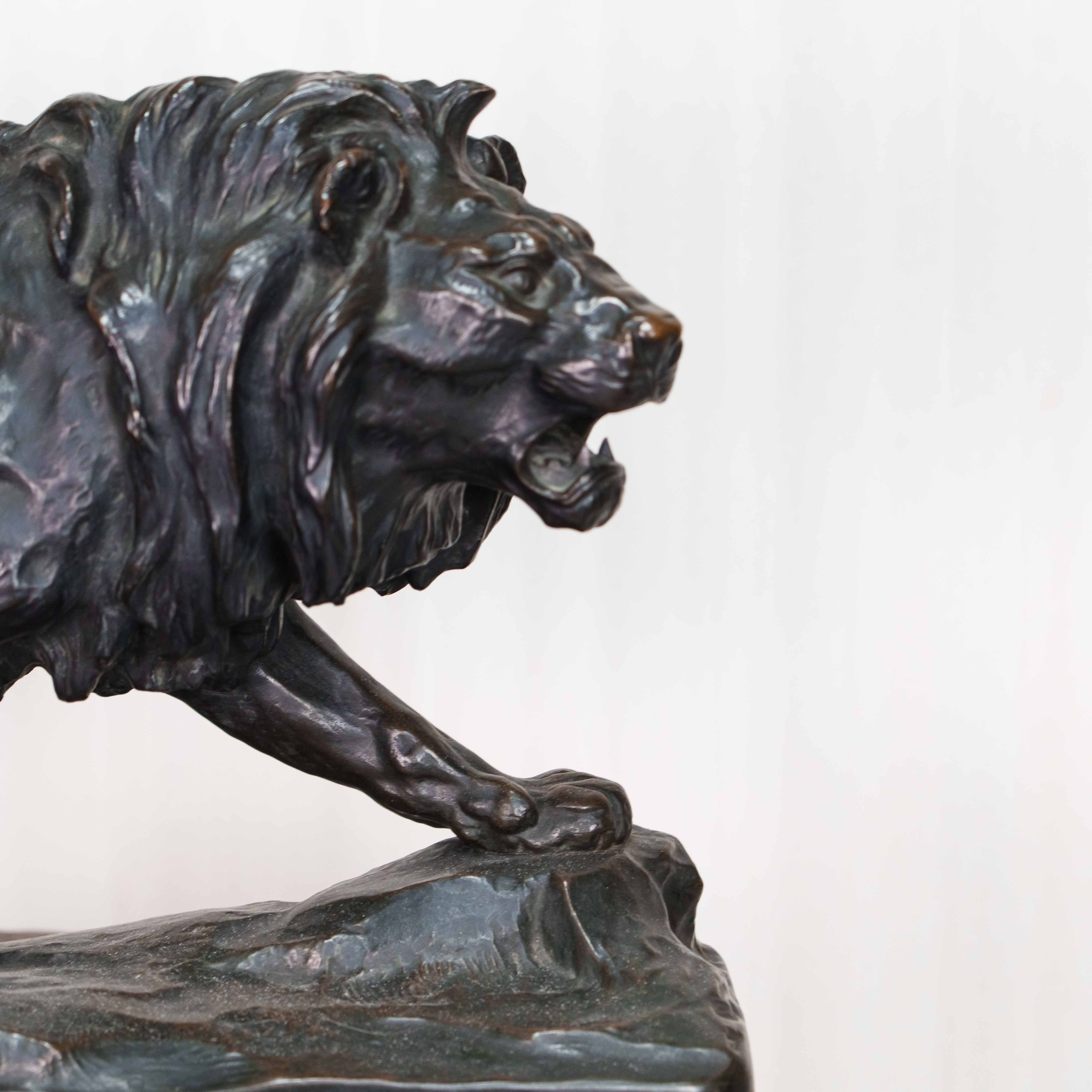 Кабинетная скульптура идущего льва, созданная известным французским скульптором-анималистом Paul Thomas. Лев, как Царь зверей с древности почитался различными народами, как на Западе, так и на Востоке, символизируя власть и достижение высшей цели, в геральдике олицетворяя собой силу, мужество, великодушие, храбрость и отвагу. Лев изображен в движении, создавая ощущение животной силы и целеустремленности. Голова слегка повернута в сторону, взгляд направлен вдаль. Пышная грива, развевающаяся вокруг головы, добавляет образу величая. Тонкая проработка деталей, таких как грива, рельеф мышц и складки на коже, создает реалистичность и подчеркивает анатомическую точность. Особое внимание уделено выразительным элементам, таким как глаза, зубы и когти. Скульптор демонстрирует глубокое знание анатомии и поведения львов. На прямоугольном постаменте имеется факсимиле автора — P. Thomas, так же имеется клеймо литейной мастерской Ch. Gautier.