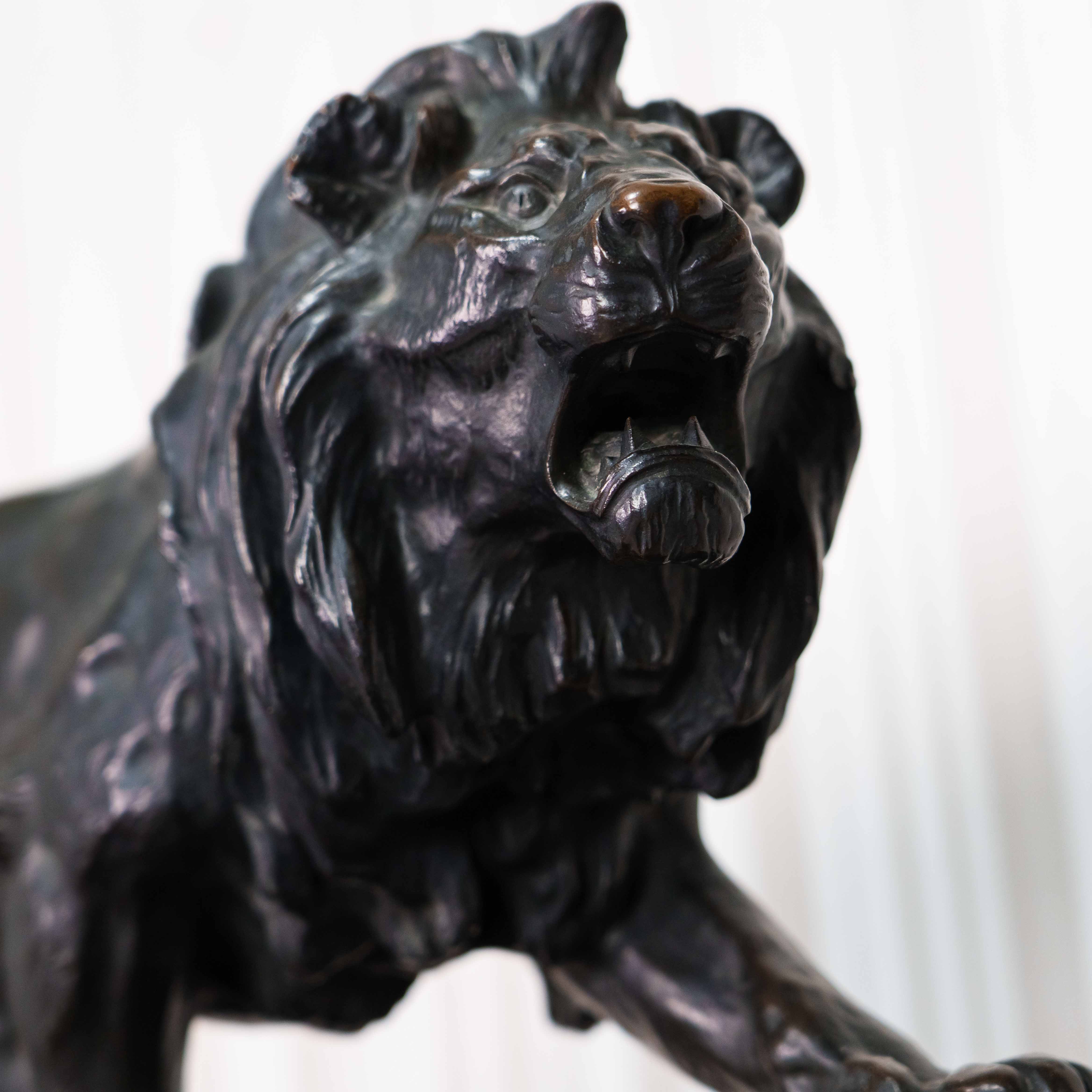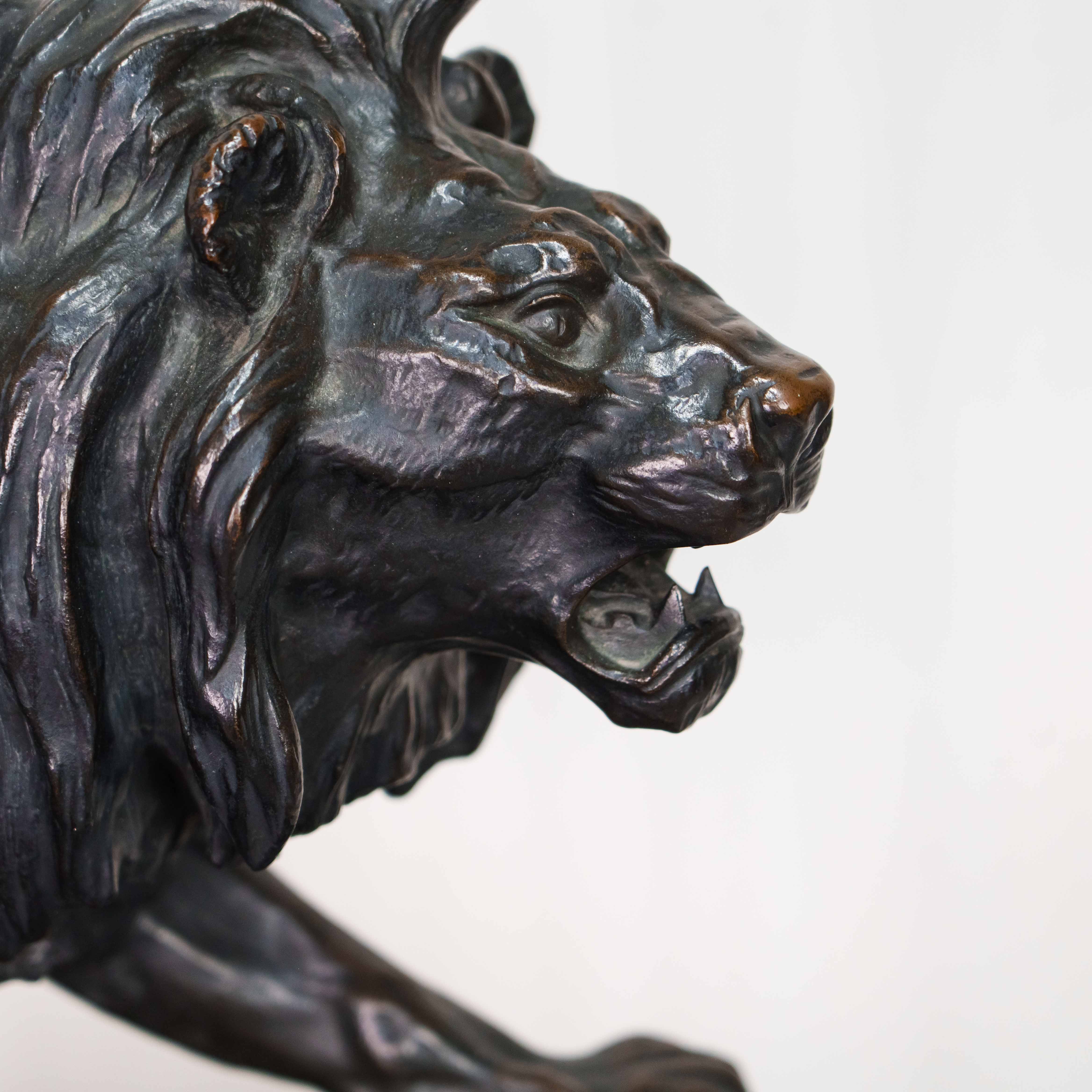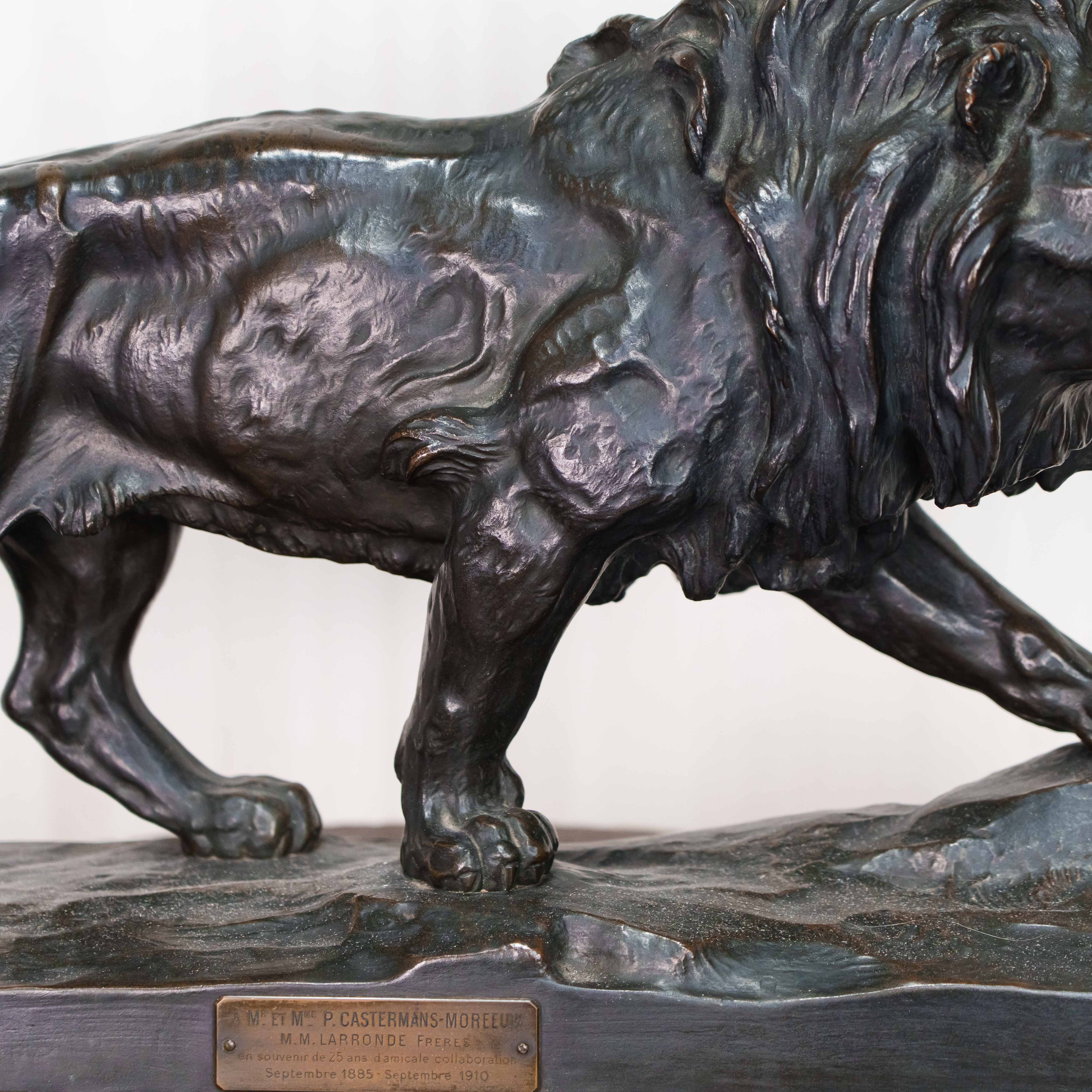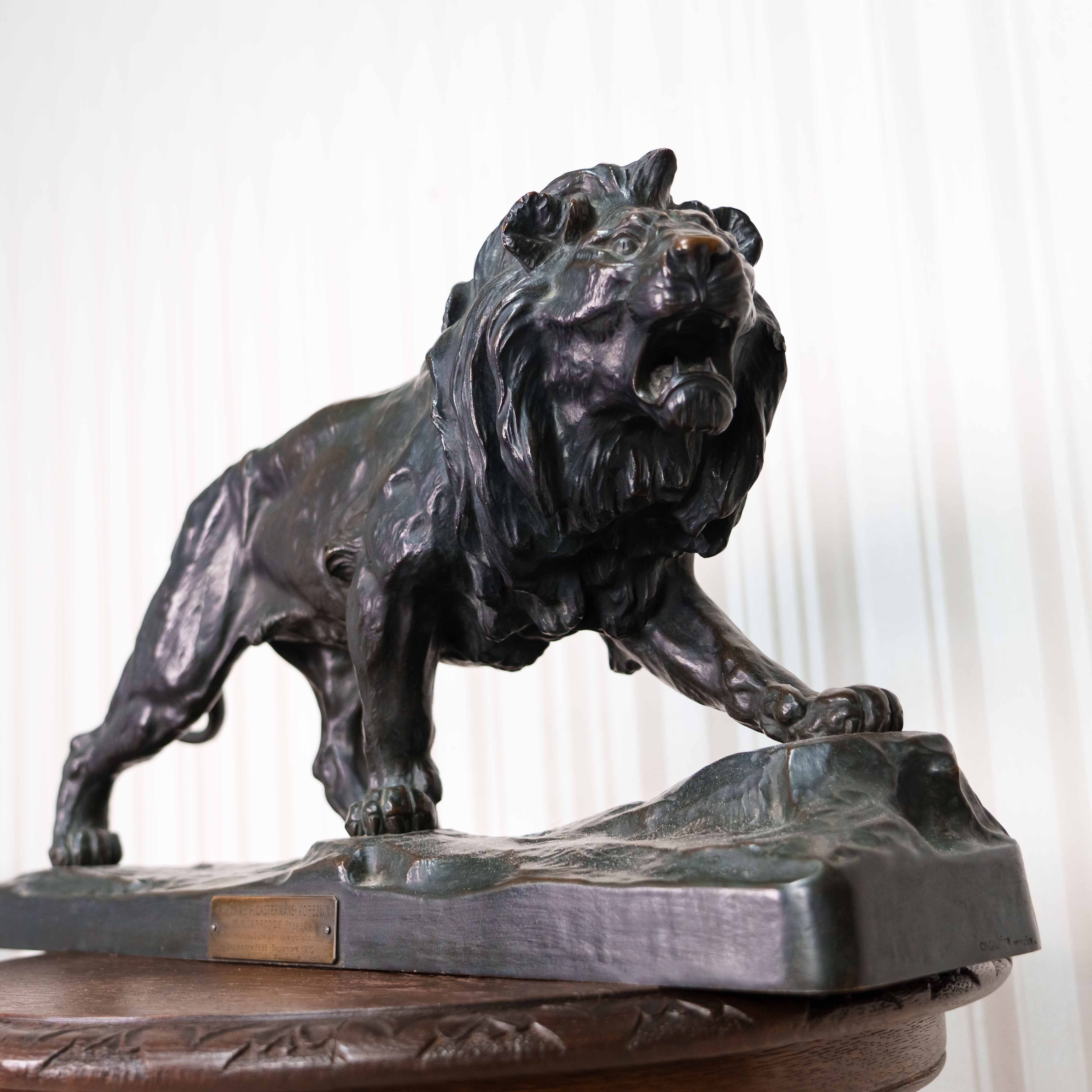 Кабинетная скульптура идущего льва, созданная известным французским скульптором-анималистом Paul Thomas. Лев, как Царь зверей с древности почитался различными народами, как на Западе, так и на Востоке, символизируя власть и достижение высшей цели, в геральдике олицетворяя собой силу, мужество, великодушие, храбрость и отвагу. Лев изображен в движении, создавая ощущение животной силы и целеустремленности. Голова слегка повернута в сторону, взгляд направлен вдаль. Пышная грива, развевающаяся вокруг головы, добавляет образу величая. Тонкая проработка деталей, таких как грива, рельеф мышц и складки на коже, создает реалистичность и подчеркивает анатомическую точность. Особое внимание уделено выразительным элементам, таким как глаза, зубы и когти. Скульптор демонстрирует глубокое знание анатомии и поведения львов. На прямоугольном постаменте имеется факсимиле автора — P. Thomas, так же имеется клеймо литейной мастерской Ch. Gautier.