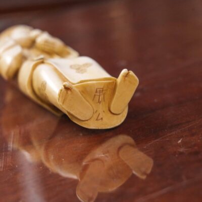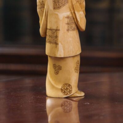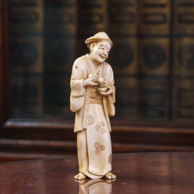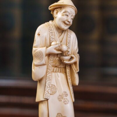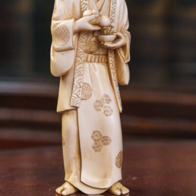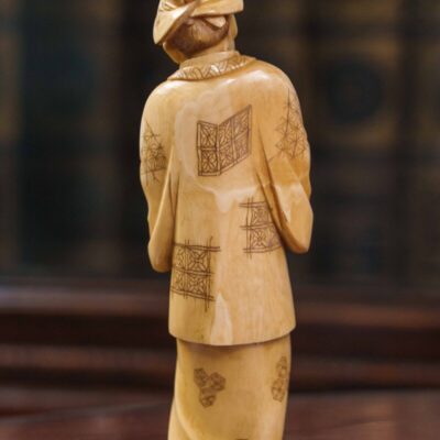 Изысканная фарфоровая композиция представляет собой сцену из «Ромео и Джульетты», легендарной трагедии Уильяма Шекспира. Композиция изображает один из знаковых моментов пьесы — сцену на балконе, где Ромео, преисполненный любви, преклоняет колено перед Джульеттой. Джульетта стоит на балконе, опираясь на резные перила. Она облачена в элегантное платье розовых и зеленых оттенков с пышными рукавами. Ее длинные волосы заплетены в косы, а лицо отражает нежность и волнение. Ромео протягивает руки к своей возлюбленной. Он одет в кремовый камзол с золотыми элементами и длинный синий плащ, ниспадающий на спину. Его поза и взгляд передают страсть и преданность. Уильям Шекспир, изображенный как третий персонаж, сидит внизу, наблюдая за сценой. В его руках свиток с текстом пьесы, символизирующий его роль как создателя и летописца этой великой истории любви. Шекспир словно фиксирует момент на бумаге, придавая композиции глубокий философский смысл: он не просто автор, но и свидетель судьбы своих героев, а искусство воплощает жизнь. Композиция проработана с высокой степенью реализма – каждая складка одежды, каждое выражение лица передано с вниманием к деталям. На основании имеется фирменная марка фарфоровой мануфактуры Capodimonte.