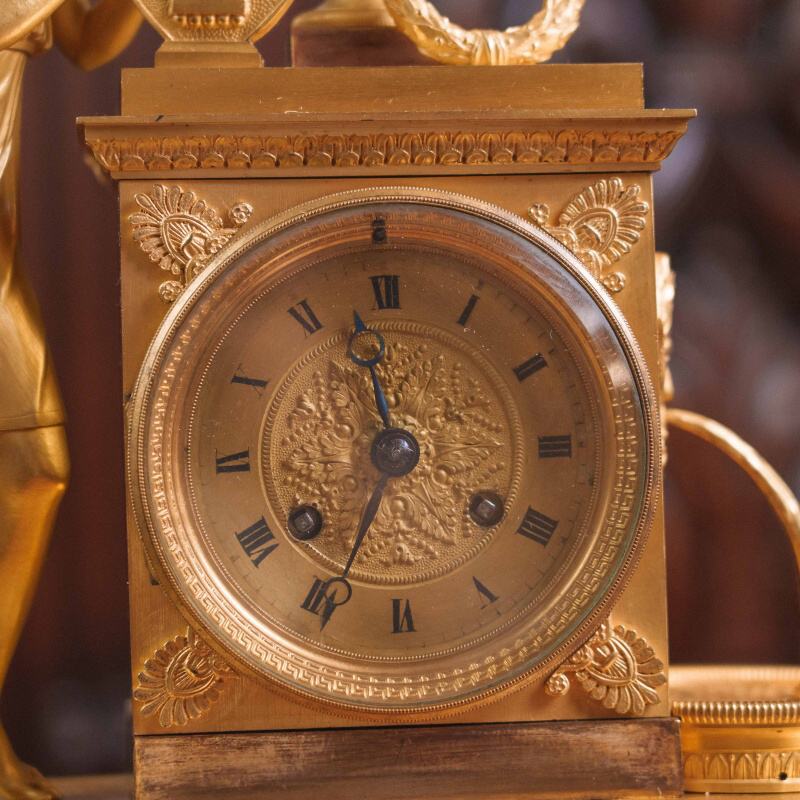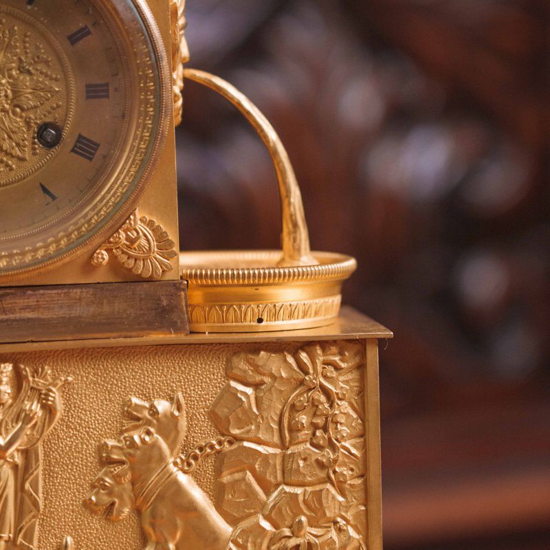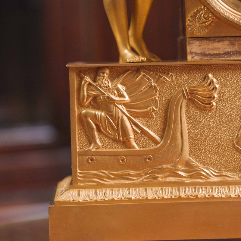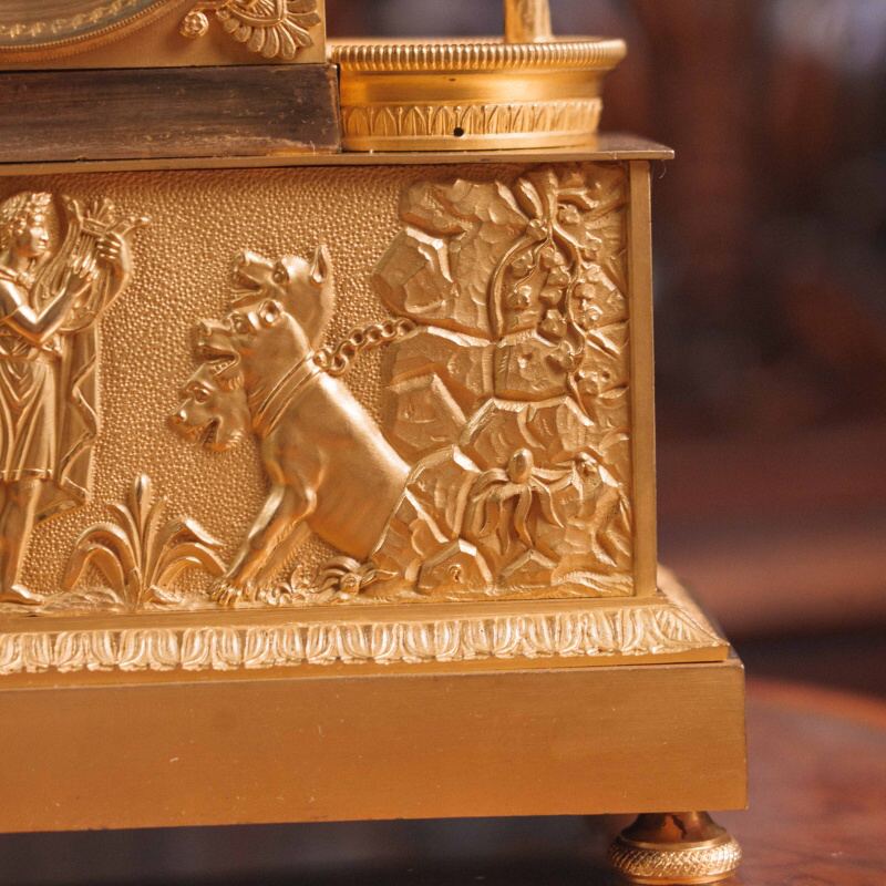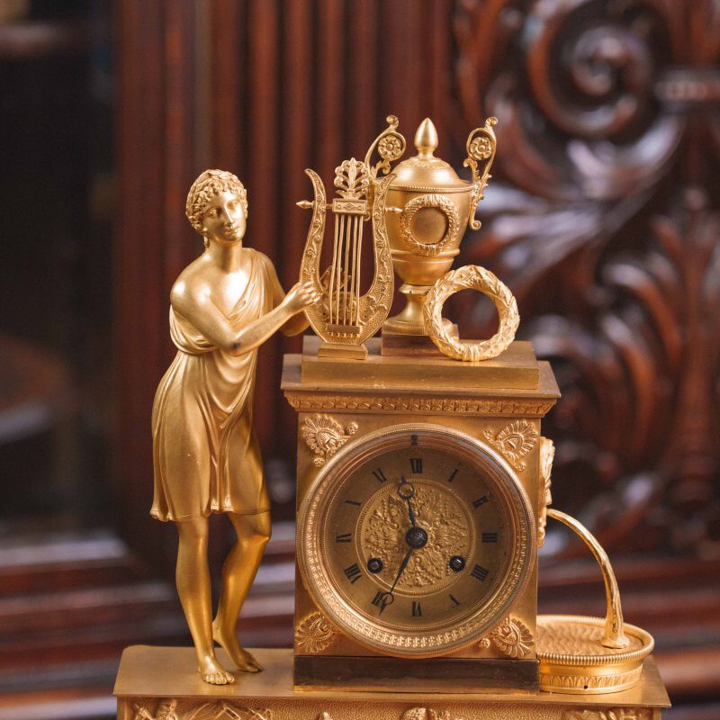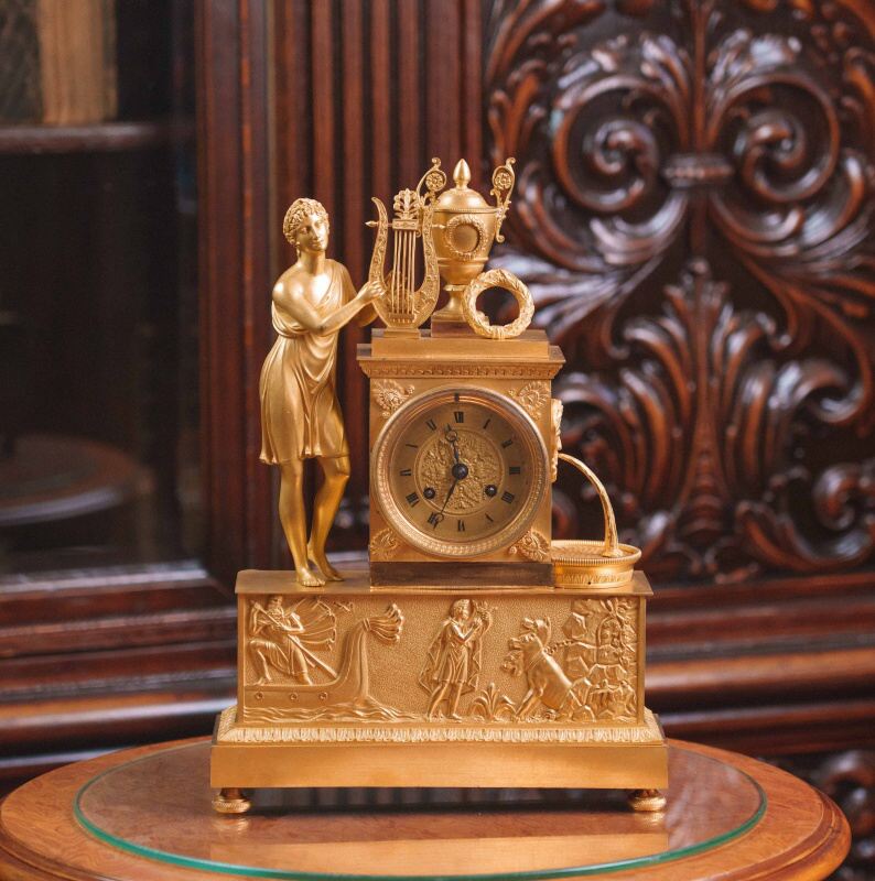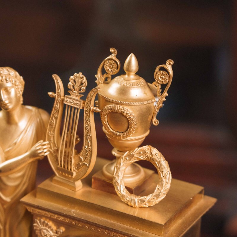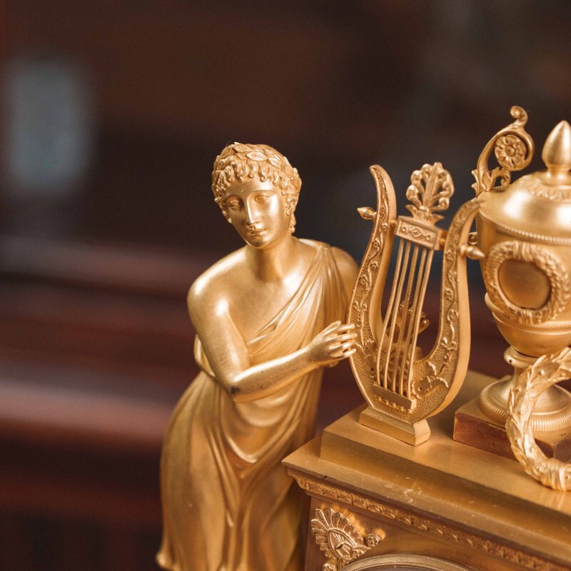 Эти кабинетные часы являются прекрасным образцом французского ампира. Корпус украшен богатыми рельефами с различными античными сценами. Верхнюю часть композиции украшает изящная фигура девушки в античном хитоне, опирающей руку на лиру — один из главных символов музыки, искусства и гармонии. Скульптура выполнена с высокой точностью: тщательно переданы пропорции тела, мягкие складки ткани и плавная линия силуэта, что придаёт образу благородную изысканность.