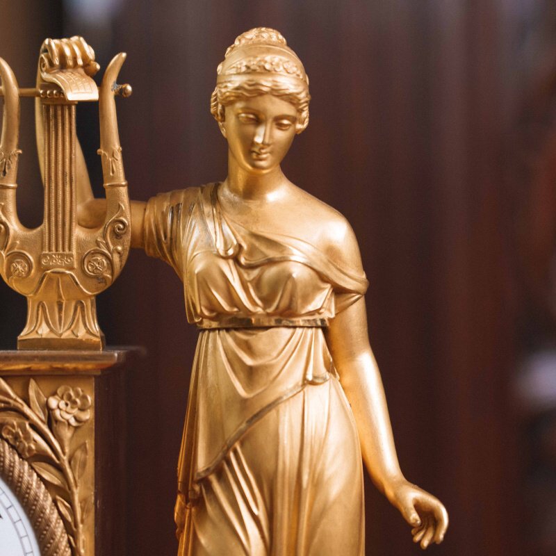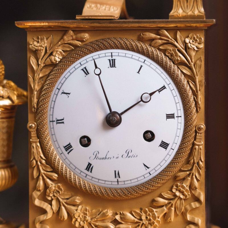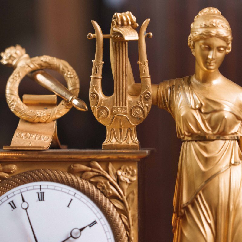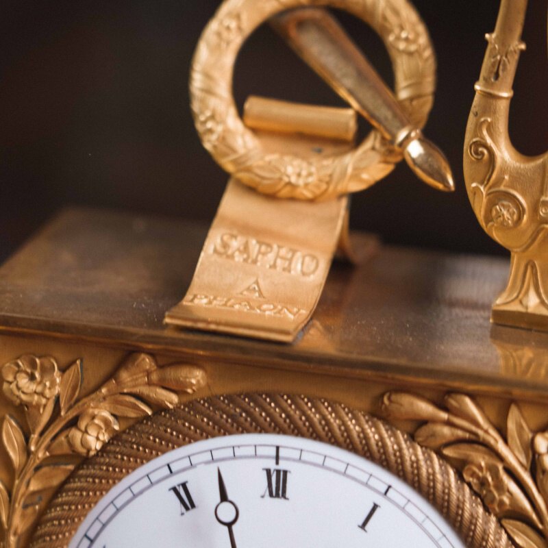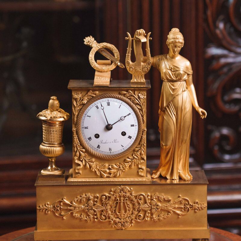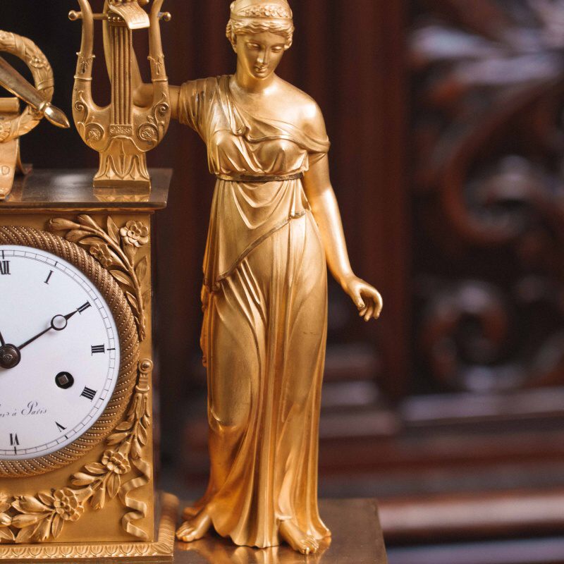 Эти кабинетные часы являются прекрасным образцом французского ампира. Корпус украшен богатыми рельефами с акантовыми листьями, лирами и победными атрибутами, характерными для художественной программы начала XIX века, где античные мотивы служили символом величия, порядка и культурного преемственности.