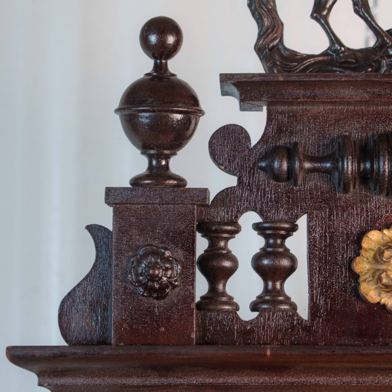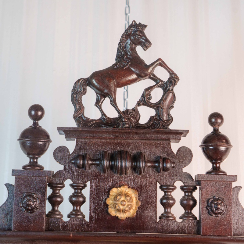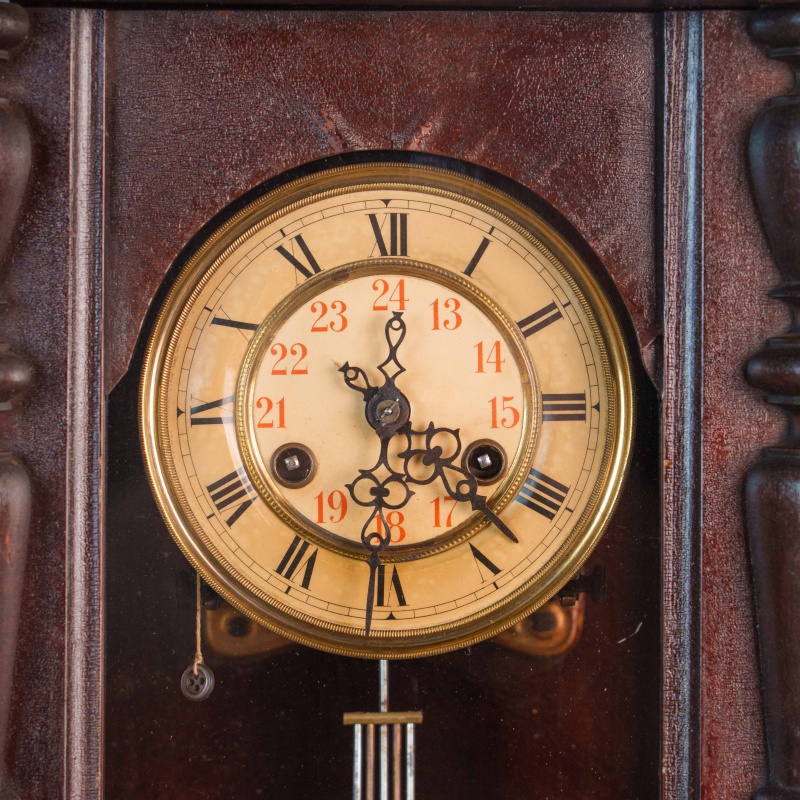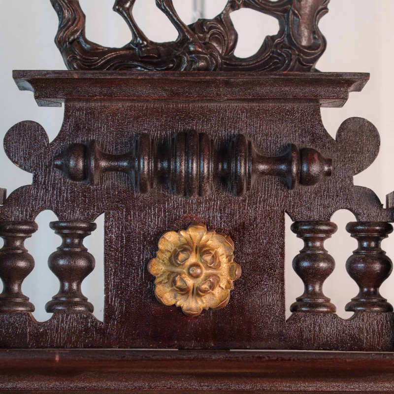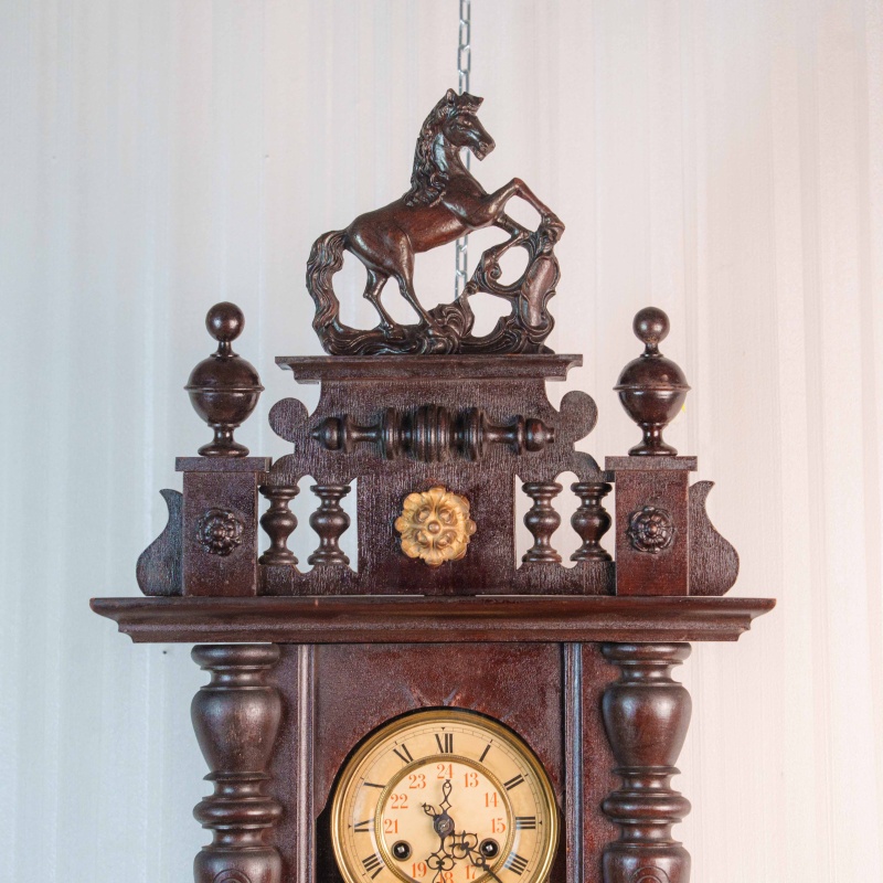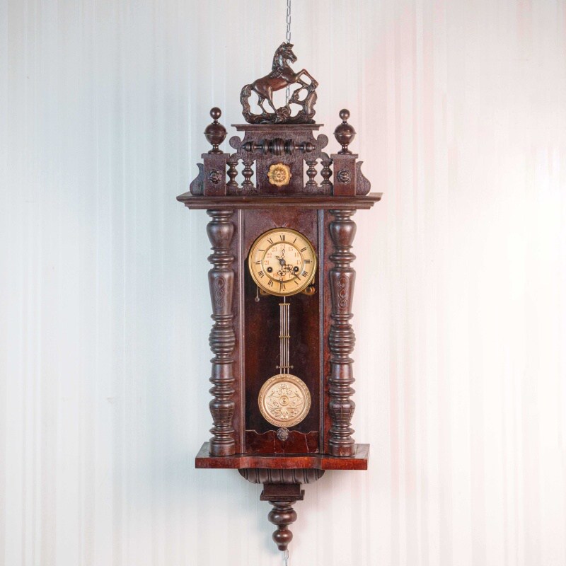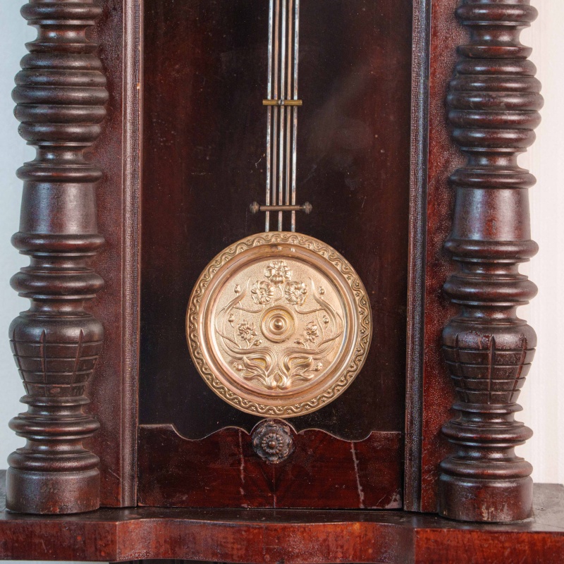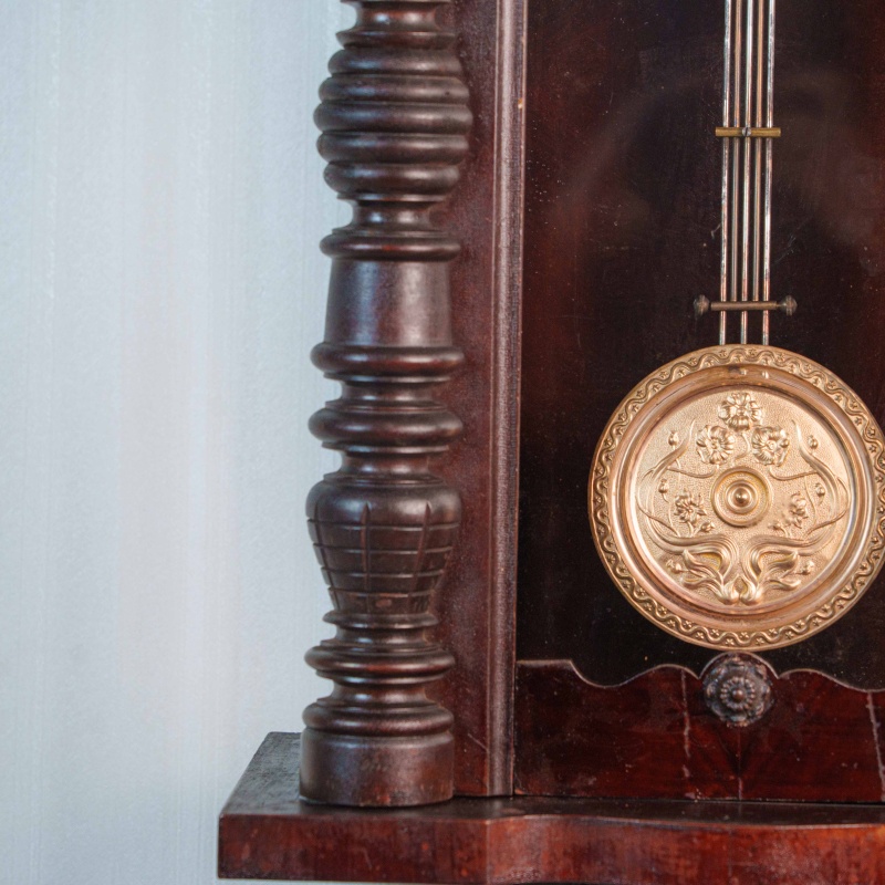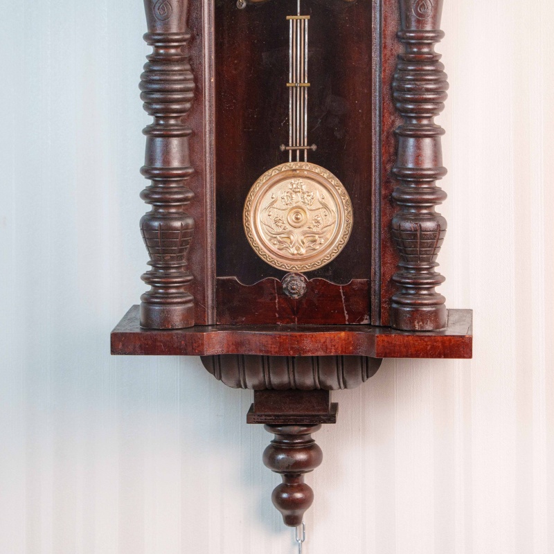 Настенные часы с часовым, и получасовым боем в корпусе необычной формы. Декоративное оформление представлено многоуровневыми полуколоннами сложной формы. Латунный циферблат с арабскими цифрами великолепно сочетается с двумя ажурными стрелками. На задней стенке механизма имеется клеймо часовой мастерской FMS.