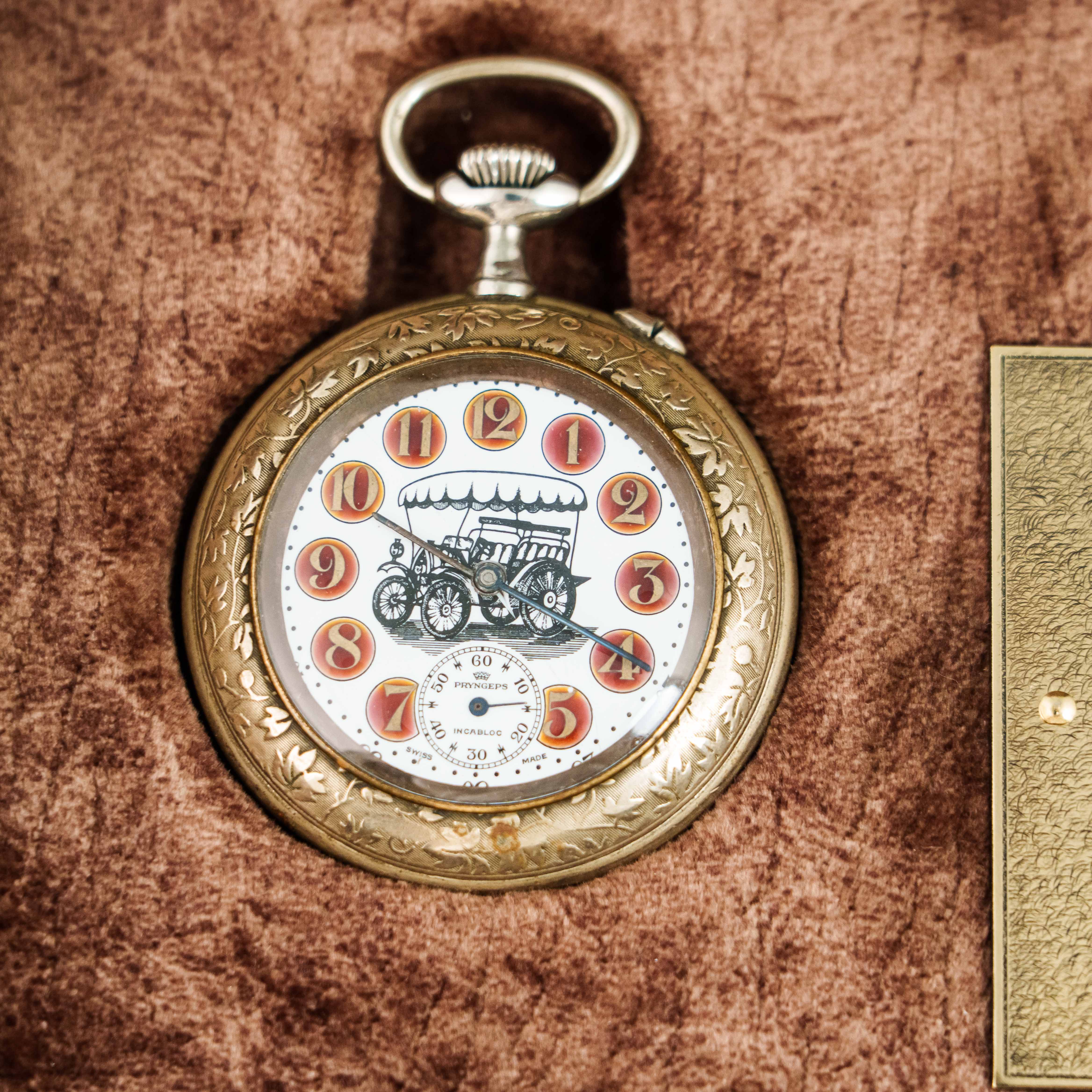 Циферблат отличается редким и эффектным оформлением: эмалевые цифры с тёплым градиентом, изящные ажурные стрелки и художественное изображение старинного автомобиля — символа эпохи технического прогресса начала XX века. Малая секундная стрелка расположена в традиционном положении на «6 часах».