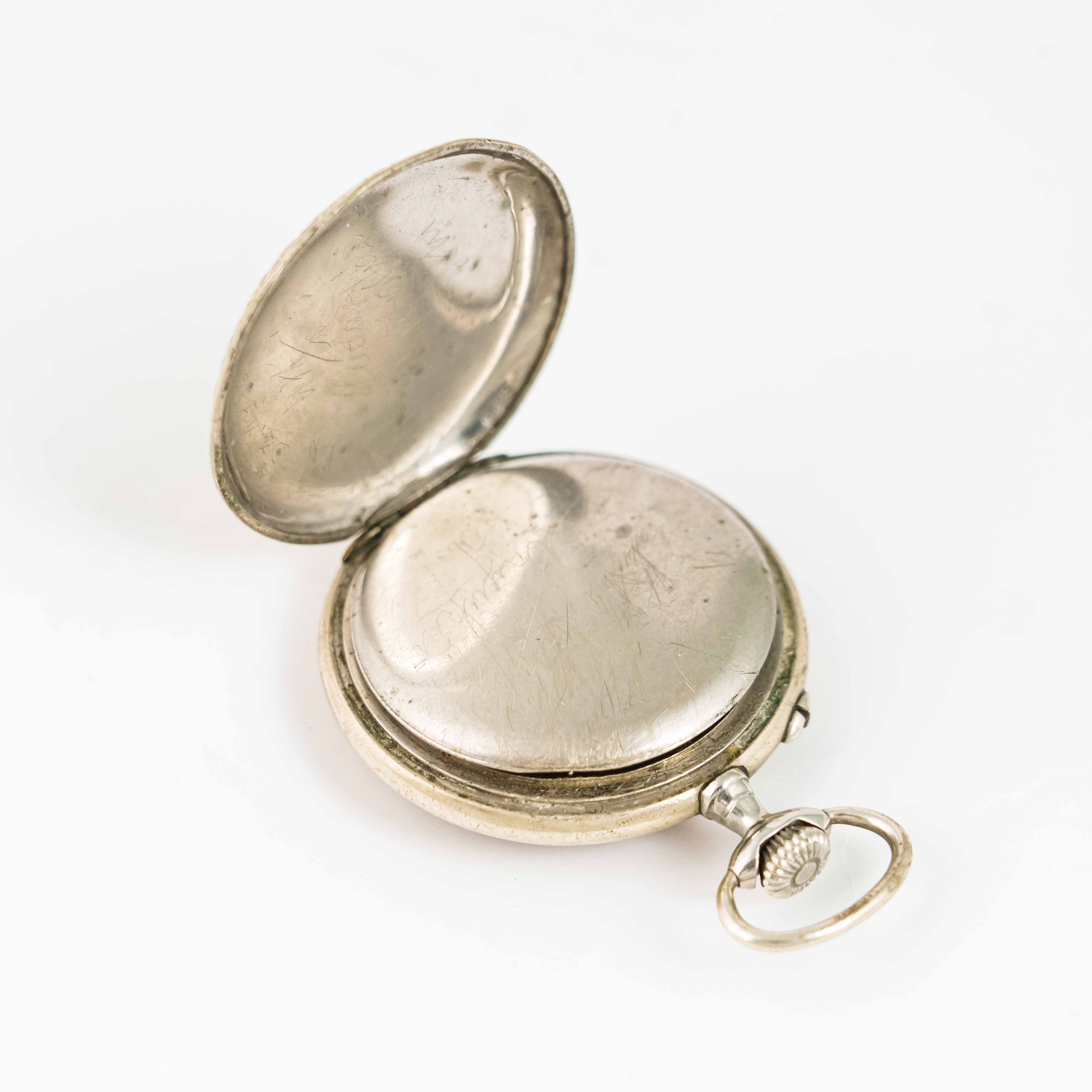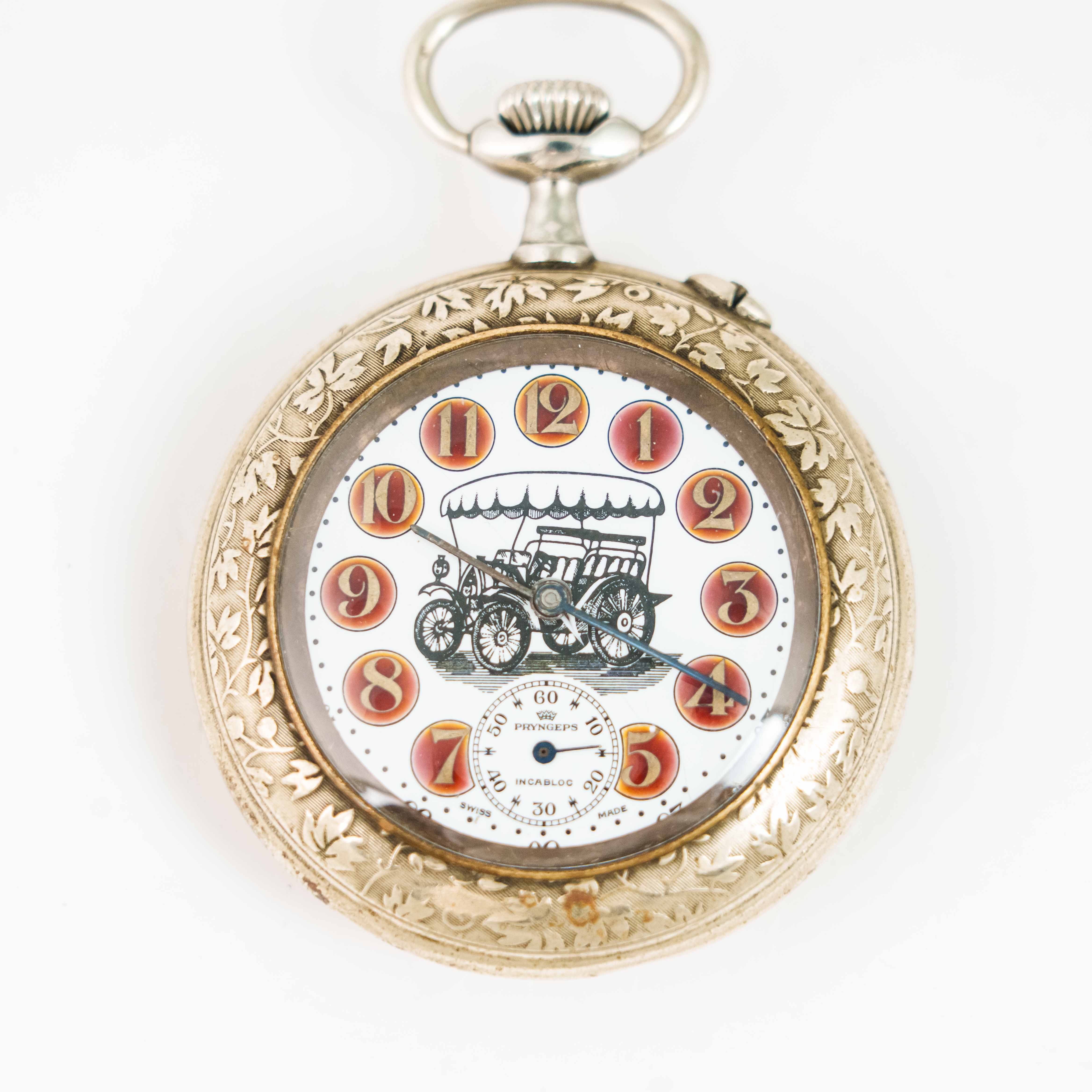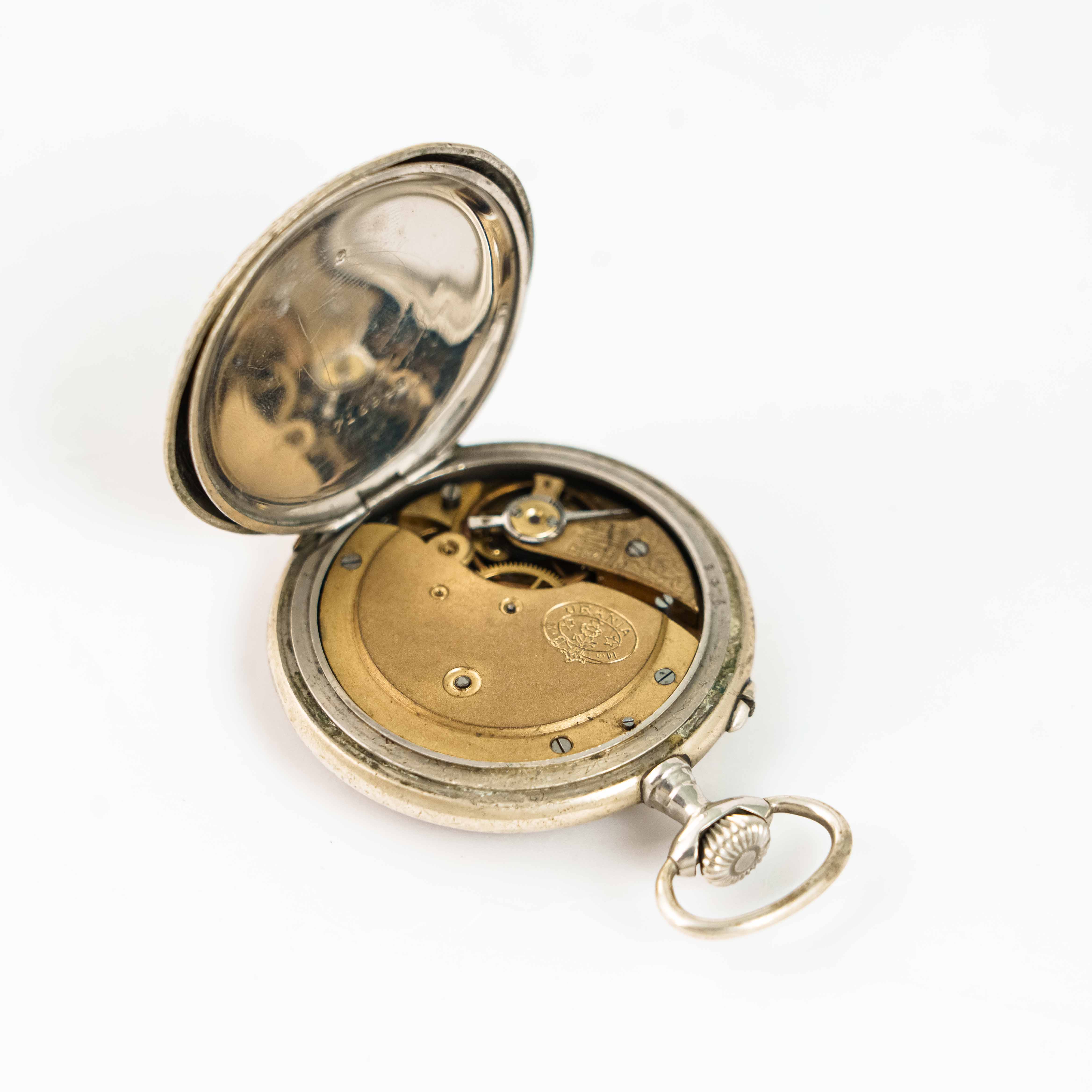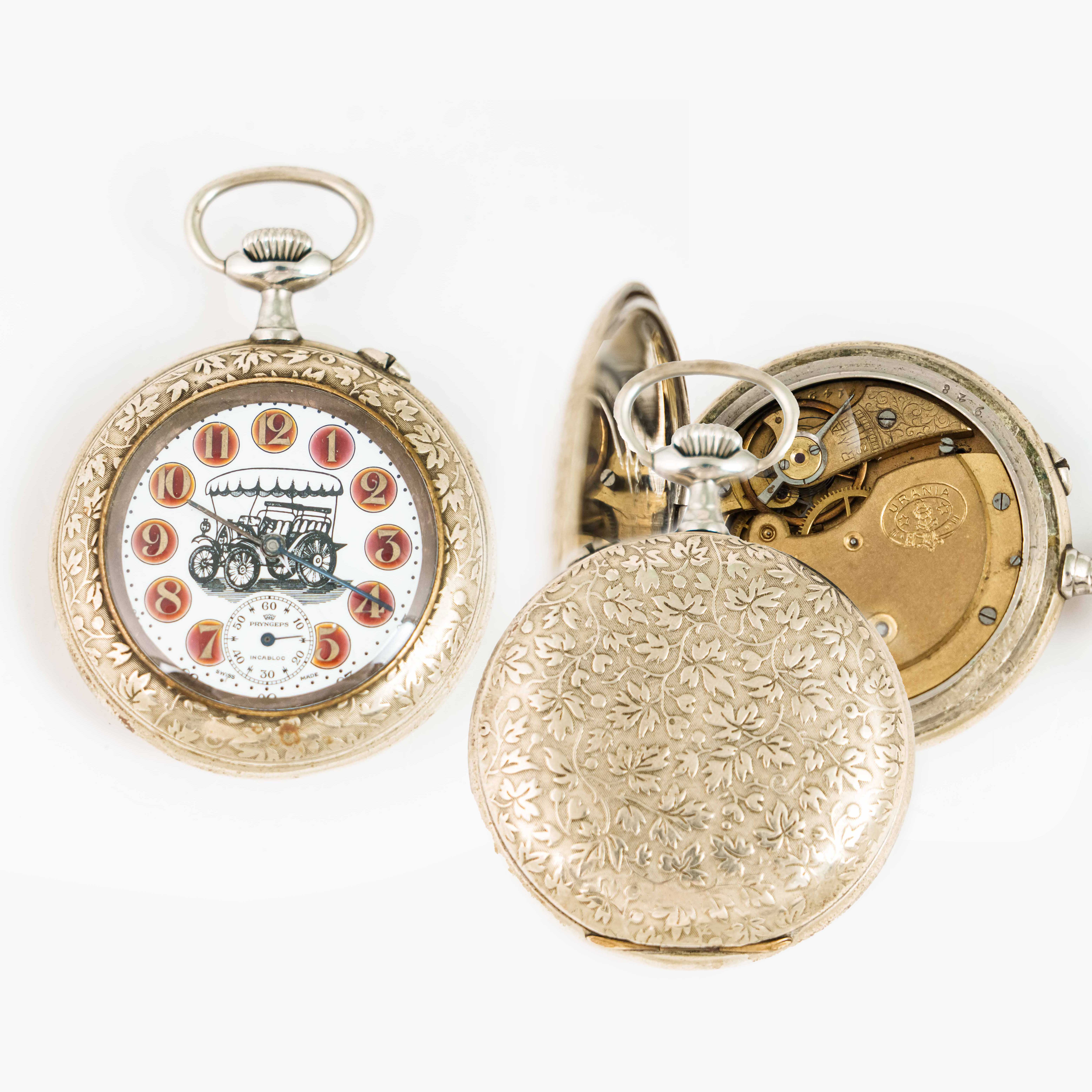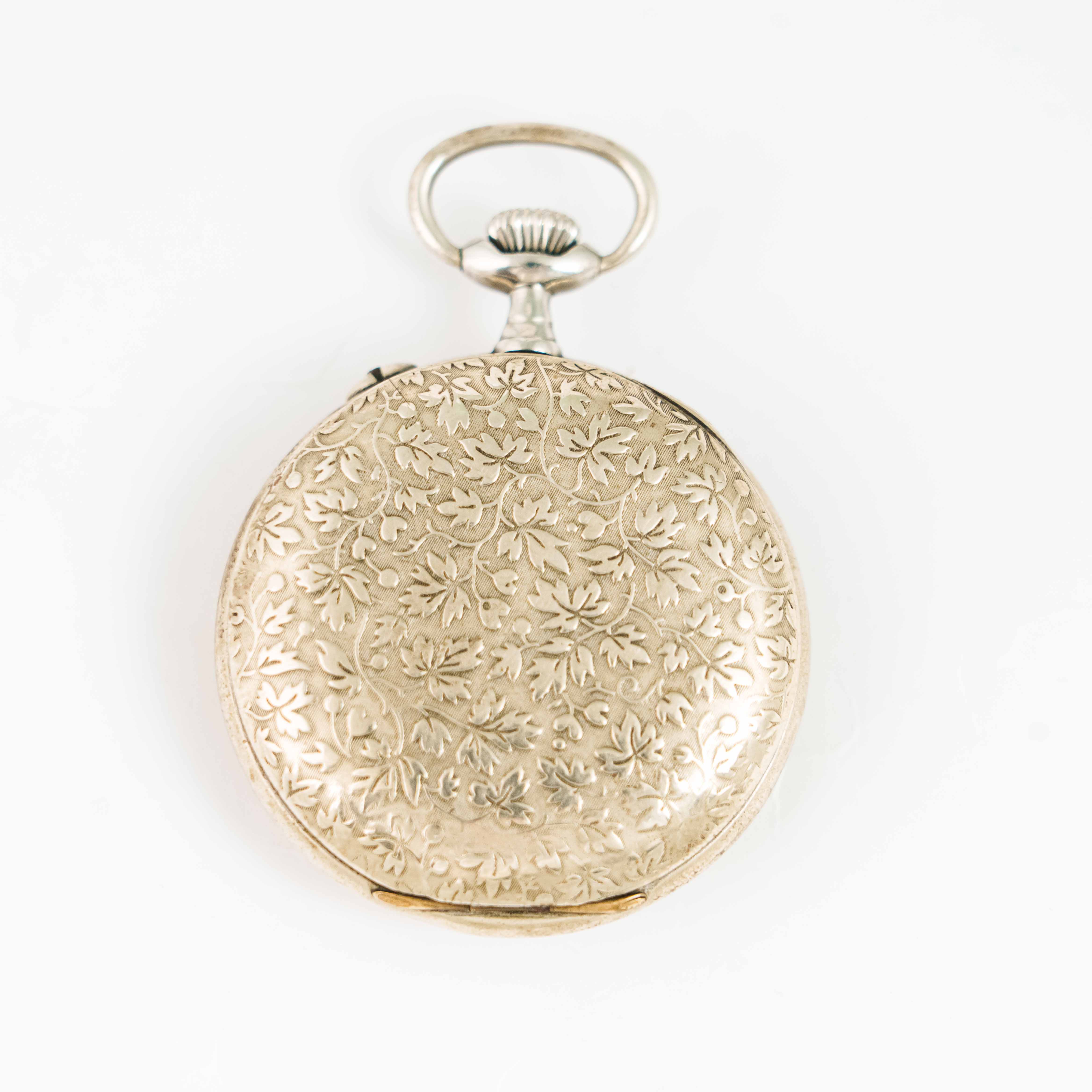 Посеребрённый корпус часов полностью украшен тонкой растительной гравировкой, выполненной с высоким уровнем мастерства. Орнамент придаёт корпусу глубину и выразительность, подчёркивая статус классического швейцарского изделия своего времени.