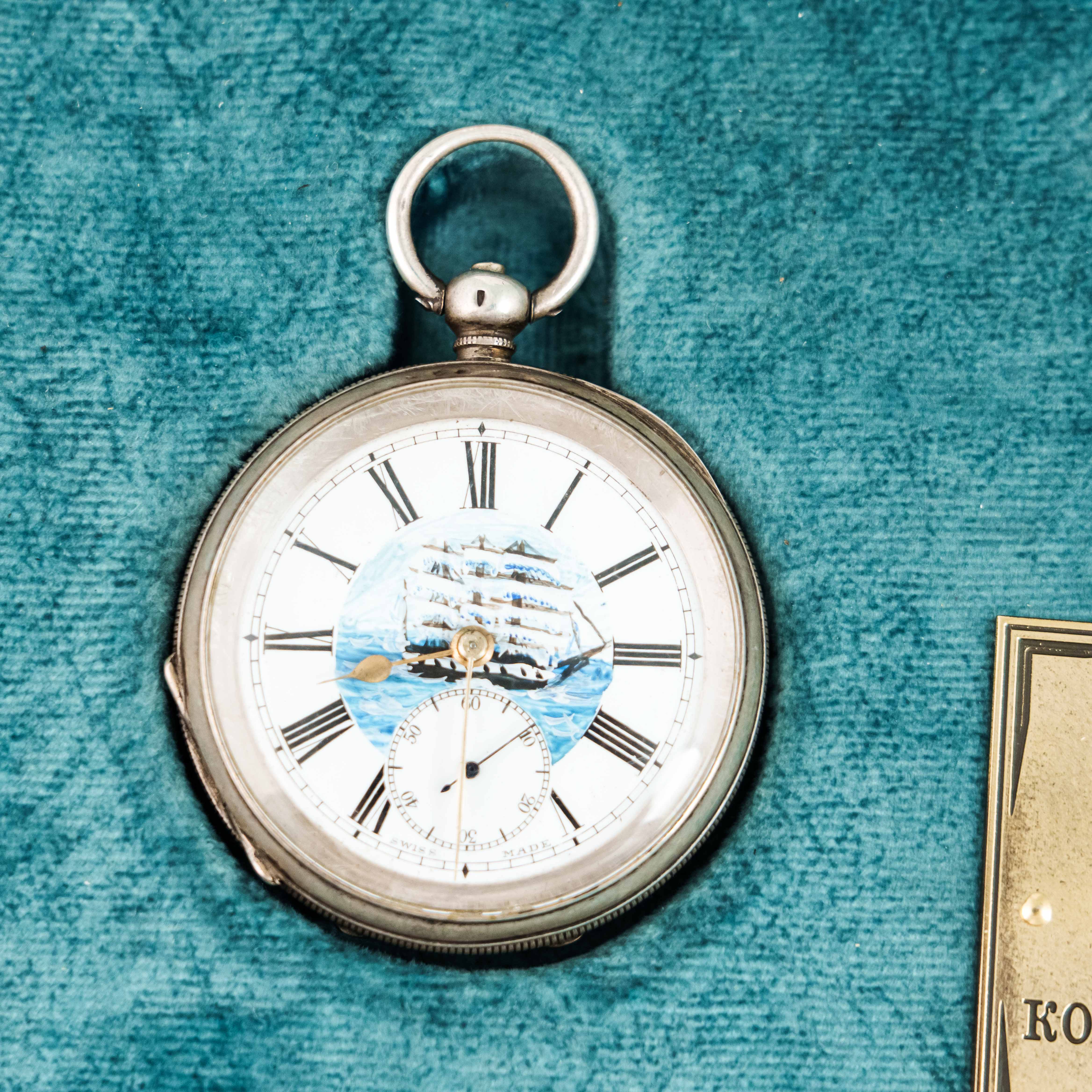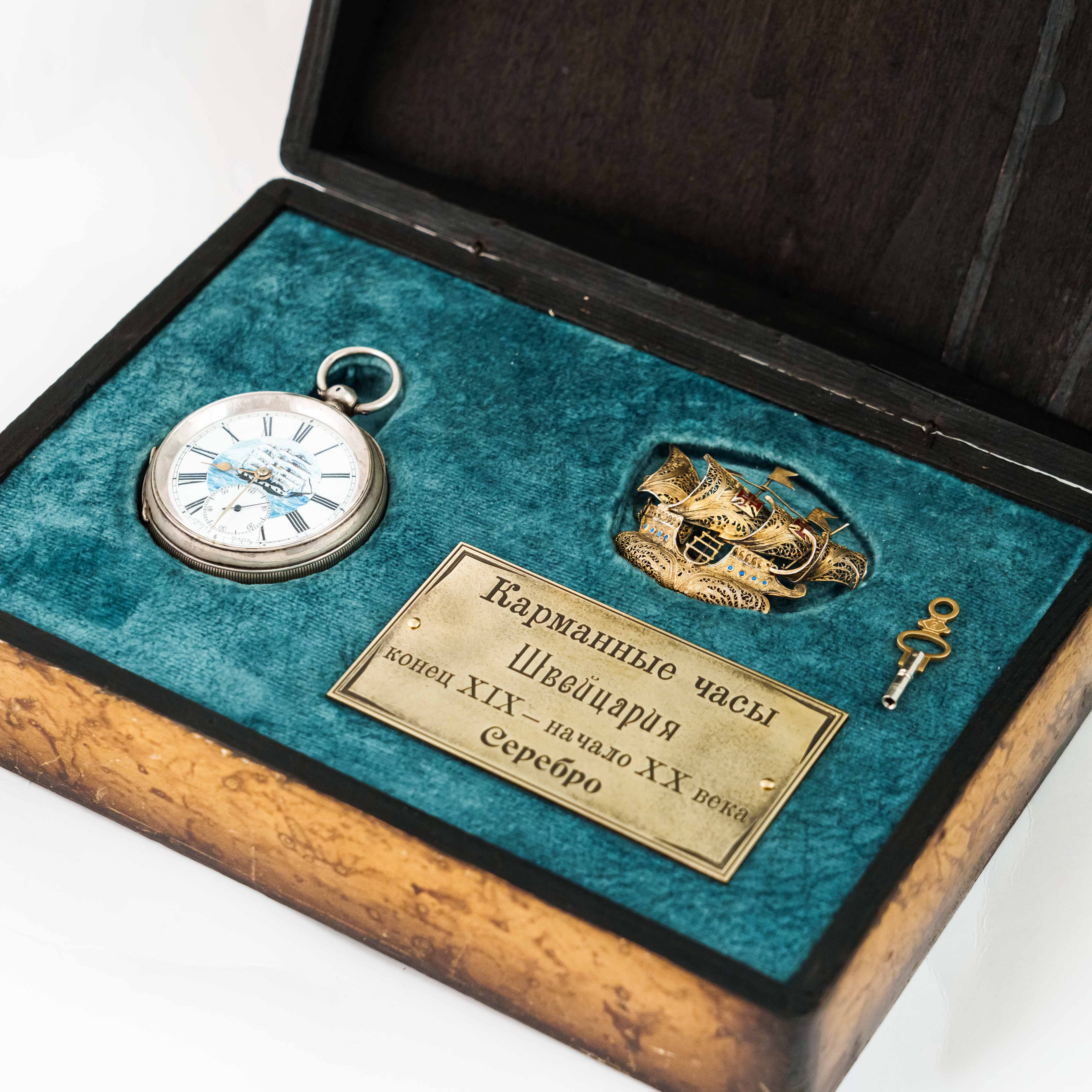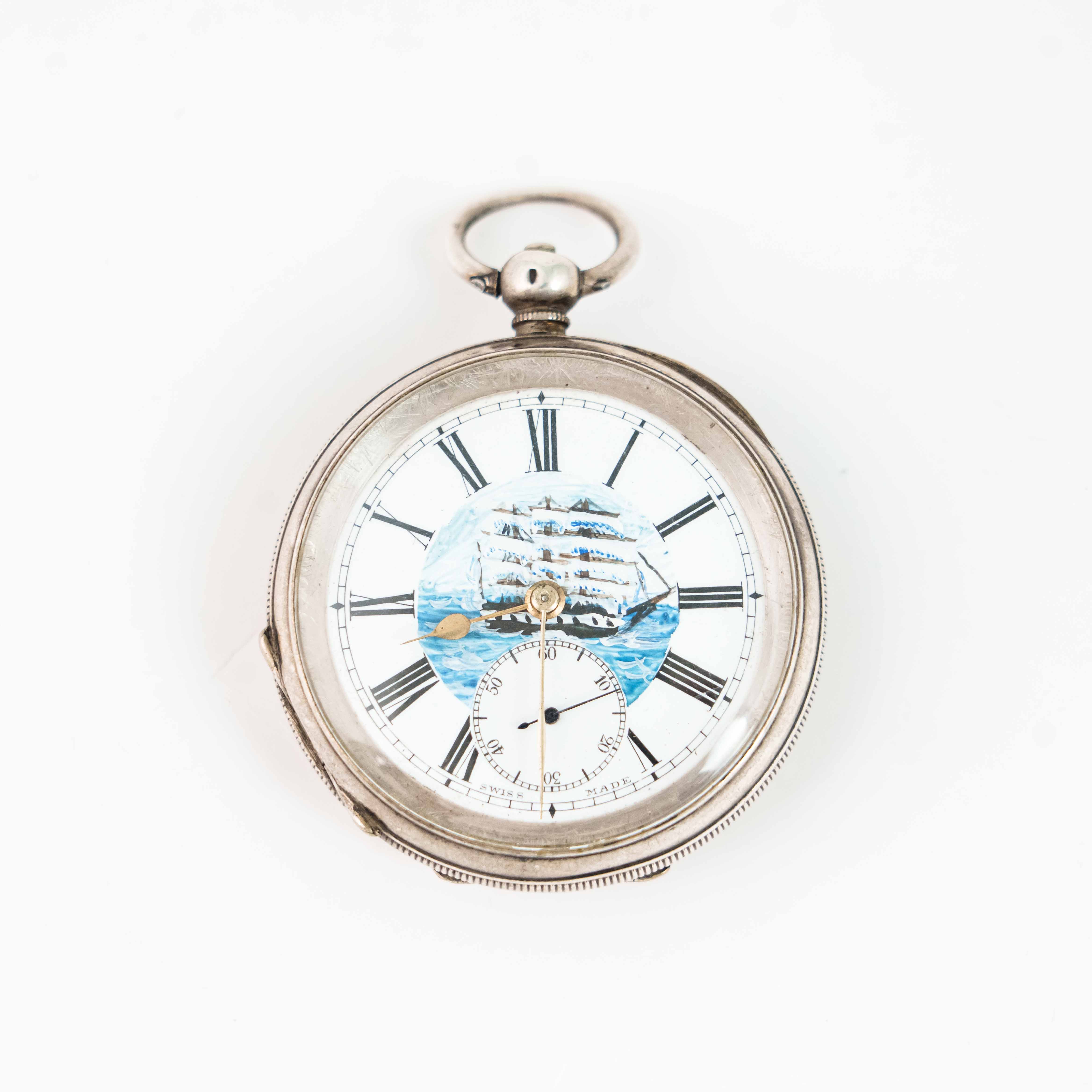 Невероятно красивые карманные часы с Парусником на циферблате. Белый циферблат с латунными стрелками и с черными римскими цифрами для обозначения часов (I-XII), малая секунда в положении цифры 6.. Исполненные на высочайшем уровне, карманные часы сочетают в себе элементы стиля XIX века. Корпус выполнен из серебра 935 пробы. Механизм на ключевом заводе со швейцарским анкерным ходом на рубиновых камнях. Подобные часы датируются концом XIX — началом XX века (примерно 1880–1920-е годы).
