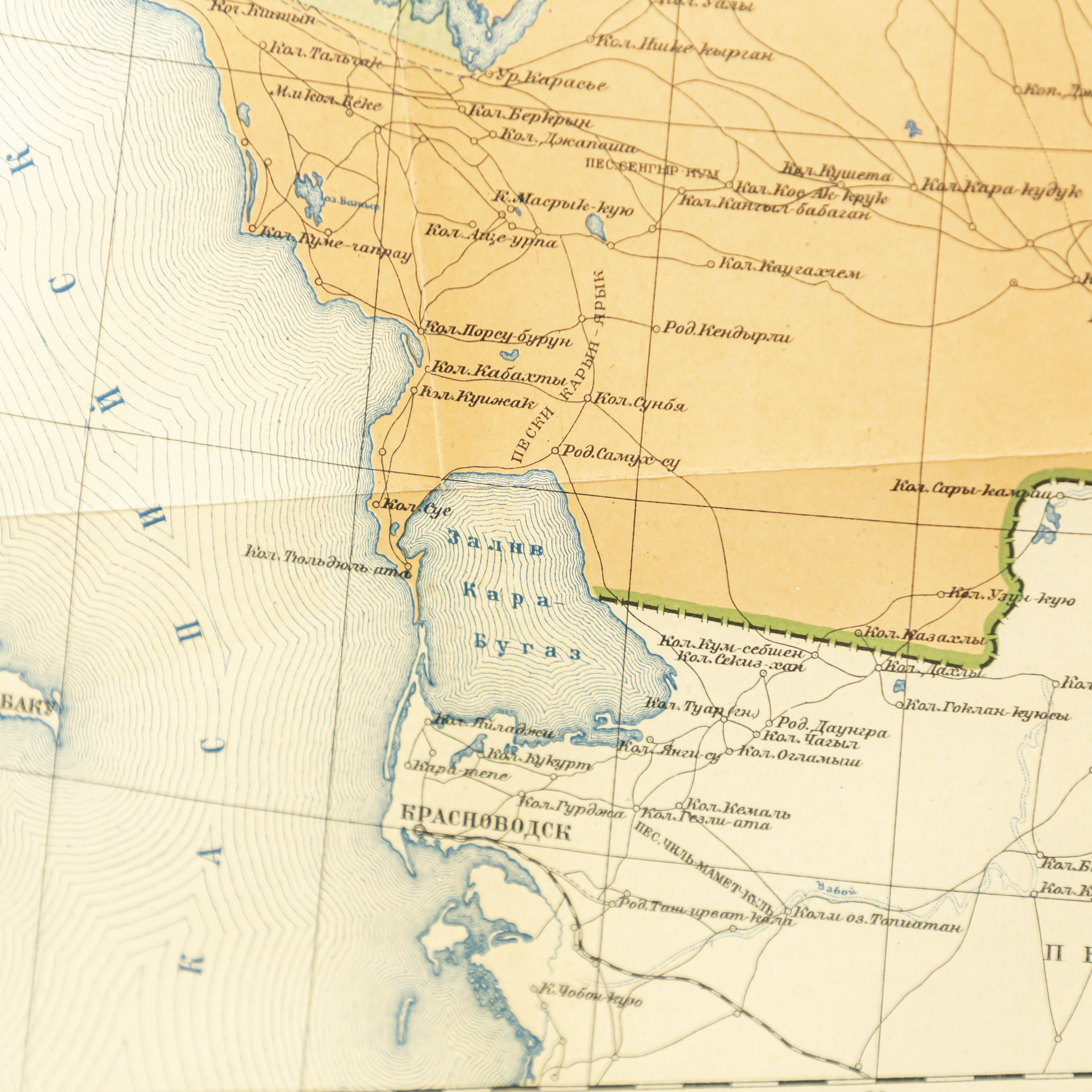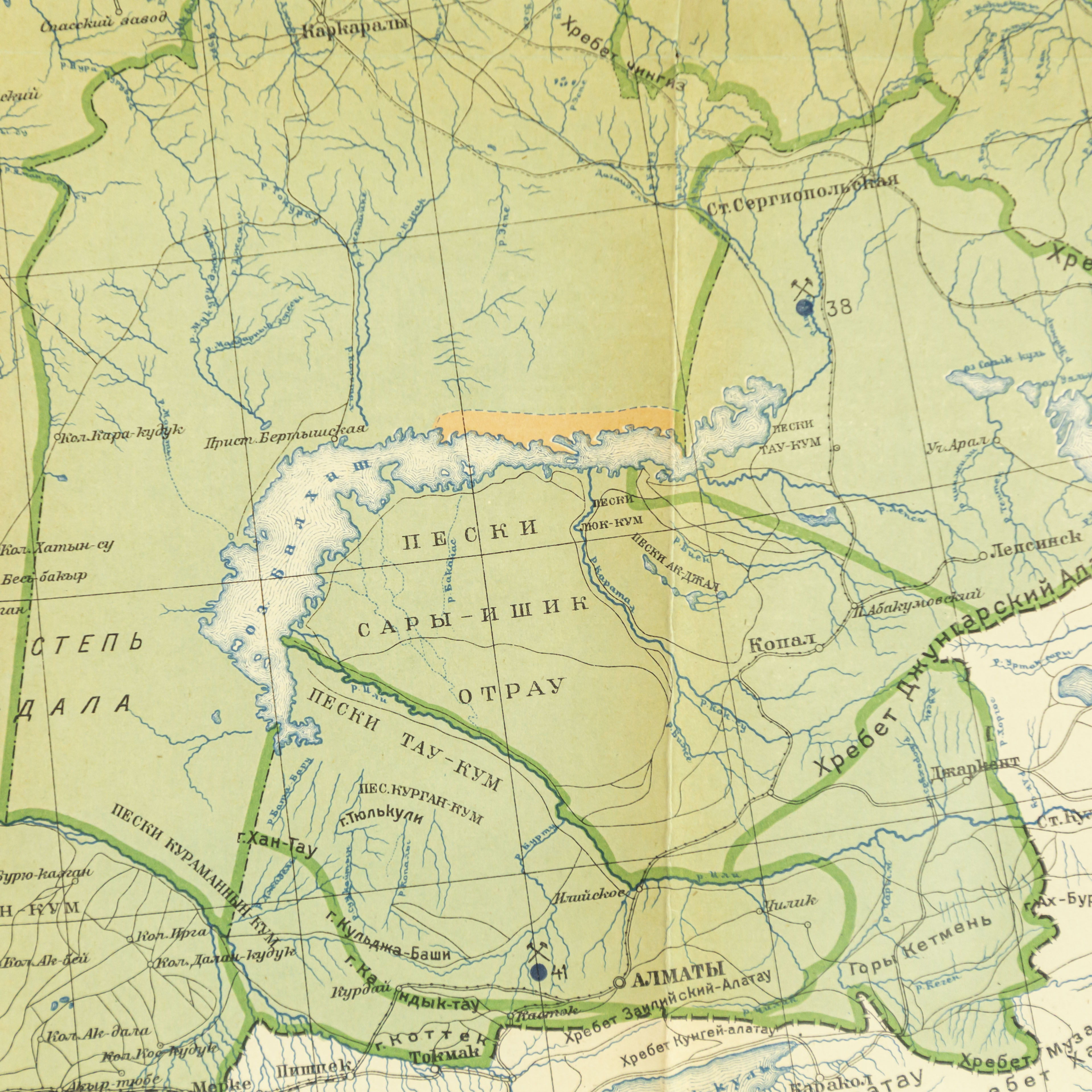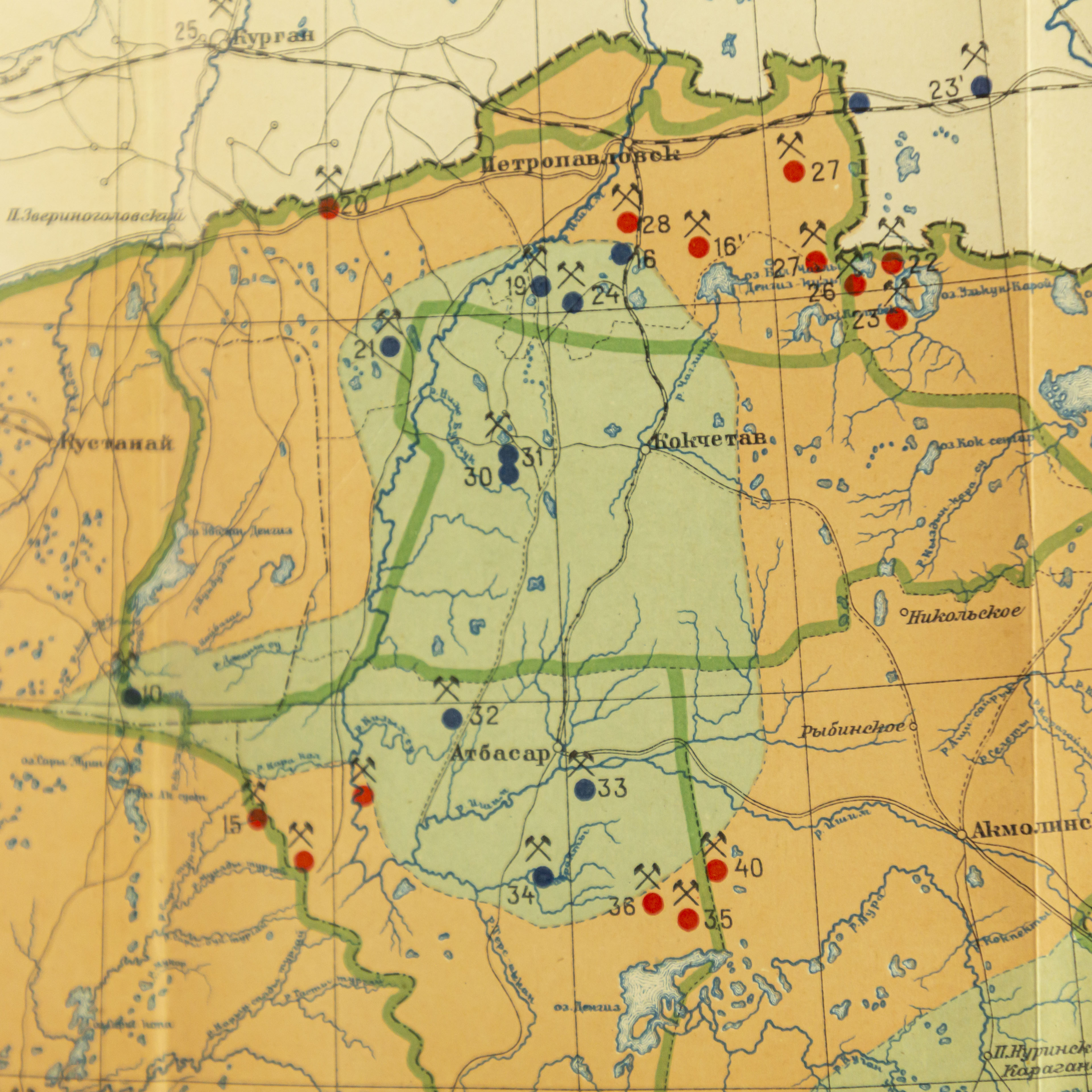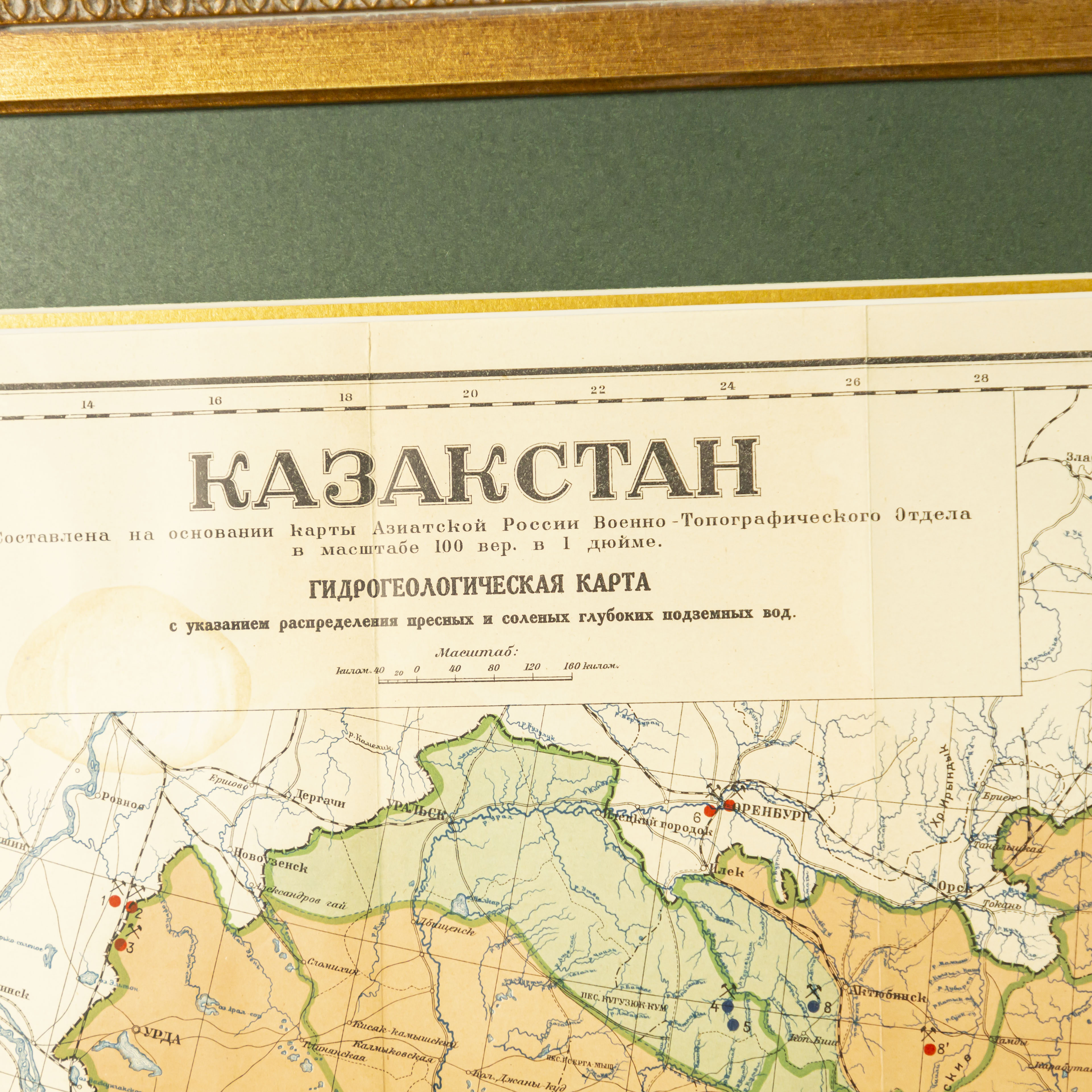 Карта охватывает всю территорию Казахстана в административных границах на момент составления карты, включая западные районы (Гурьев, Уральск, Прикаспий), центральные и северные области (Петропавловск, Акмолинск, Кокчетав), южные регионы (Чимкент, Туркестан, Сырдарья), а также восточные и юго-восточные земли (Семипалатинск, Зайсан, Верный(Алматы). Гидрогеологическая карта Казахстана, составленная А. А. Козыревым на основе карты дореволюционной карты Военно-Топографического отдела (масштаб 1:5 000 000. Настоящая карта представляет собой обобщённый обзор гидрогеологических условий территории Казахстана и включает указание распространения водоносных горизонтов, глубины залегания подземных вод, месторасположения скважин и источников. На карте дифференцированы районы распространения артезианских и грунтовых вод: зоны артезианских вод обозначены зелёным цветом, тогда как районы преобладания грунтовых вод выделены коричневым. Также нанесены условные обозначения, отражающие места бурения скважин — красными кружками отмечены скважины с артезианской водой, синими — скважины с грунтовой водой. Дополнительно показаны границы между гидрогеологическими районами по характеру водоносных горизонтов. Карта составлена с целью комплексного отражения гидрогеологических условий территории Казахстана, выявления пространственного распределения водоносных горизонтов, глубин залегания подземных вод и мест их естественного и искусственного выхода на поверхность. Она предназначена для использования в научных исследованиях, инженерной геологии, планировании водоснабжения, сельского хозяйства и развития инфраструктуры.