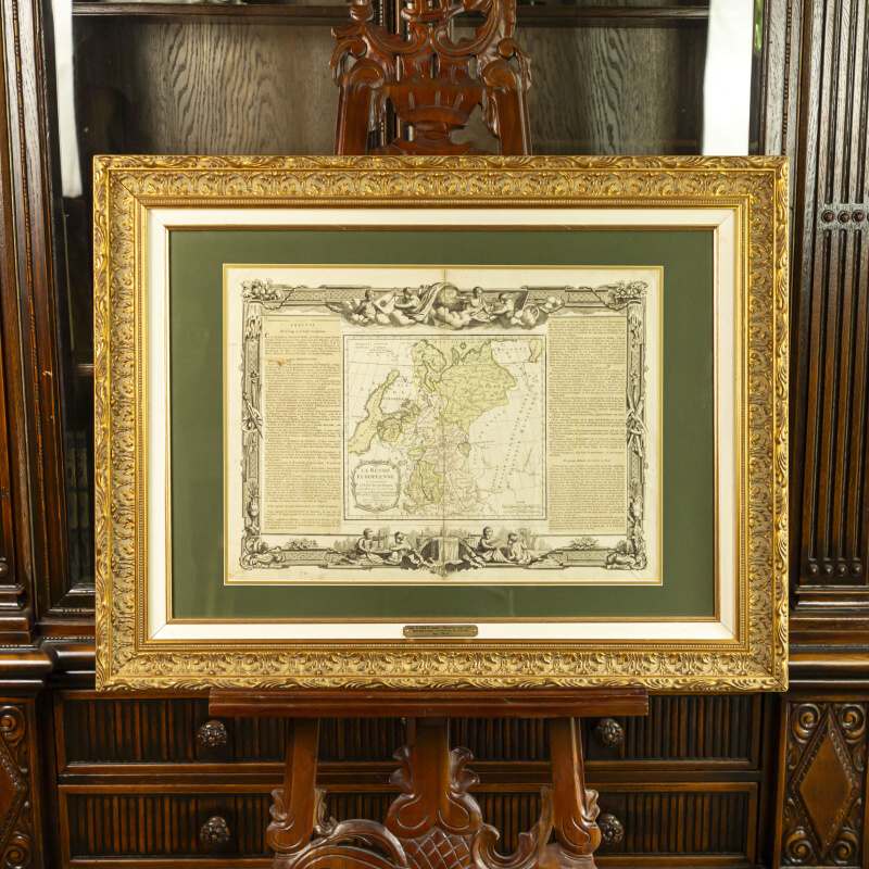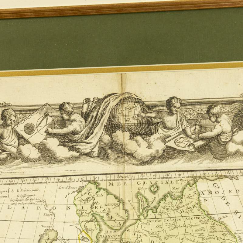 Особенностью карты является великолепная гравированная рамка с элементами классического стиля: верхняя часть украшена изображениями четырех амуров с трубами и картами – символы Гениев Наук и Искусств; нижняя часть – сценами с фигурами в античных одеждах олицетворения наук (истории и географии).