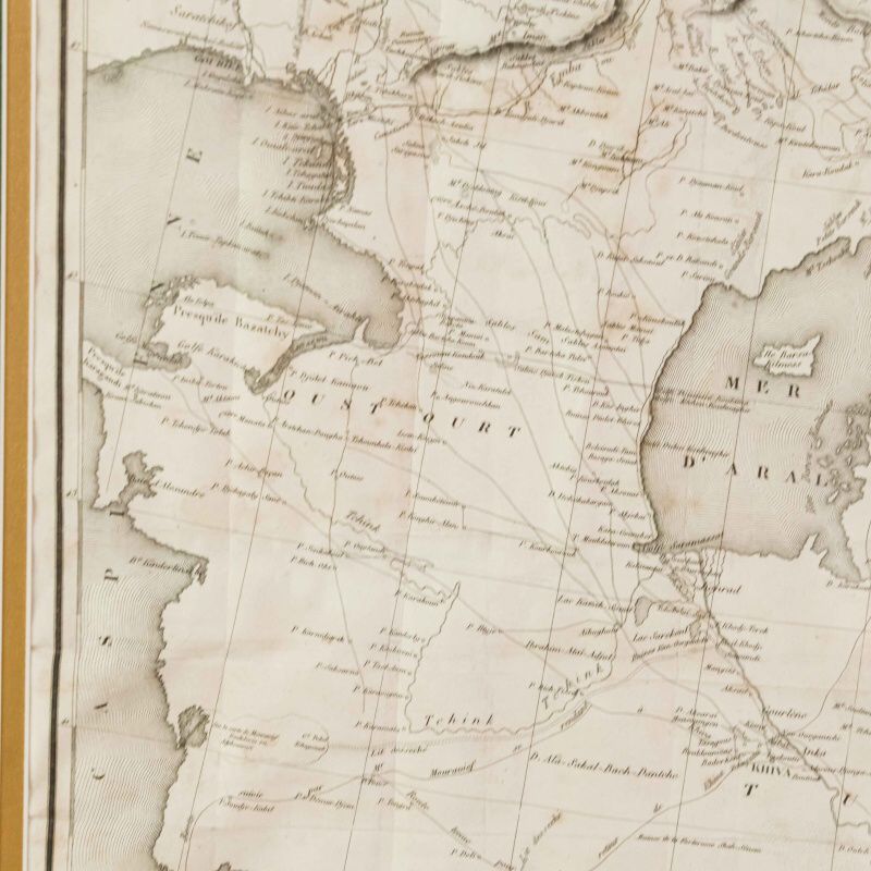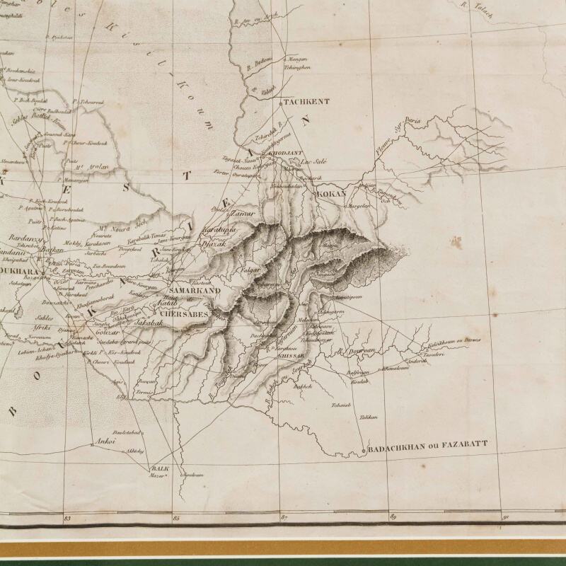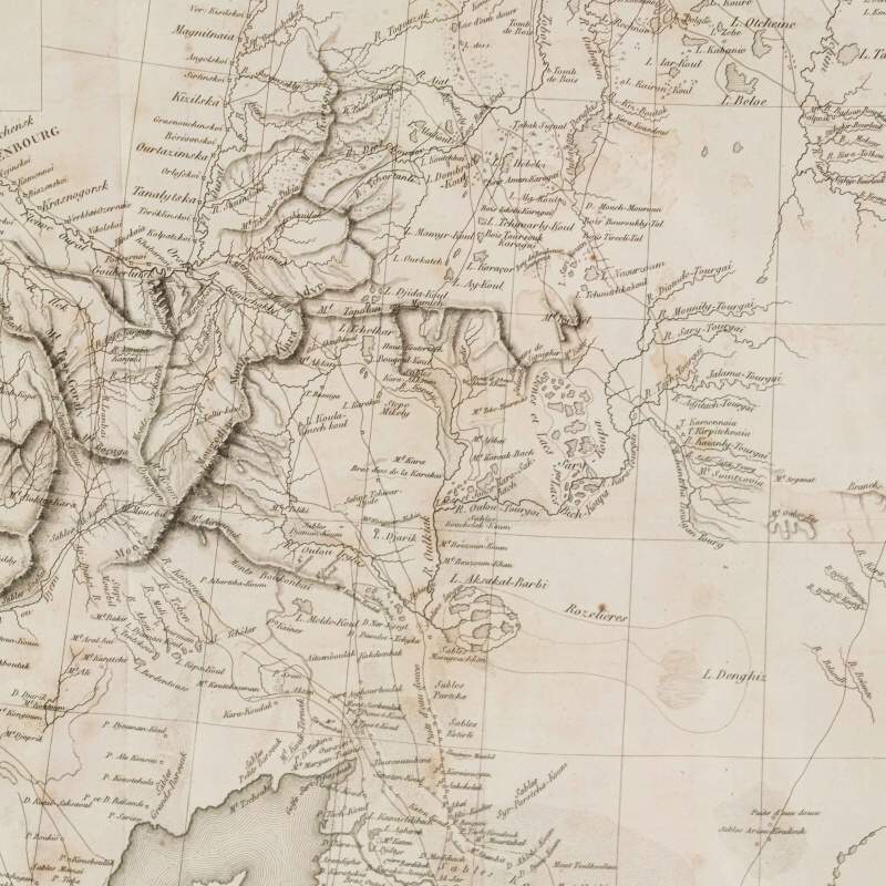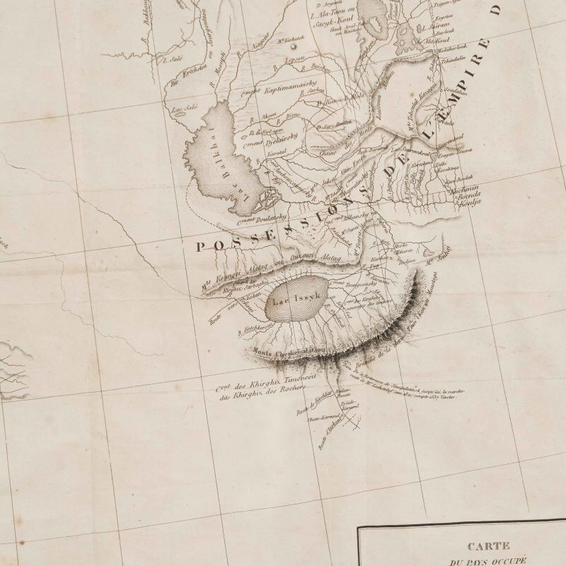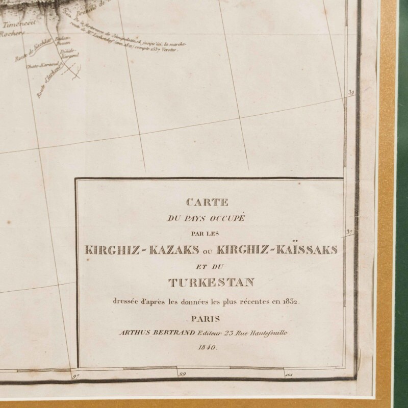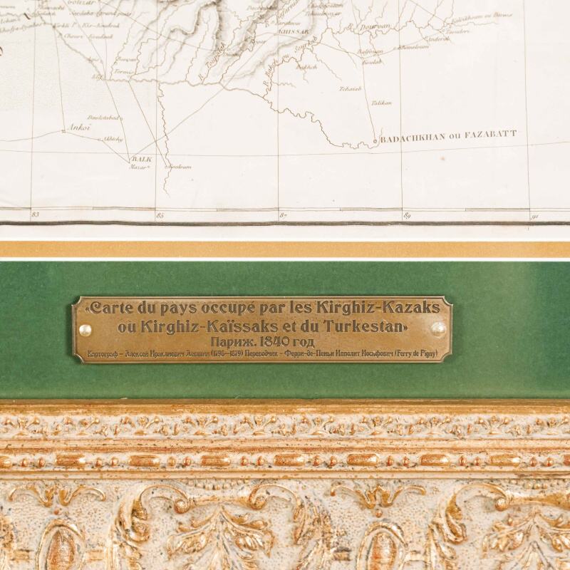 Данная карта представляет собой этнографо-географическое изображение территорий Центральной Азии, заселённых казахами, а также части Туркестана. Она была составлена по наиболее актуальным на тот момент данным, собранным к 1832 году. Карта является приложением к фундаментальному труду российского исследователя Алексея Лёвшина «Описание киргиз-казачьих, или киргиз-кайсацких орд и степей» (Петербург, 1832), изданному на французском языке в Париже в 1840 году издательством Arthus Bertrand. Карта охватывает территорию Средней Азии и казахских степей от Каспийского и Аральского морей до Тянь-Шаня и Кульджи. На карте обозначены: территориальное распределение казахских родов; кочевые маршруты и сезонные стоянки; основные географические объекты: реки, озёра, возвышенности; укреплённые пункты, форпосты и ключевые административные центры; направления торговых и караванных путей. Показаны о. Балхаш (lac Balkhas), о. Иссык-Куль (lac Issyk), р. Сырдарья (r. Syr-Daria), р. Амударья (r. Amu-Daria), города Туркестан (Turkestan), Хива (Khiva), Бухара (Boukhara), Самарканд (Samarkand), Ташкент (Tachkent), Коканд (Kokan), густая сеть караванных путей и аулов. Рельеф передан штриховкой. Термины «Kirghiz-Kazaks / Kirghiz-Kaïssaks» отражают европейские реалии XIX века, когда казахов было принято называть в научной литературе «киргиз-кайсаками».
