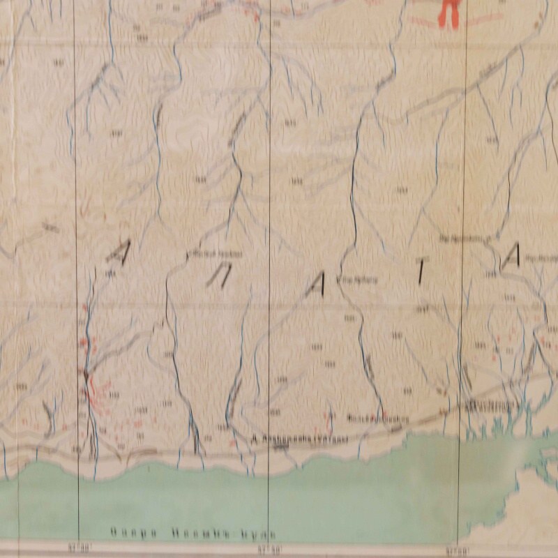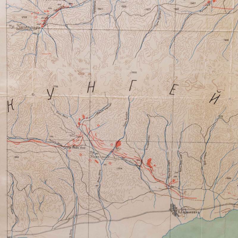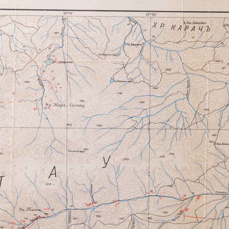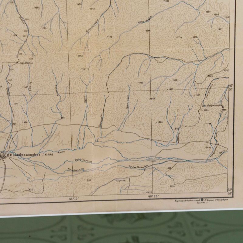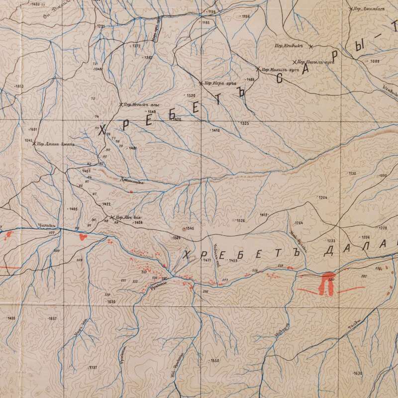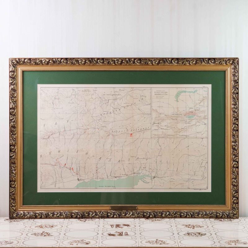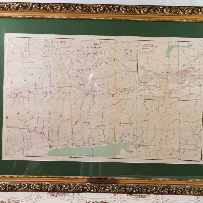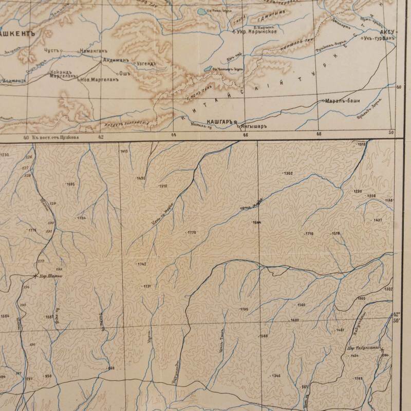Карта «Восточная часть Русского Туркестана», созданная в период активного географического и военно-топографического освоения Средней Азии. Карта охватывает территорию восточной части Семиреченской области и приграничных земель Тянь-Шаня, включая современную территорию Юго-Восточного Казахстана и Северного Кыргызстана. На карте детально изображены хребты Кунгей Алатау, Заилийский Алатау, Карач, Тюре-Джейляу, Сары-Тау, Далашик, горные перевалы и долины рек Чилик, Чарын, Иссык, Тургень, Талгар, а также побережье озера Иссык-Куль. В верхнем левом углу расположена уменьшенная обзорная вставка общей карты Восточной части Русского Туркестана. На ней представлены основные административные центры и опорные пункты региона: Верный (Алматы), Мерке, Аулие Ата (Тараз), Джаркент (Жаркент), Пишпек (Бишкек), Ташкент, Кашгар, а также главные перевалы, речные системы и границы. Этот обзор позволяет соотнести детальный участок карты с более широким географическим контекстом, подчеркивая комплексный характер издания. Масштаб карты: 100 верст к 1 английскому дюйму, что позволяет оценить расстояния между населенными пунктами и другими географическими объектами. Карта была издана картографическим заведением А. Ильина в Санкт-Петербурге. Надписи на карте выполнены на русском языке в дореволюционной графике, что подчеркивает её возраст.
