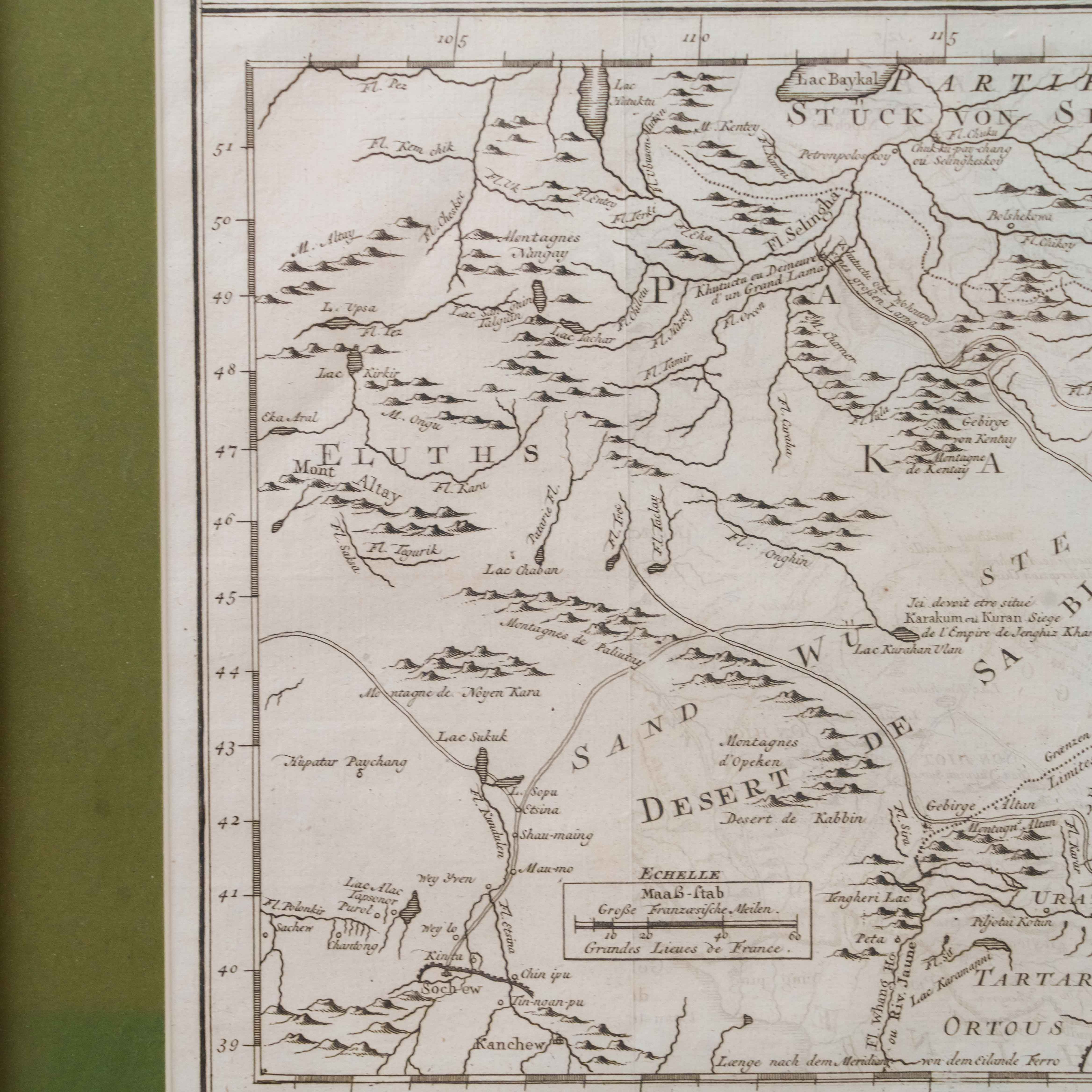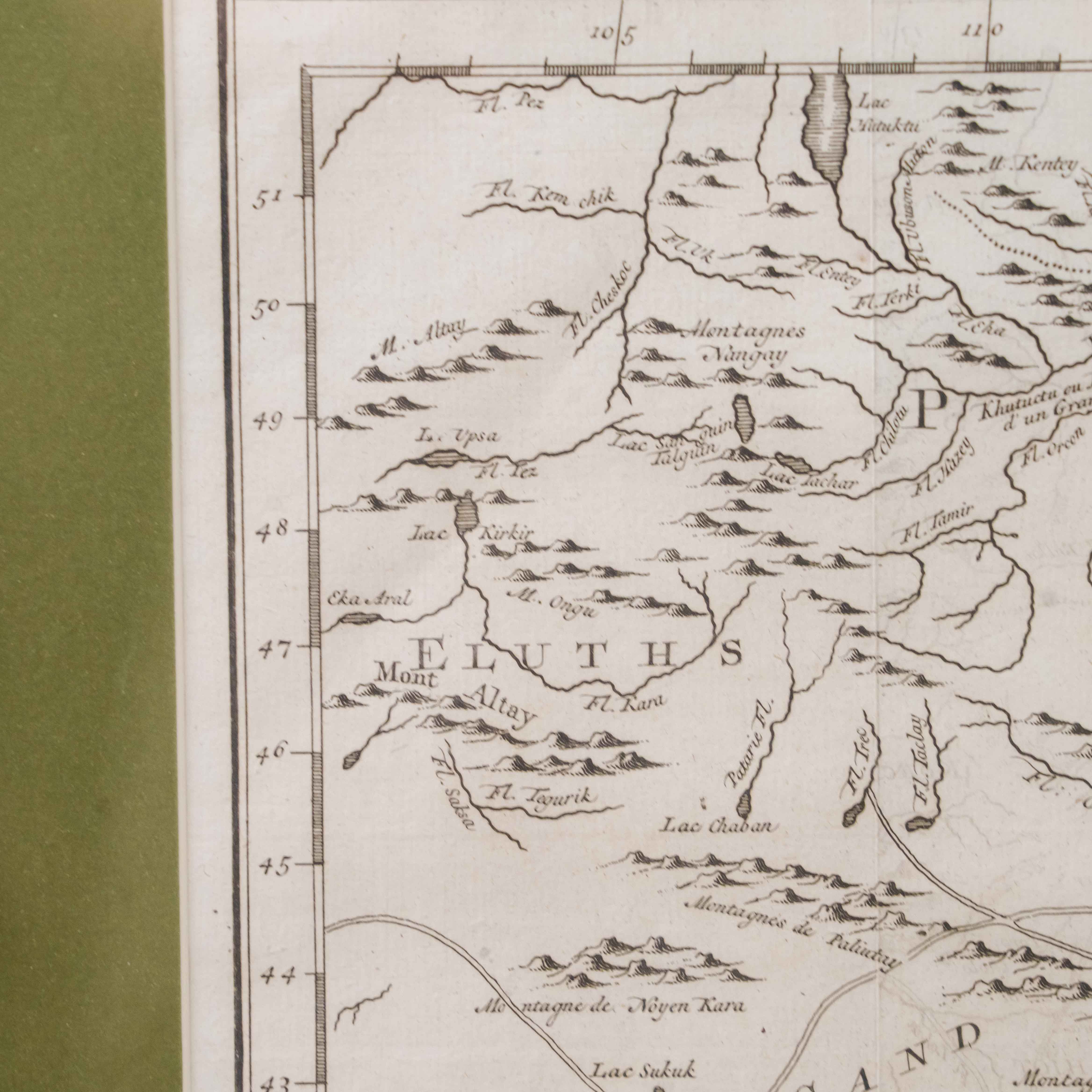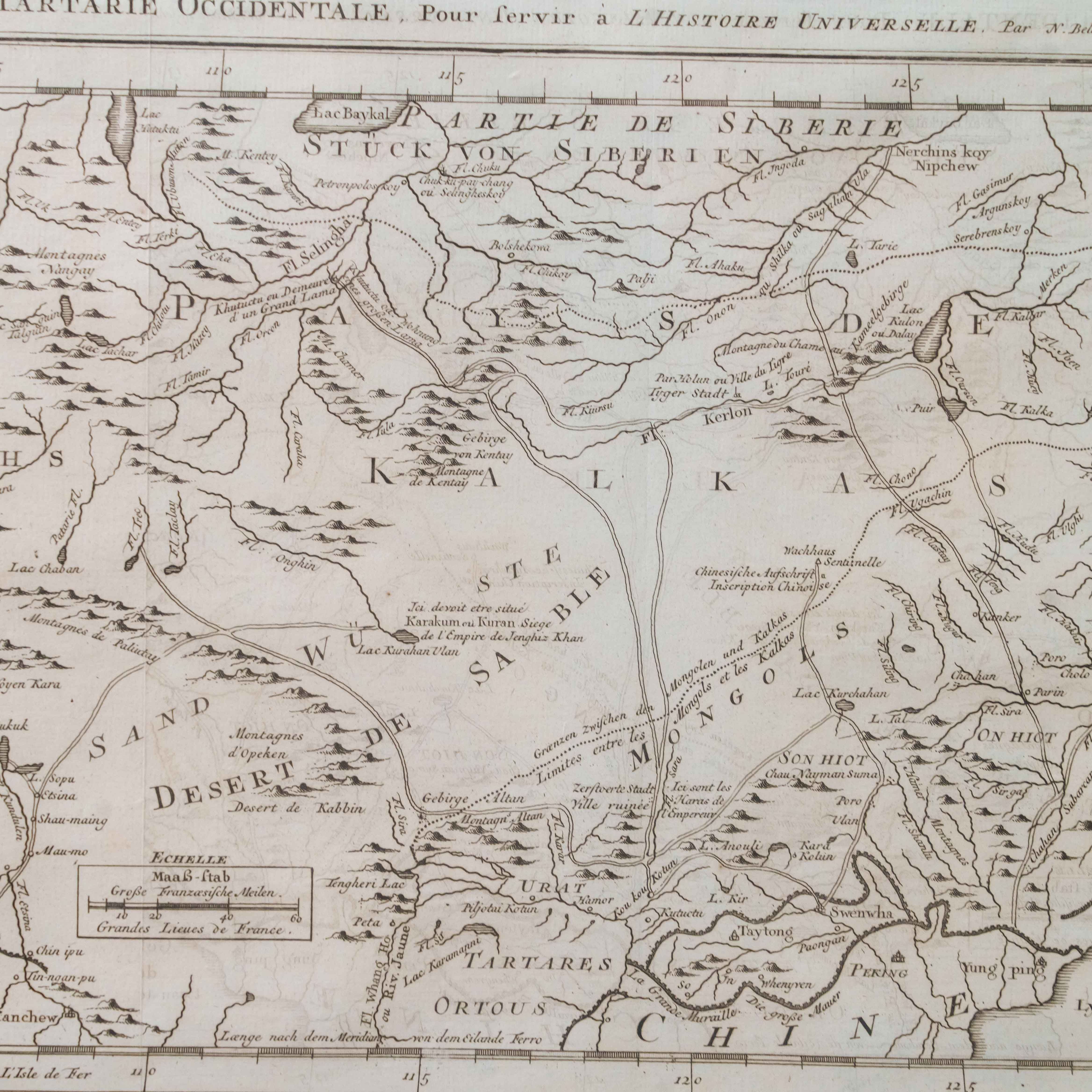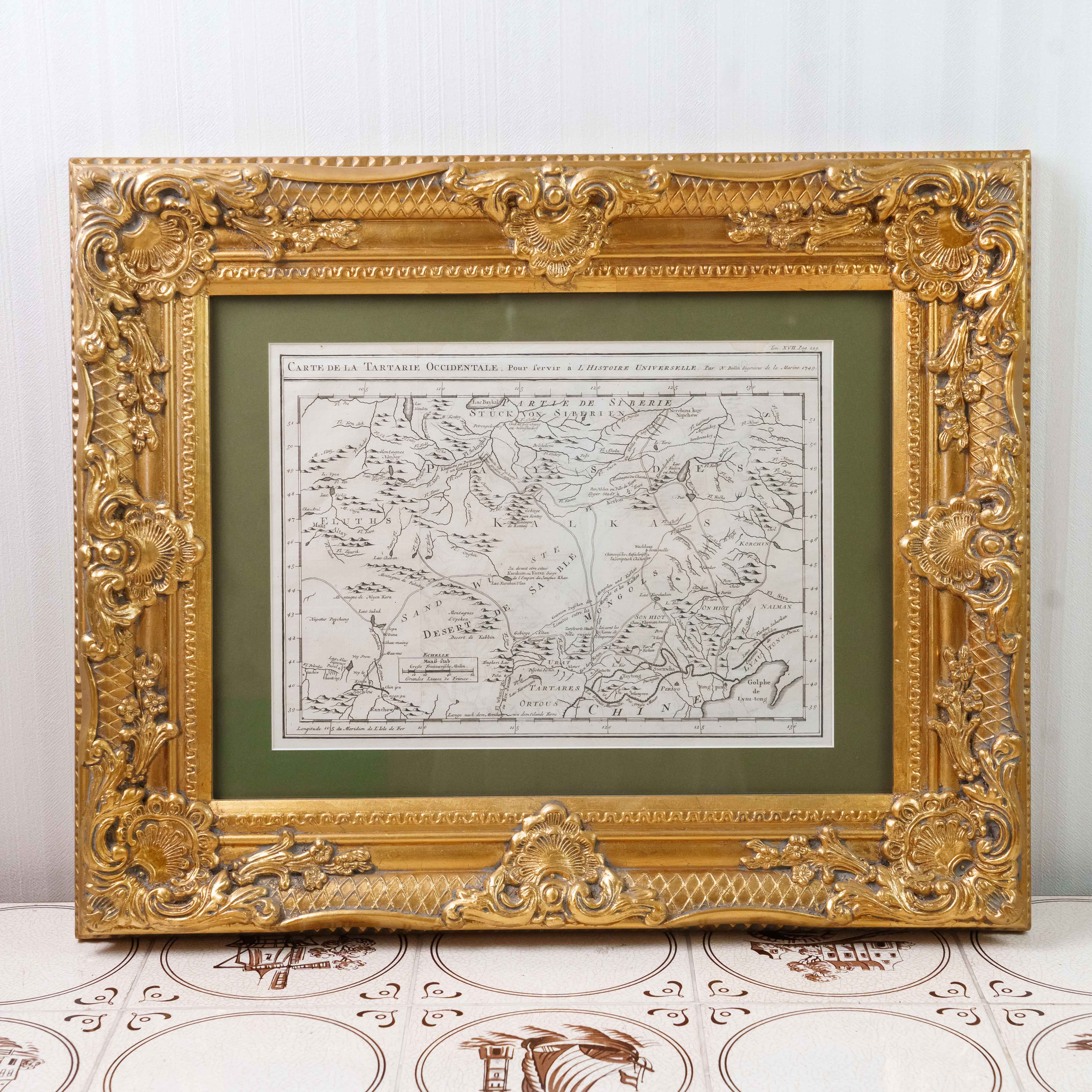Карта была создана выдающимся инженером-гидрографом Жаком-Николя Беллин, служившим при Морском министерстве Франции. На карте изображены обширные территории Центральной Азии – Западная Тартария, включавшая земли Казахского ханства, Джунгарии, Западного Китая и Южной Сибири. В верхней части обозначено озеро Байкал (Lac Baykal), далее к западу – горы Алтай (Mont Altay) и реки Селенга (Fl. Selinga) и другие. В центре карты показаны земли Кал-мыков (Kalkas) и Элутов (Eluths) – то есть джунгар и ойратов, а южнее Песчаная пустыня (Desert de Sable). В нижней части отмечены области Тартарии Ортус (Tartares Ortous), Монголия (Mon-gols) и Китай (Chine), с указанием древних городов Пекин (Peking) и Датун (taytong), а также побережья залива Ляодун (Golphe de Lyau-tong). На ней подробно описаны дороги и показаны участки Великой стены. Карта наполнена множеством старинных топонимов и этнонимов, отражающих картину этнографического устройства Центральной Азии, Монголии и части Китай до упадка Джунгарского ханства. Тартария – географический термин, использовавшийся в западноевропейской литературе и картографии в отношении обширных областей от Каспия до Тихого океана и до границ современных Китая и Индии. Активное использование топонима прослеживается с XIII до XIX века. В европейских источниках Тартария стала наиболее распространенным обозначением Центральной Азии и Сибири.