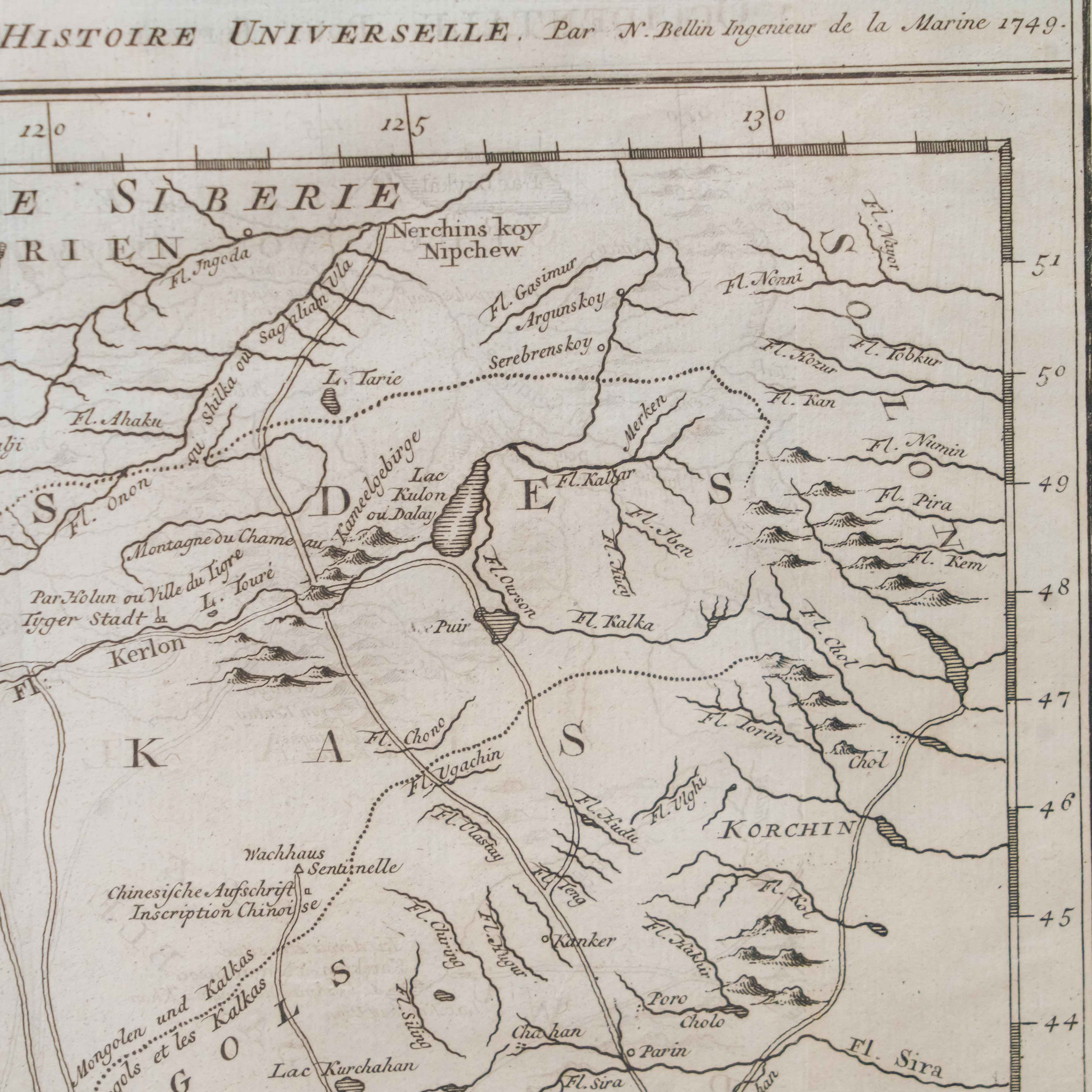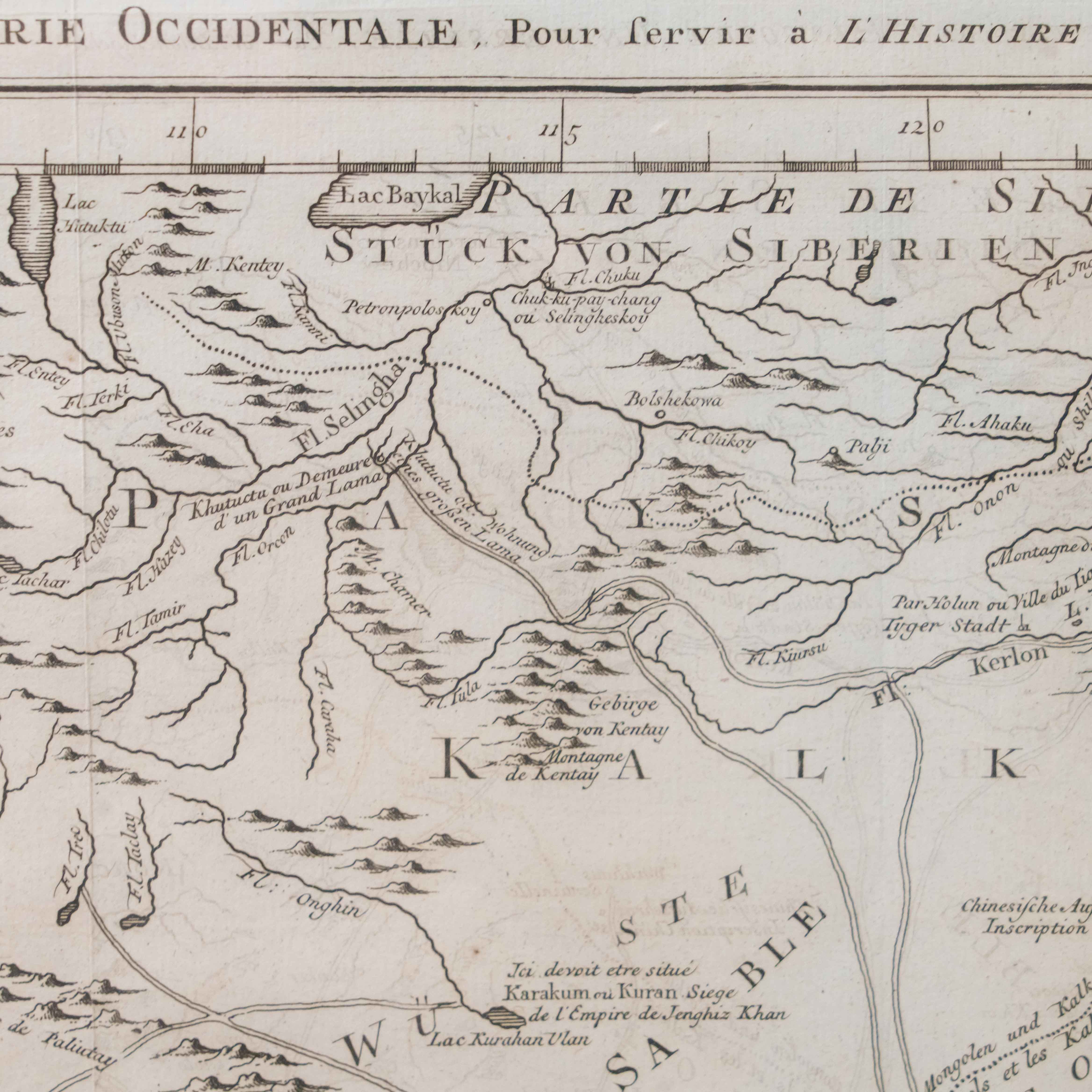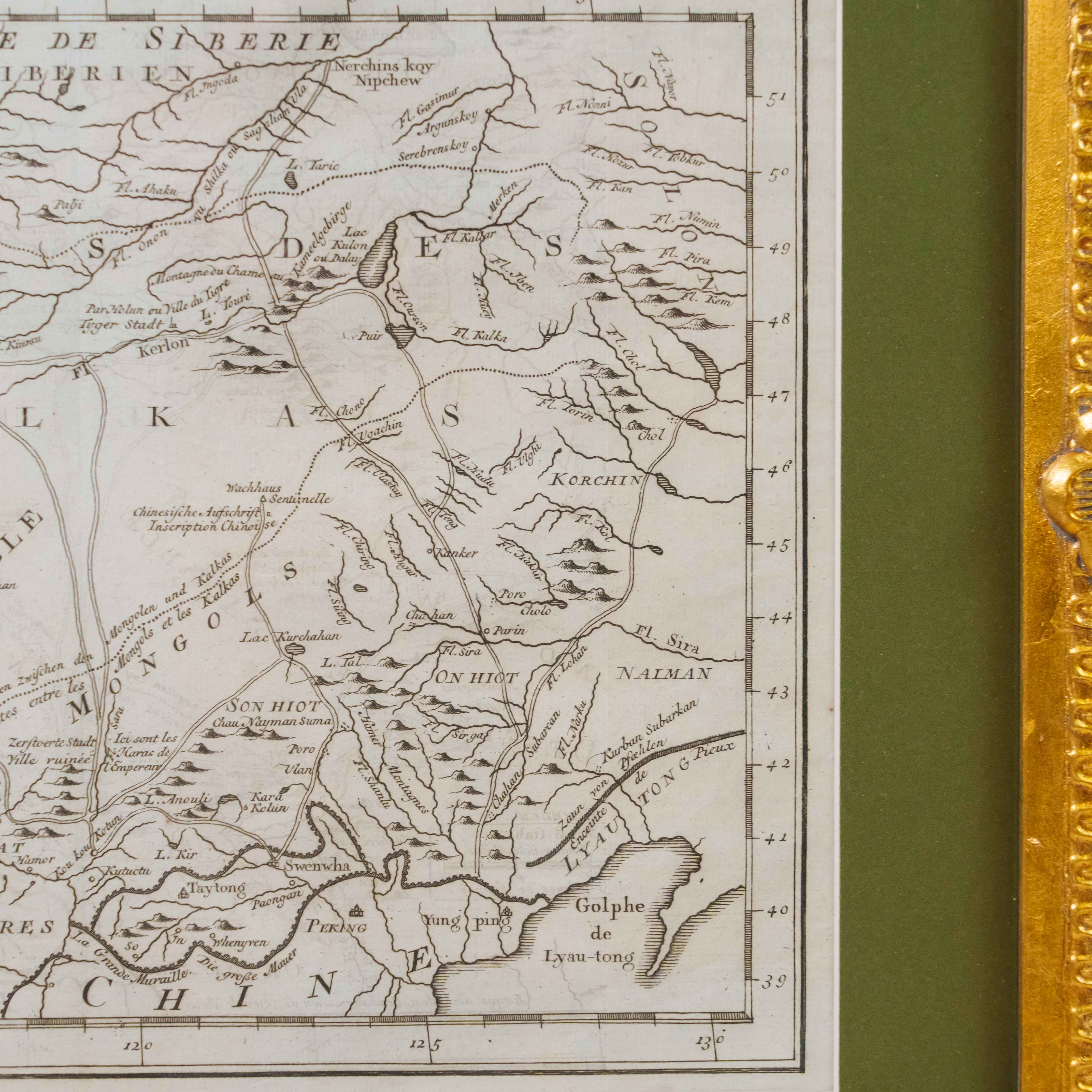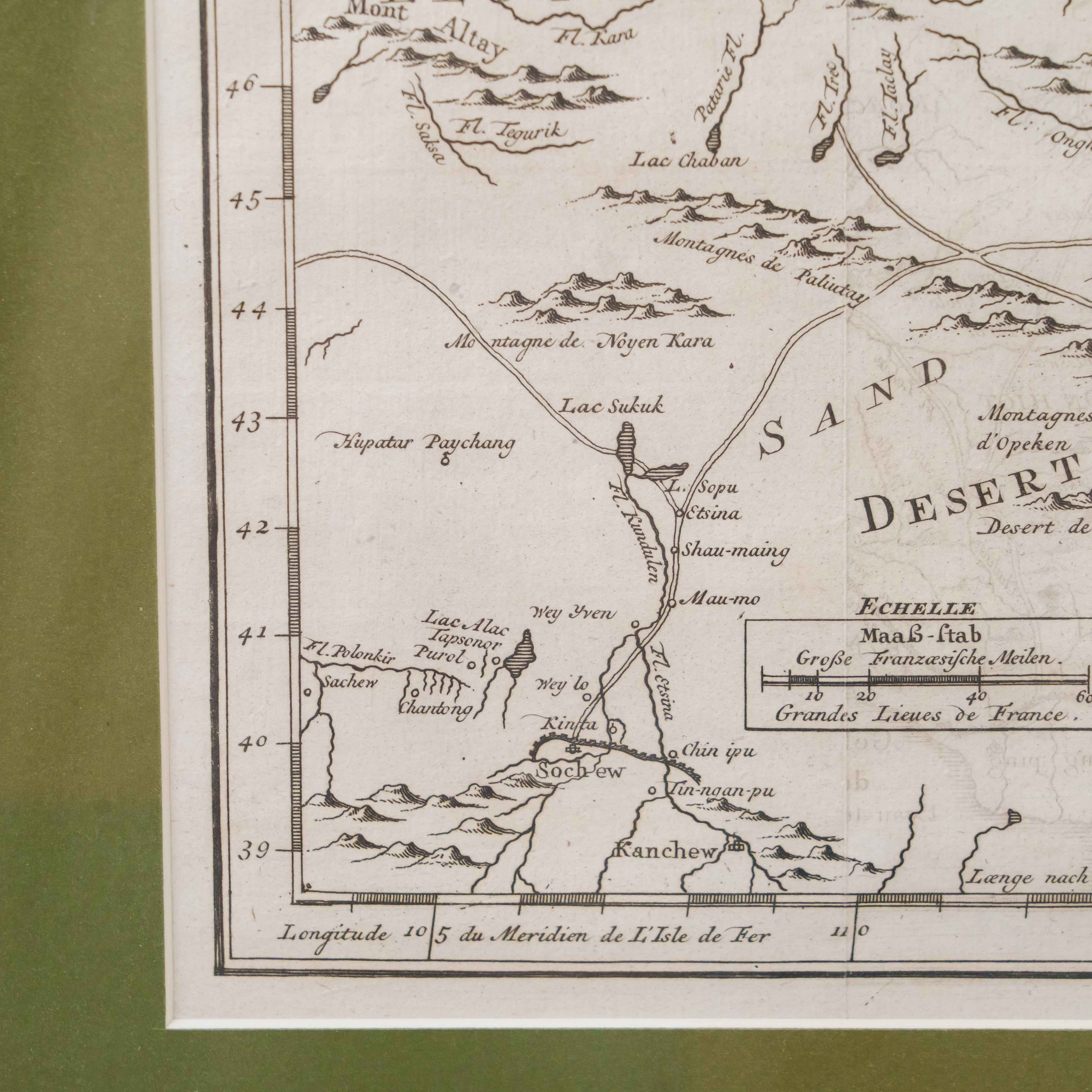 Карта была создана выдающимся инженером-гидрографом Жаком-Николя Беллин, служившим при Морском министерстве Франции. На карте изображены обширные территории Центральной Азии – Западная Тартария, включавшая земли Казахского ханства, Джунгарии, Западного Китая и Южной Сибири. В верхней части обозначено озеро Байкал (Lac Baykal), далее к западу – горы Алтай (Mont Altay) и реки Селенга (Fl. Selinga) и другие. В центре карты показаны земли Кал-мыков (Kalkas) и Элутов (Eluths) – то есть джунгар и ойратов, а южнее Песчаная пустыня (Desert de Sable). В нижней части отмечены области Тартарии Ортус (Tartares Ortous), Монголия (Mon-gols) и Китай (Chine), с указанием древних городов Пекин (Peking) и Датун (taytong), а также побережья залива Ляодун (Golphe de Lyau-tong). На ней подробно описаны дороги и показаны участки Великой стены. Карта наполнена множеством старинных топонимов и этнонимов, отражающих картину этнографического устройства Центральной Азии, Монголии и части Китай до упадка Джунгарского ханства. Тартария – географический термин, использовавшийся в западноевропейской литературе и картографии в отношении обширных областей от Каспия до Тихого океана и до границ современных Китая и Индии. Активное использование топонима прослеживается с XIII до XIX века. В европейских источниках Тартария стала наиболее распространенным обозначением Центральной Азии и Сибири.