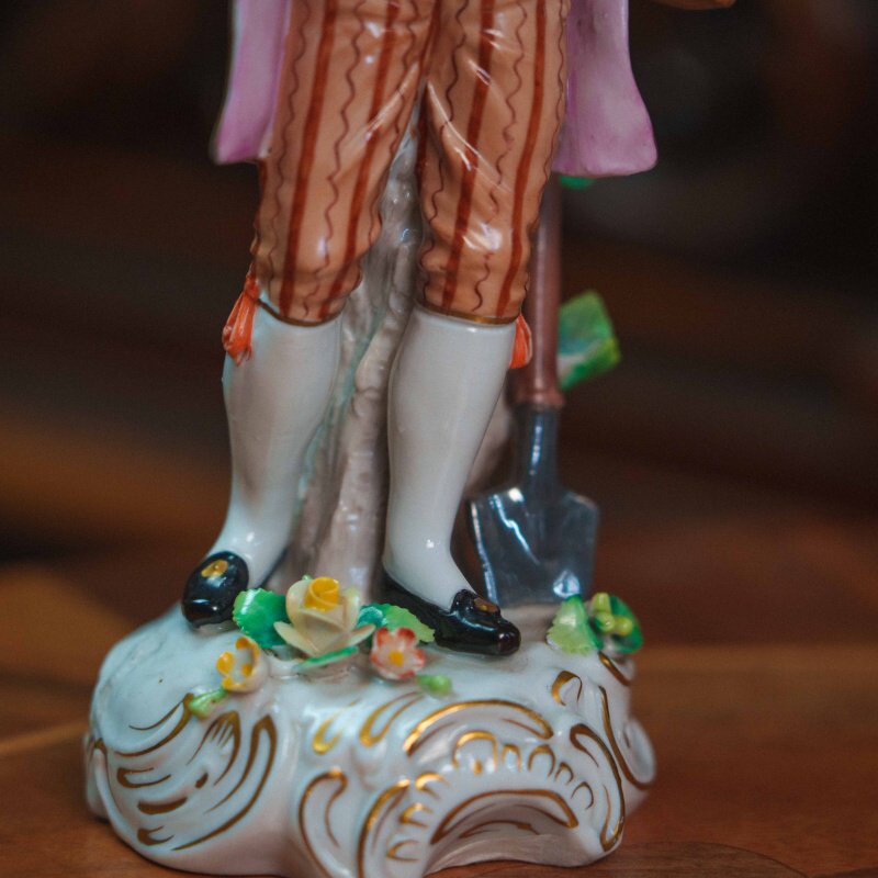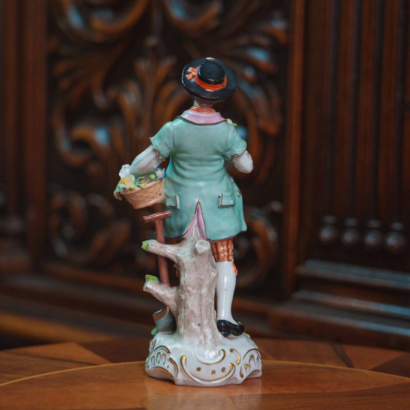Изящная фарфоровая статуэтка, изображающая молодого кавалера с корзиной в парадном костюме. Юноша изображен с корзиной цветов в одной руке и цветком — в другой, рядом расположена лопата. Особое внимание уделено росписи: костюм украшен мелким цветочным орнаментом, сочетание пастельных оттенков (мятного, розового, кремового) создает легкое, декоративное звучание. Присутствуют деликатные золоченые акценты, подчеркивающие линии одежды и основание. Основание выполнено с рокайльным орнаментом и дополнено лепными цветами. На донышке присутствует клеймо мануфактуры Sitzendorf.