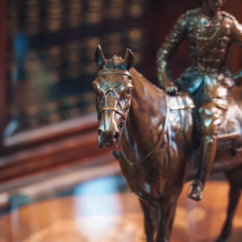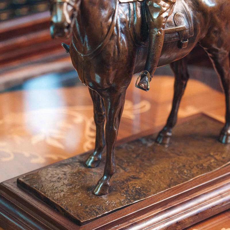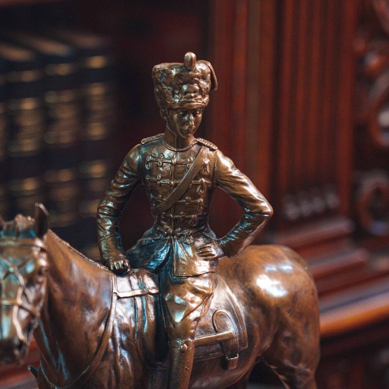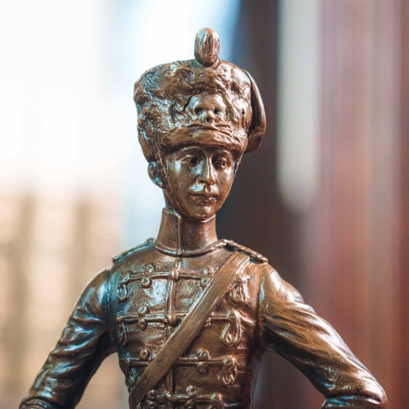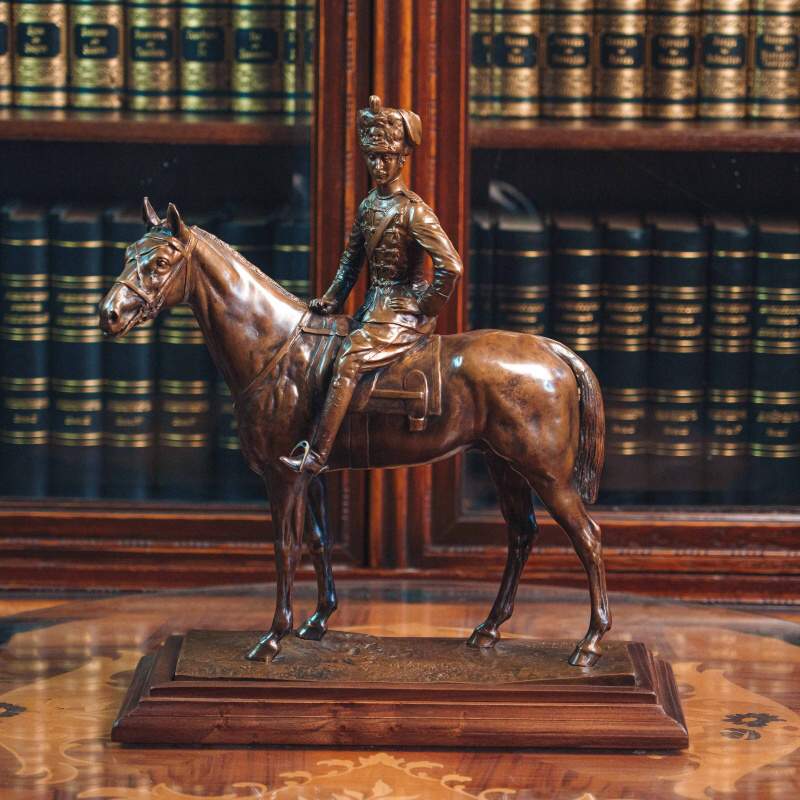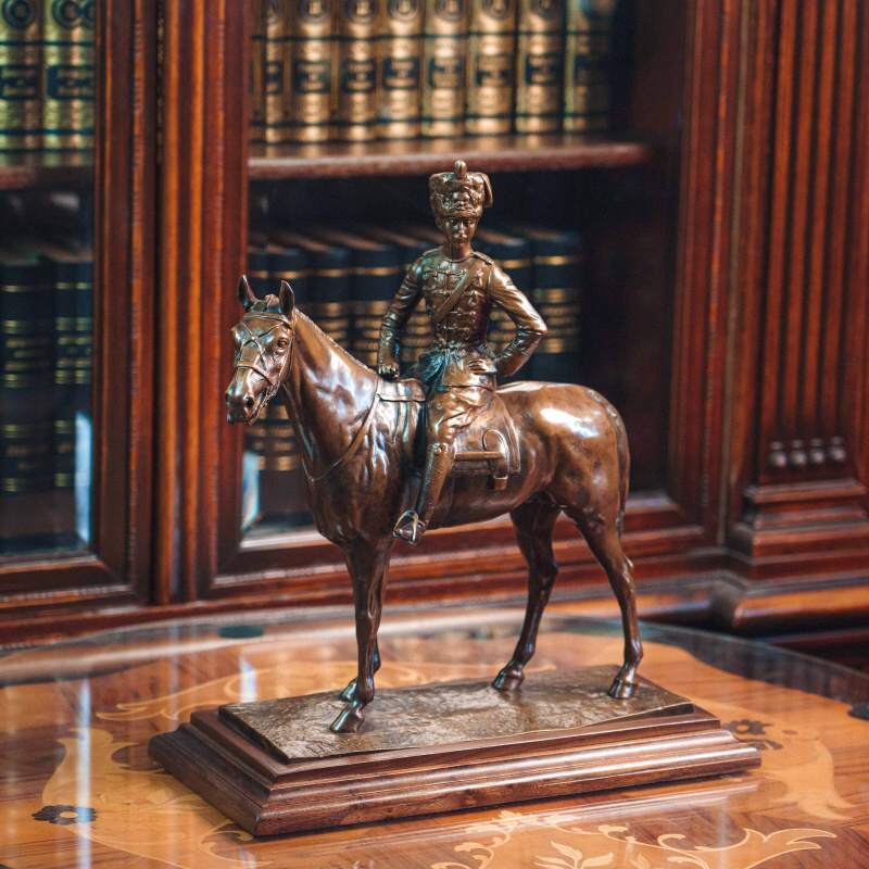 Фигура всадника тщательно моделирована: на мундире детализированы шнуры, пуговицы, наплечники, ремни и элементы обмундирования, создавая подлинное ощущение исторической формы.
