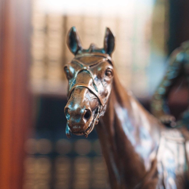 Выразительная бронзовая композиция, изображающая кавалерийского офицера в парадной форме, спокойно сидящего верхом на коне. Работа выполнена с высокой степенью реалистичности, характерной для немецкой бронзовой школы конца XIX – начала XX века, и несёт узнаваемую манеру мастера Hans Guradze, чьи произведения отличались точностью в передаче военной униформы, уравновешенной композицией и благородной патиной.