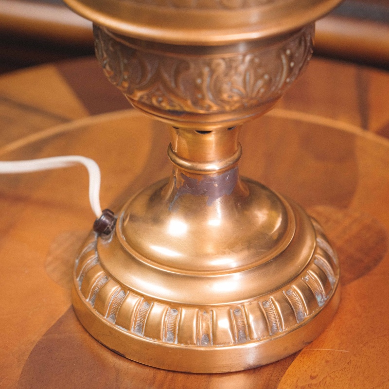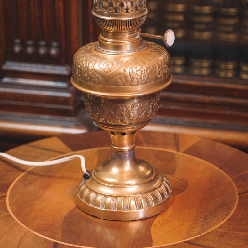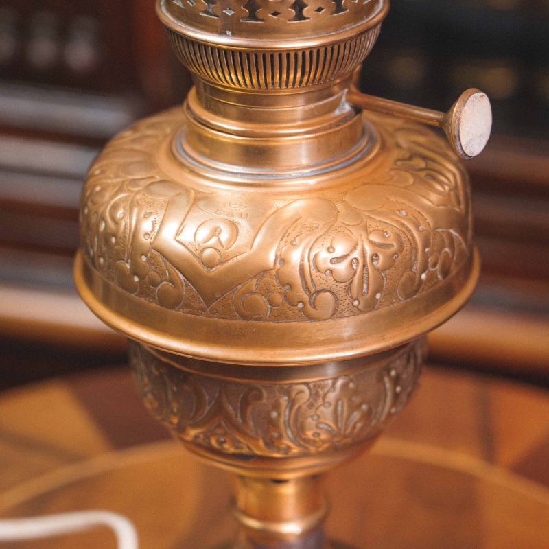 Благодаря электрификации лампа сочетает в себе атмосферу старинного освещения и удобство повседневной эксплуатации. Тёплый блеск латуни и винтажный силуэт делают её выразительным элементом интерьера.