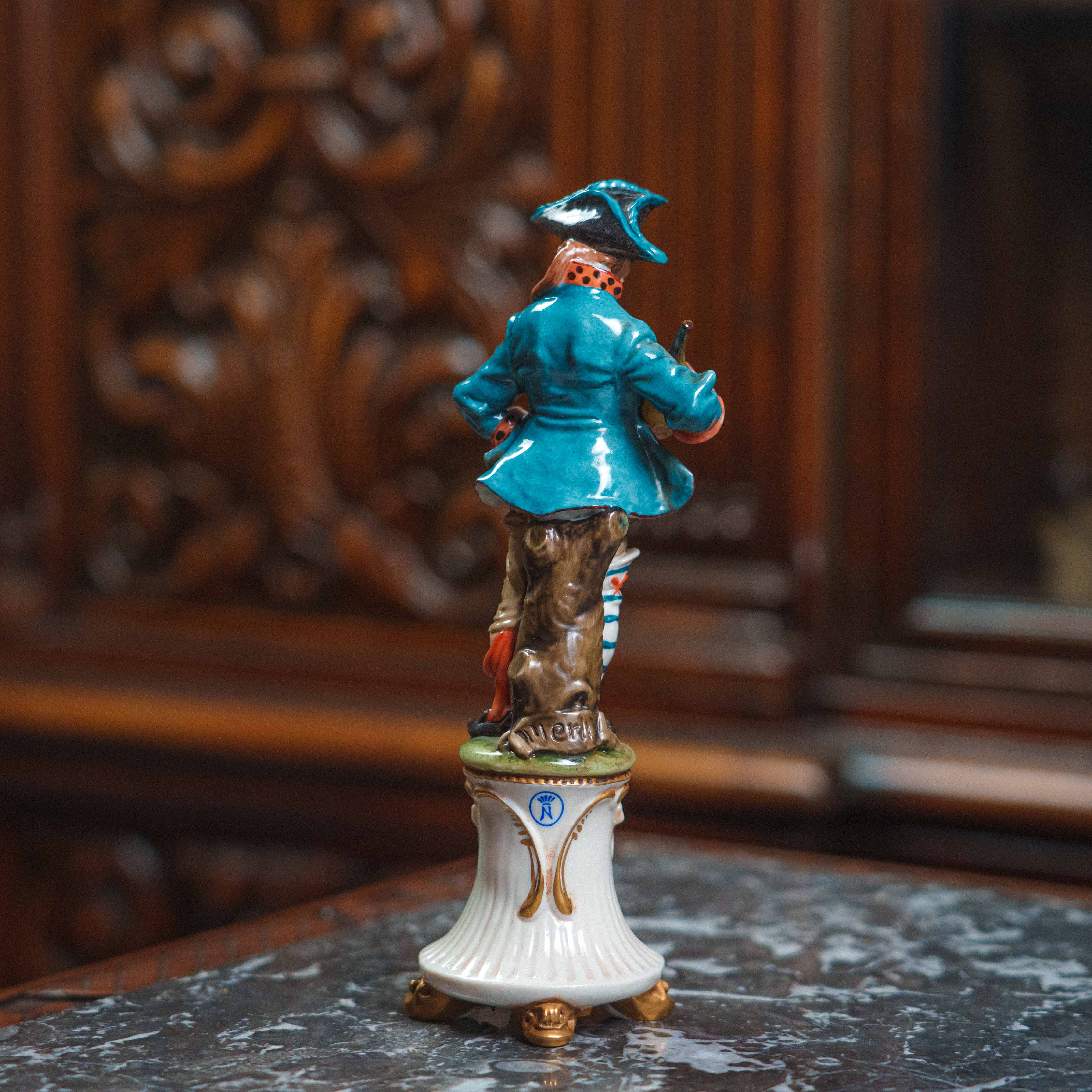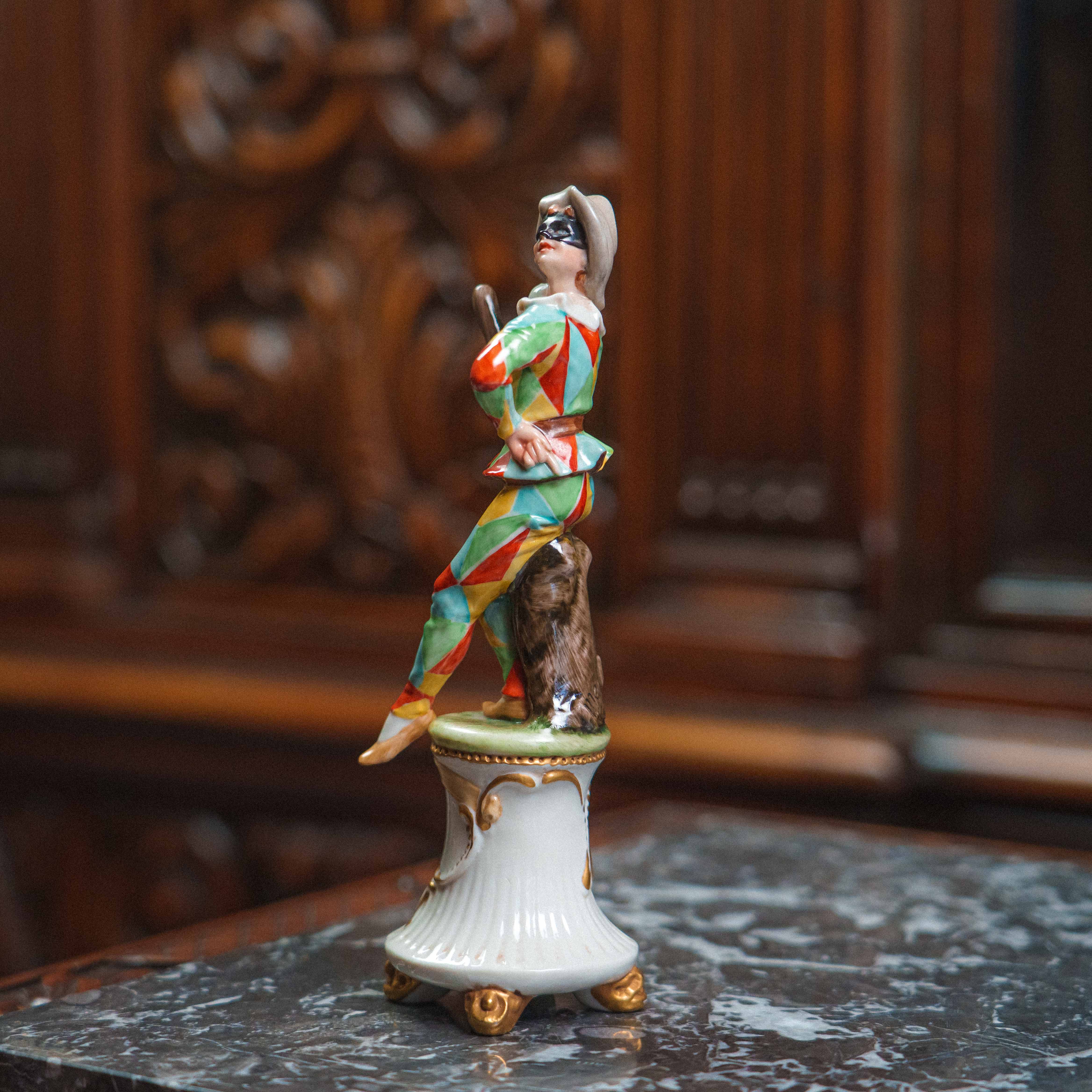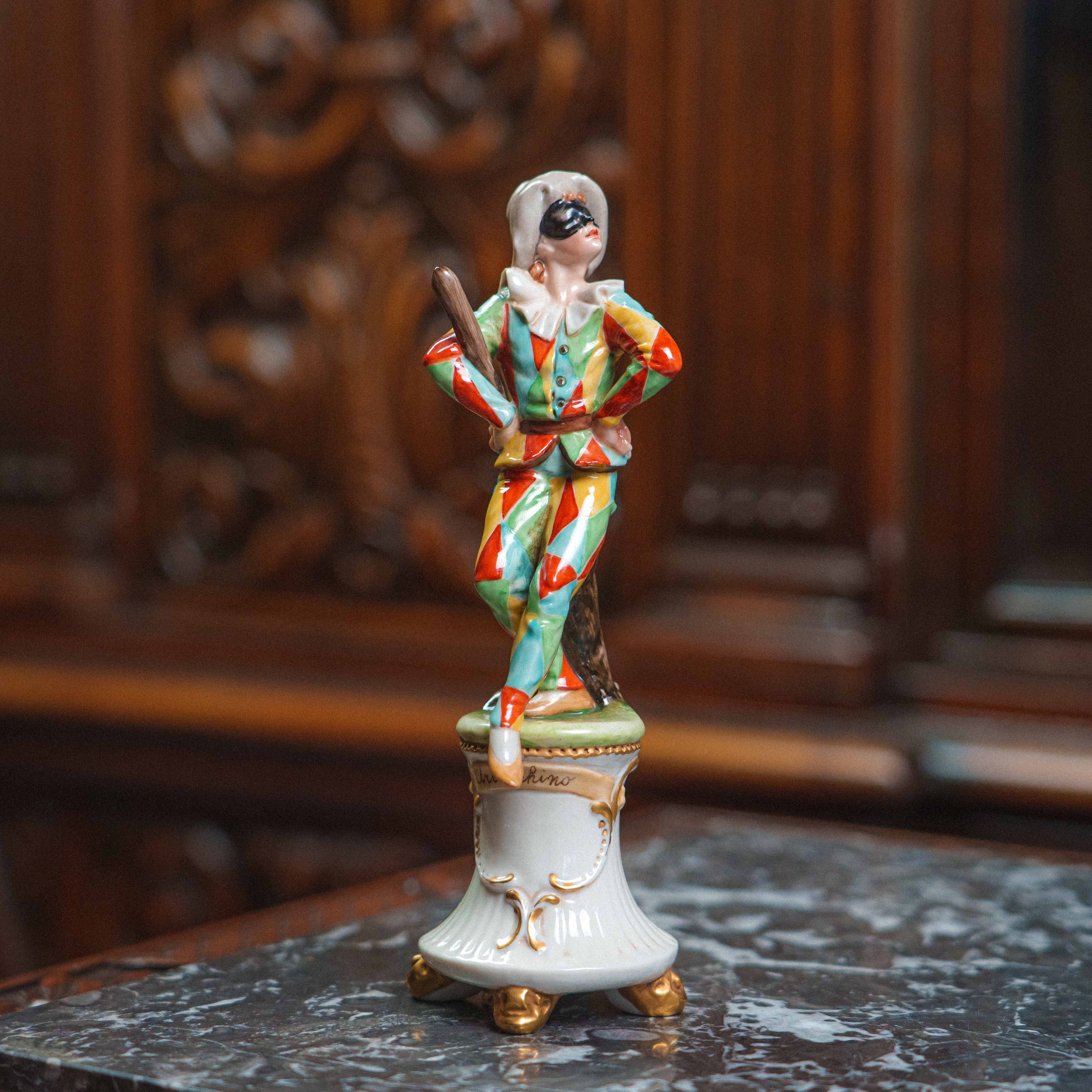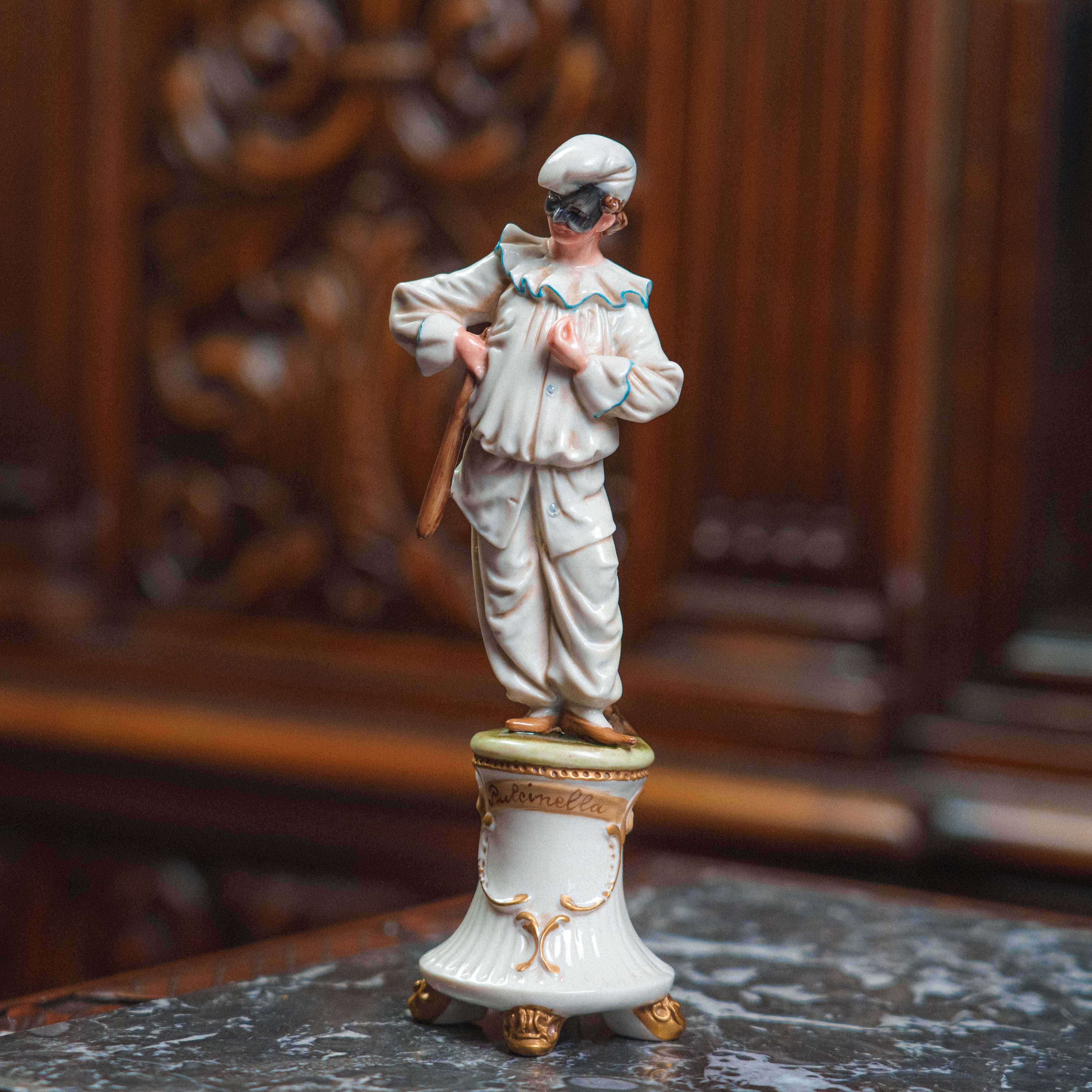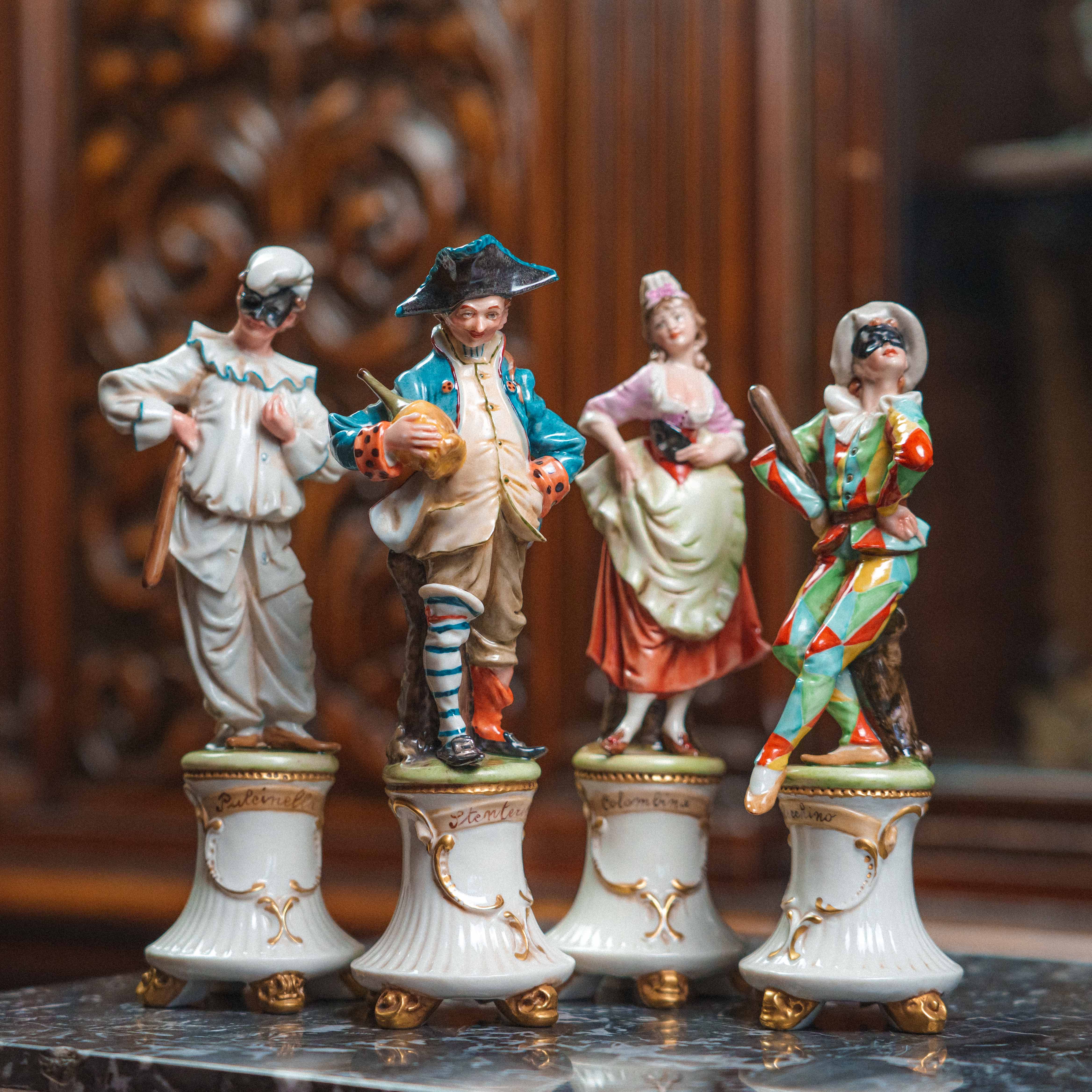 Изысканный ансамбль фарфоровых фигур, созданный на мануфактуре King’s Porcelain по моделям итальянского скульптора Bruno Merli. Композиция посвящена персонажам комедии дель арте — традиционного итальянского театра, вобравшего в себя живость народной культуры, юмор, импровизацию и яркие архетипы человеческих характеров. Каждая фигура выполнена с тонким чувством движения и выразительной пластики: театральные позы, утрированные жесты и динамичные повороты корпуса передают настроение сцены и индивидуальность персонажей. Ручная роспись отличается насыщенной палитрой, сложными переходами цвета и вниманием к мельчайшим деталям костюмов — от складок тканей до декоративных элементов и масок. Основания фигур оформлены в классической манере, с изящными профилированными формами и позолоченными акцентами, что придаёт ансамблю завершённость и декоративную цельность. Эти статуэтки представляют собой не просто интерьерные объекты, а настоящие театральные миниатюры, воплощающие дух Италии, её артистизм и любовь к сцене.