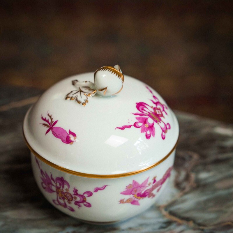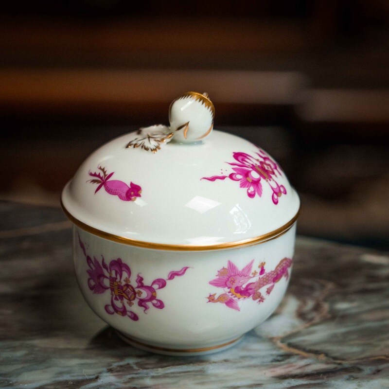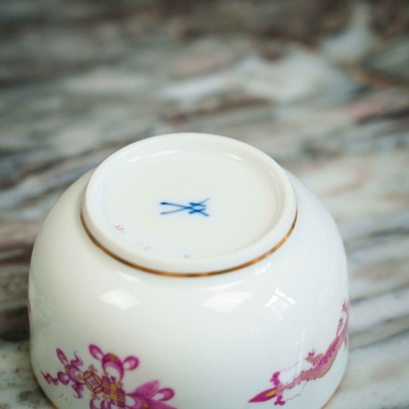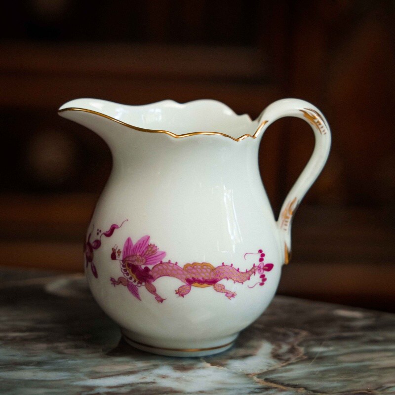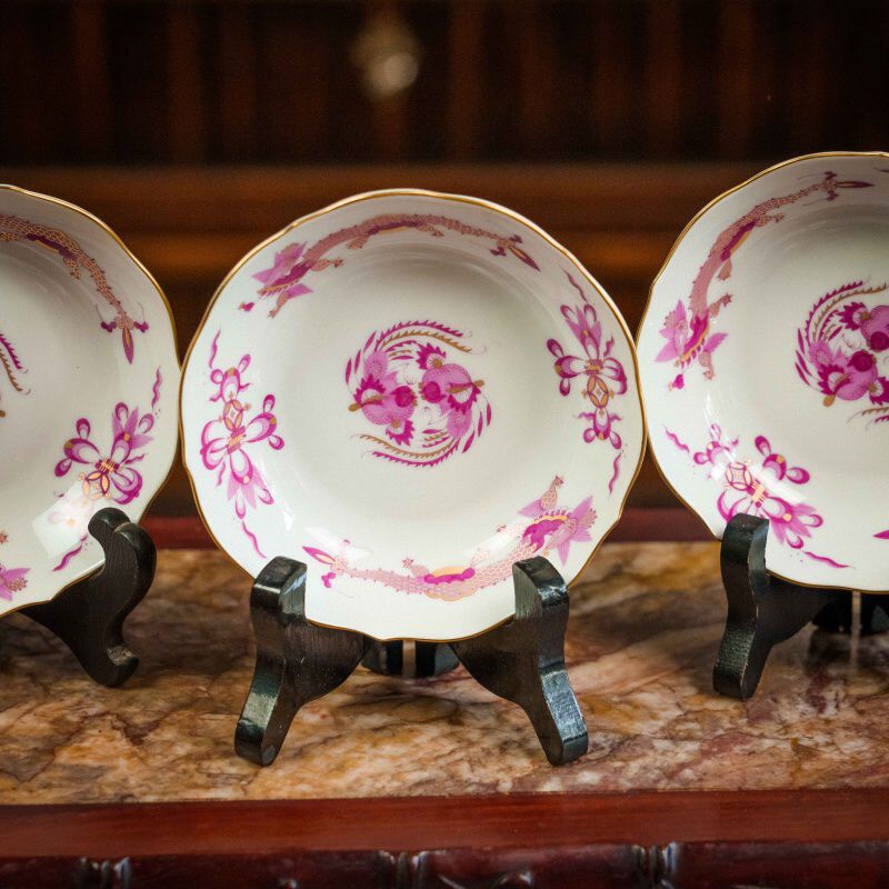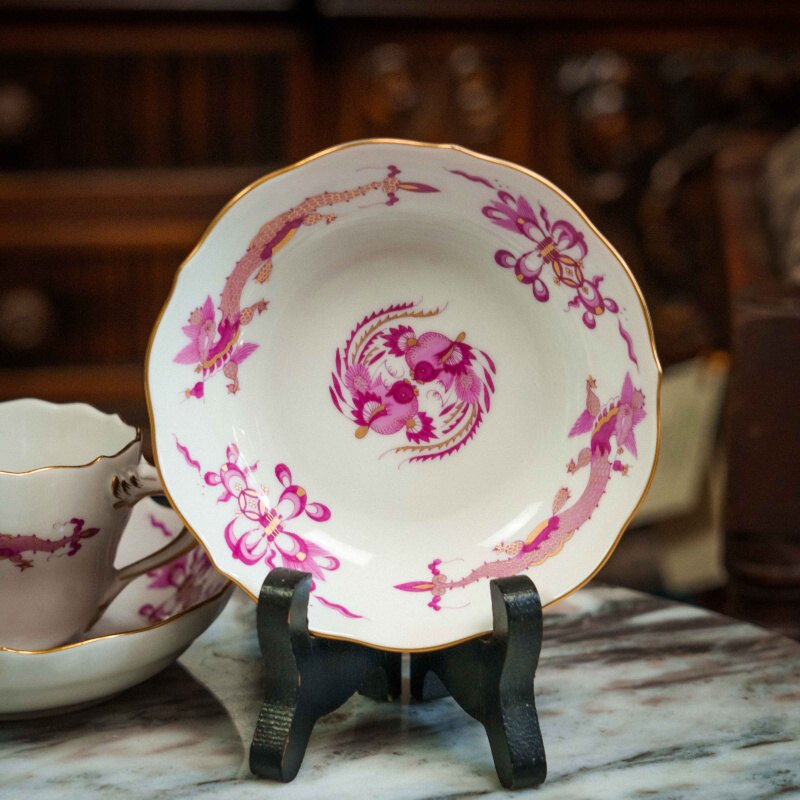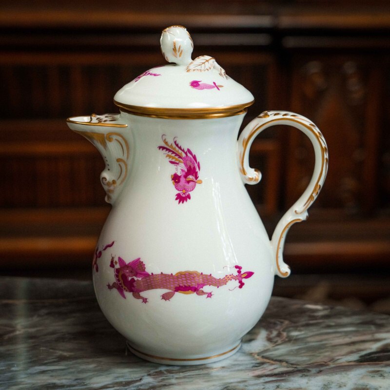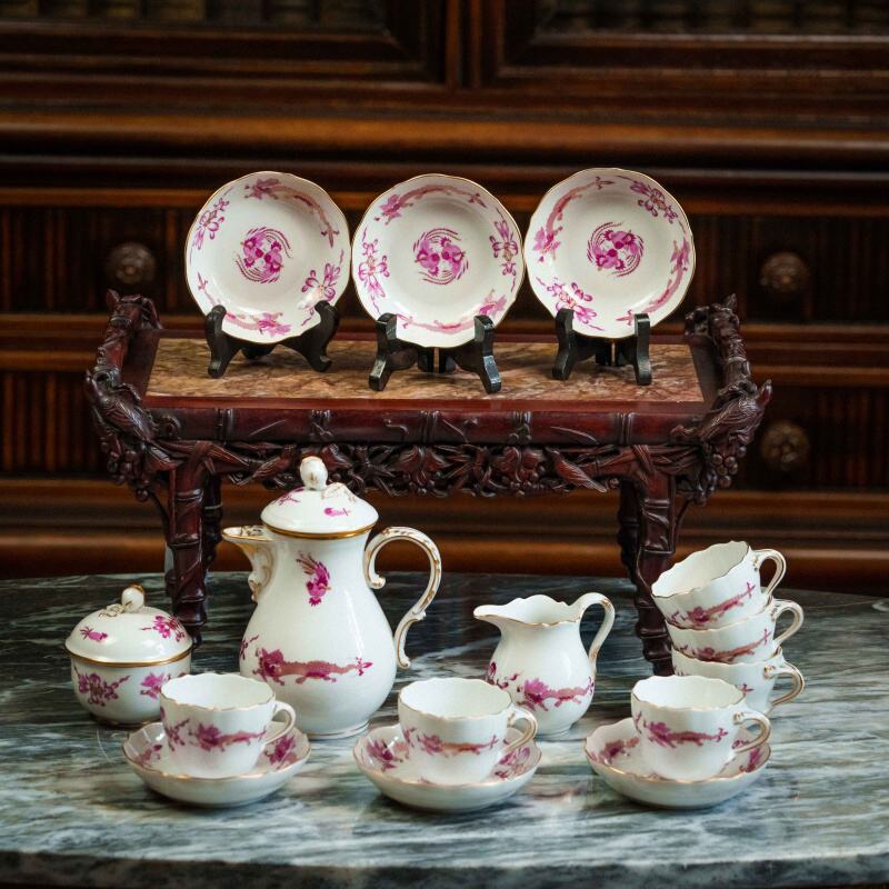 Изысканный кофейный сервиз, выполненный на легендарной майсенской мануфактуре, представляет собой пример классического декора «Rich Court Dragon» — одного из самых узнаваемых и коллекционно ценных орнаментов Meissen. Композиция украшена стилизованными изображениями драконов и фениксов, исполненных в насыщенной малиновой гамме. Мифологические существа изображены на фоне пустого белого пространства без дополнительных орнаментов, что подчёркивает чистоту формы и выразительность росписи. Края чашек, блюдец и предметов сервировки украшены вручную нанесённой позолотой. Мотивы феникса и дракона были заимствованы из китайского декоративного искусства и адаптированы мастерами Meissen ещё в XVIII веке. В европейской традиции они символизируют силу, благородство и возрождение — качества, идеально отражающие дух придворной утончённости, ради которой создавался этот орнамент. Фарфор отличается характерной для Meissen белизной, тонкостью стенок и выверенной пластикой форм. Каждая деталь сервиза выполнена с исключительным вниманием к деталям, а точность и живость росписи свидетельствуют о высоком уровне мастерства декораторов мануфактуры.