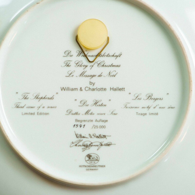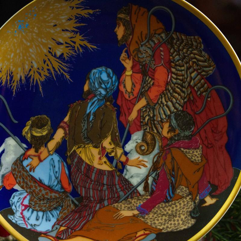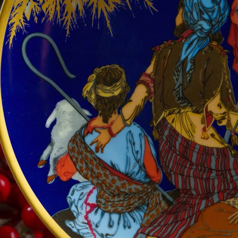 Изысканная декоративная тарелка, выполненная в лучших традициях европейского художественного фарфора конца XX века. Центральная композиция представляет многофигурную рождественскую сцену, наполненную символизмом, теплом и глубокой эмоциональностью. Богатая цветовая палитра — насыщенные синие, золотые, красные и охристые тона — подчёркивает торжественный и сказочный характер сюжета.