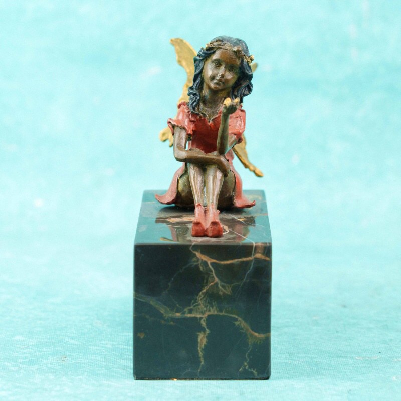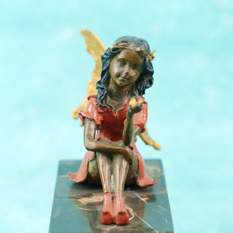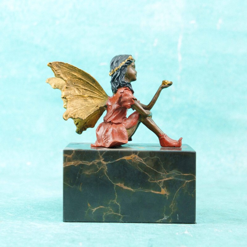 Фея одета в короткое платье терракотово-красного оттенка; за спиной — изящные крылья, выделенные золочением и тщательно проработанные по форме и фактуре. Волосы с тёмной патиной подчёркнуты тонким золотистым венком. Контраст матовых и позолоченных поверхностей усиливает декоративную выразительность и подчёркивает детали модели.
