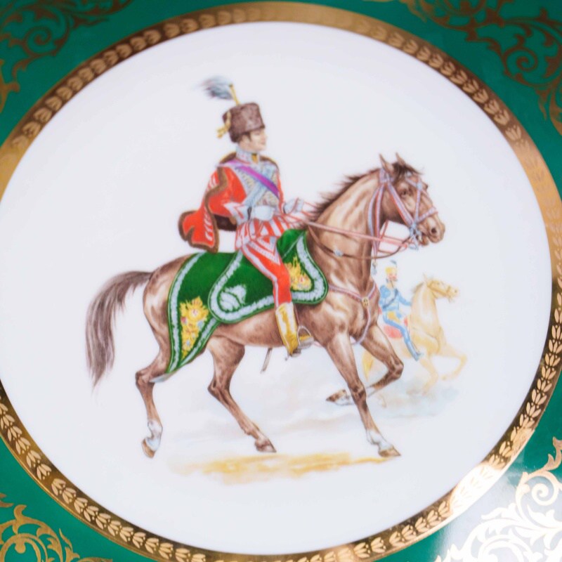 В центре — тщательно прописанная сцена с всадником в парадном военном мундире, изображённым верхом на грациозной лошади. Фигура передана с особым вниманием к деталям: красный доломан, зелёная вальтрапная попона с орнаментом, высокий головной убор с пером — всё это отсылает к традициям европейской кавалерии XIX века.