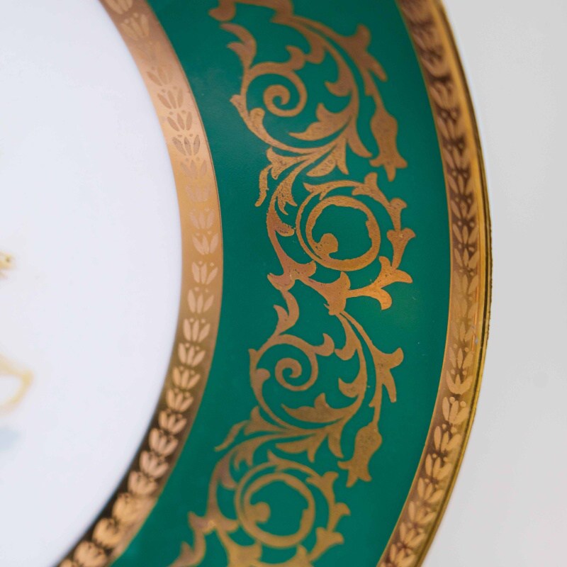 Изысканная настенная тарелка с насыщенным изумрудно-зелёным бортом и богатым золочёным орнаментом в стиле историзма. По краю проходит широкая лента с растительным узором, выполненным в технике золочения, дополненная тонким внутренним бордюром с лавровым мотивом.