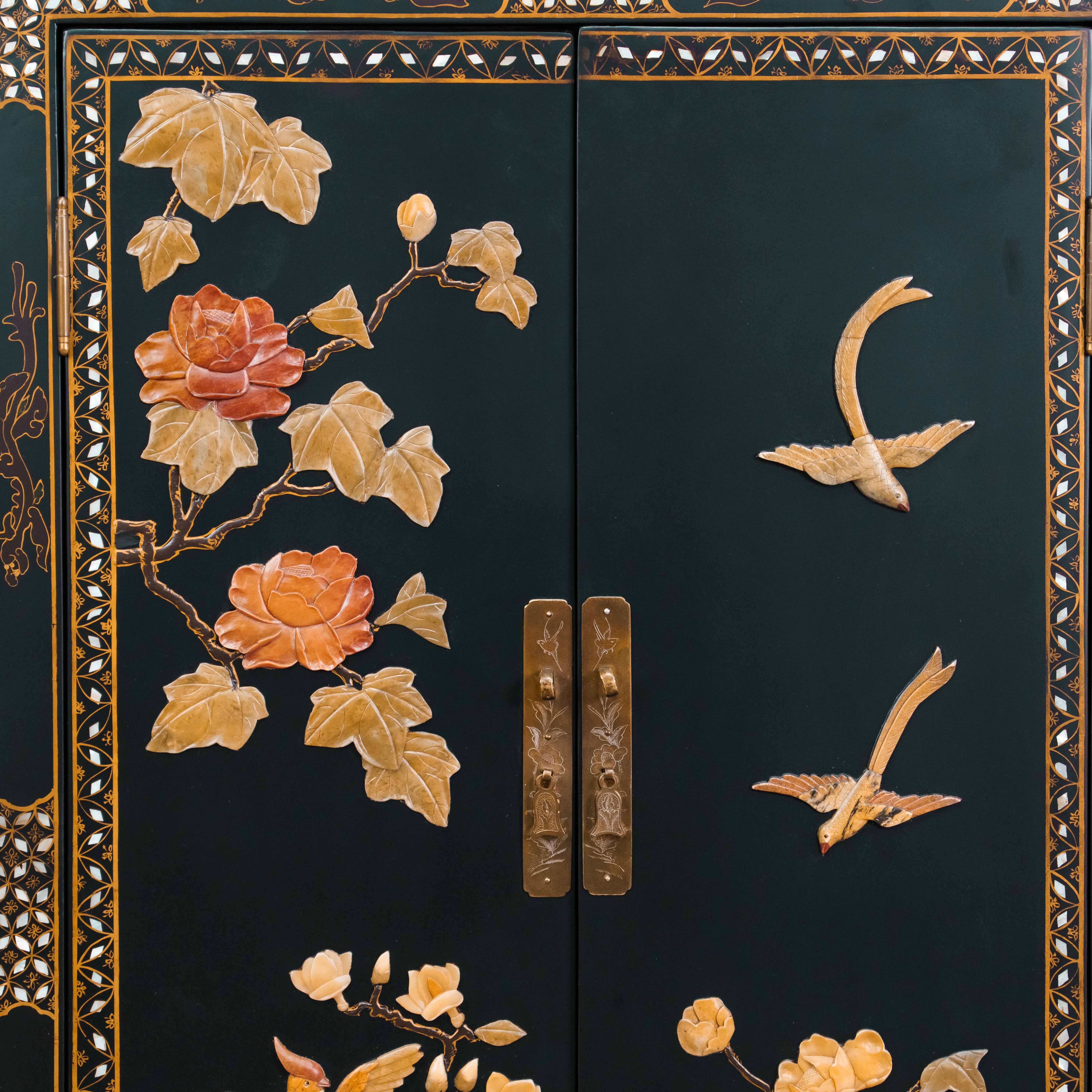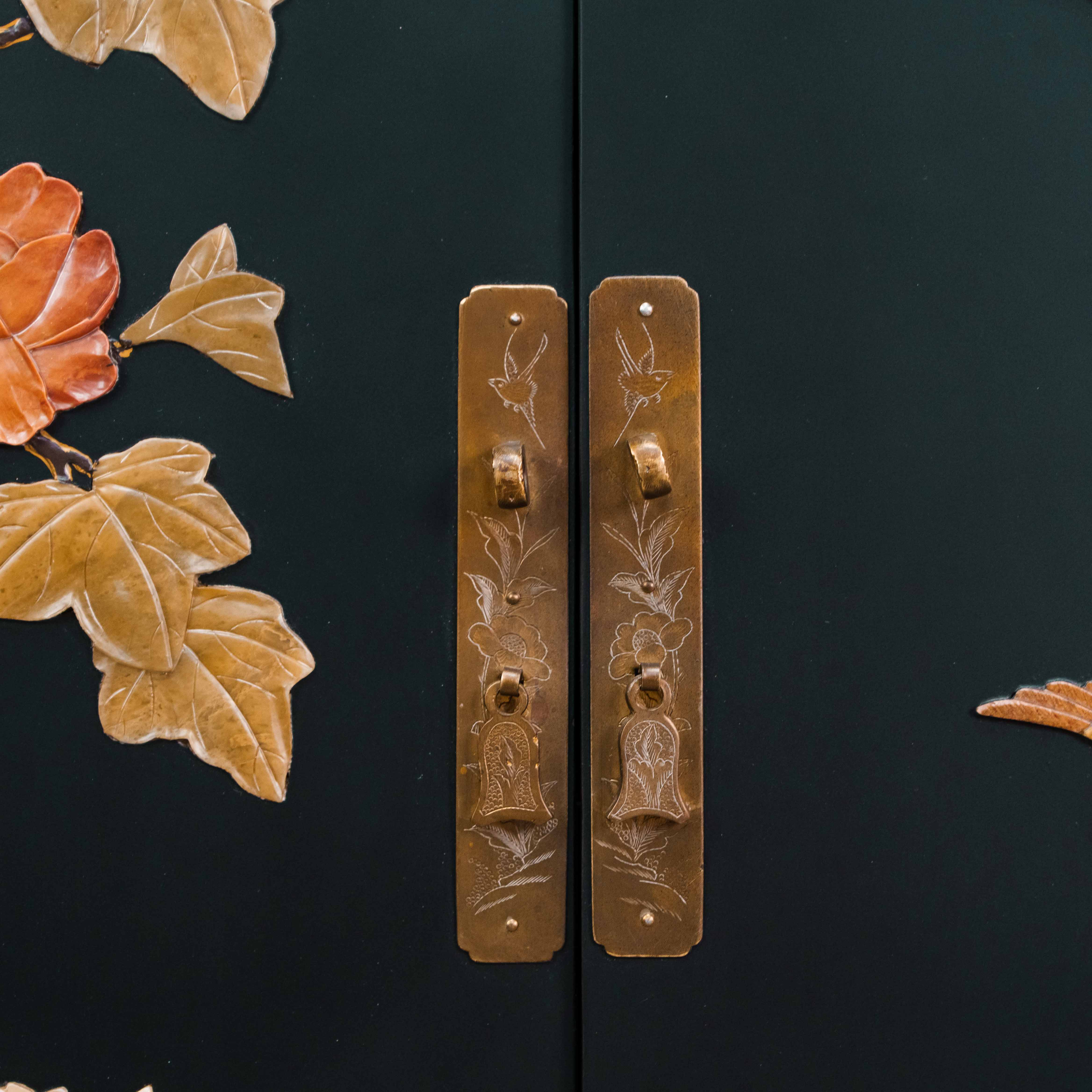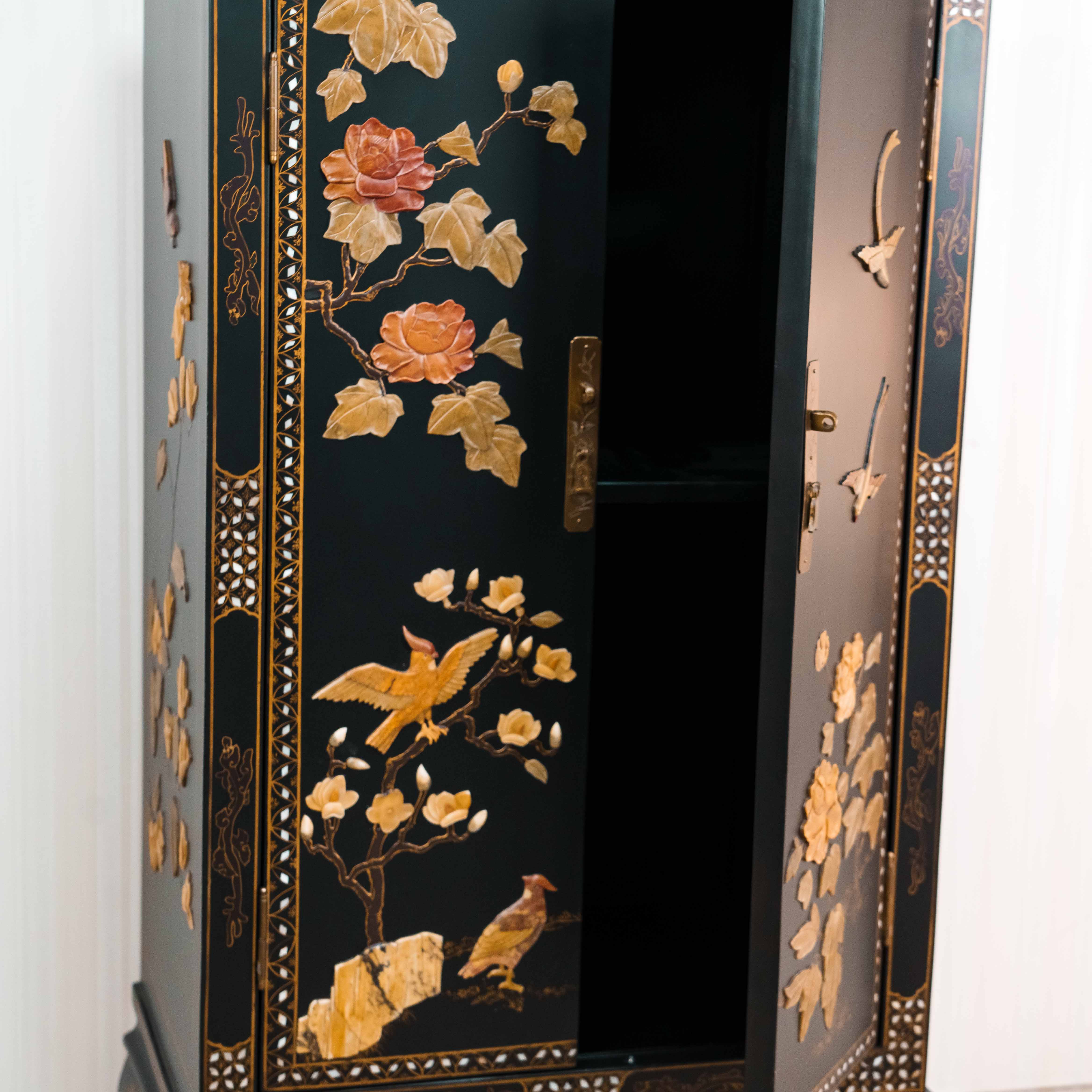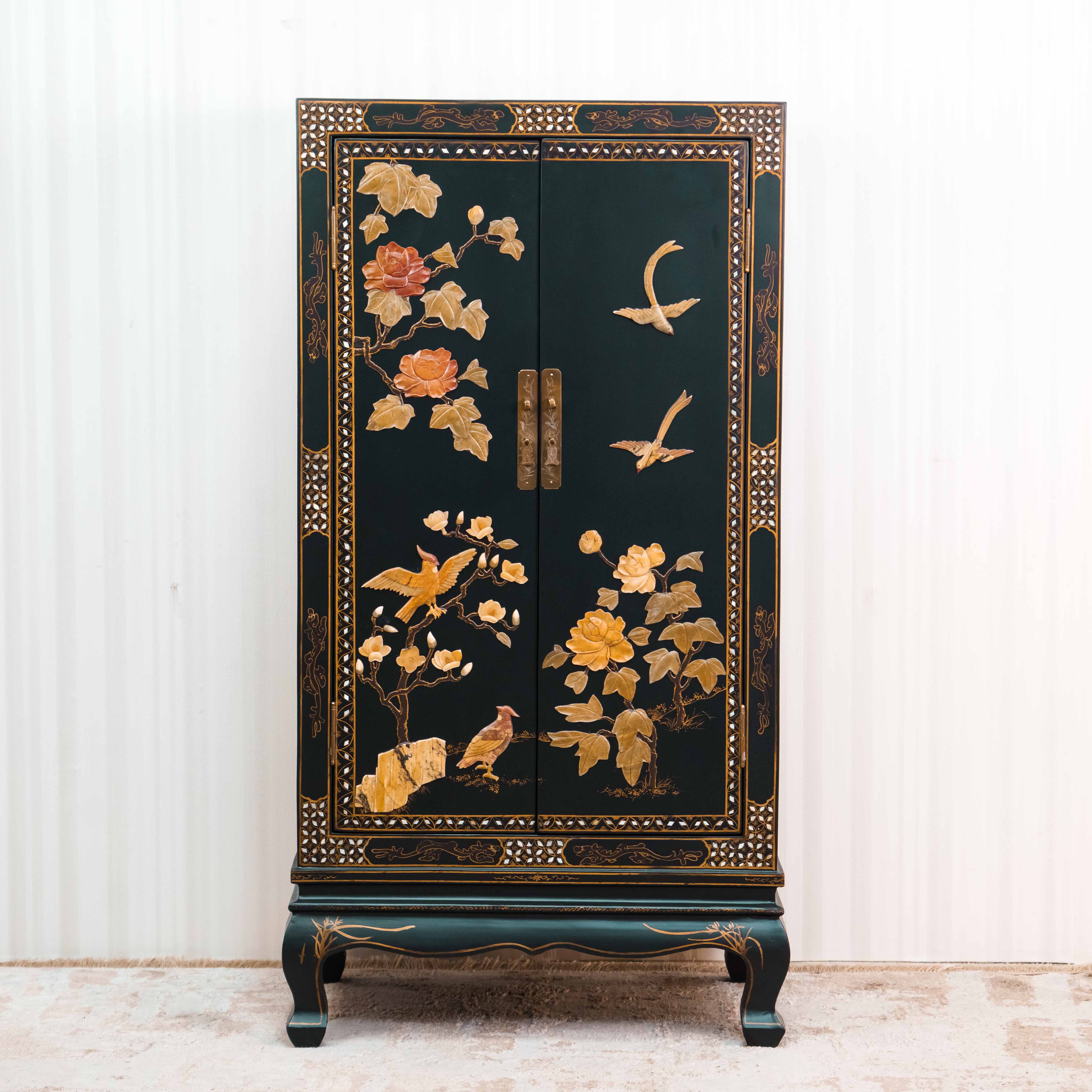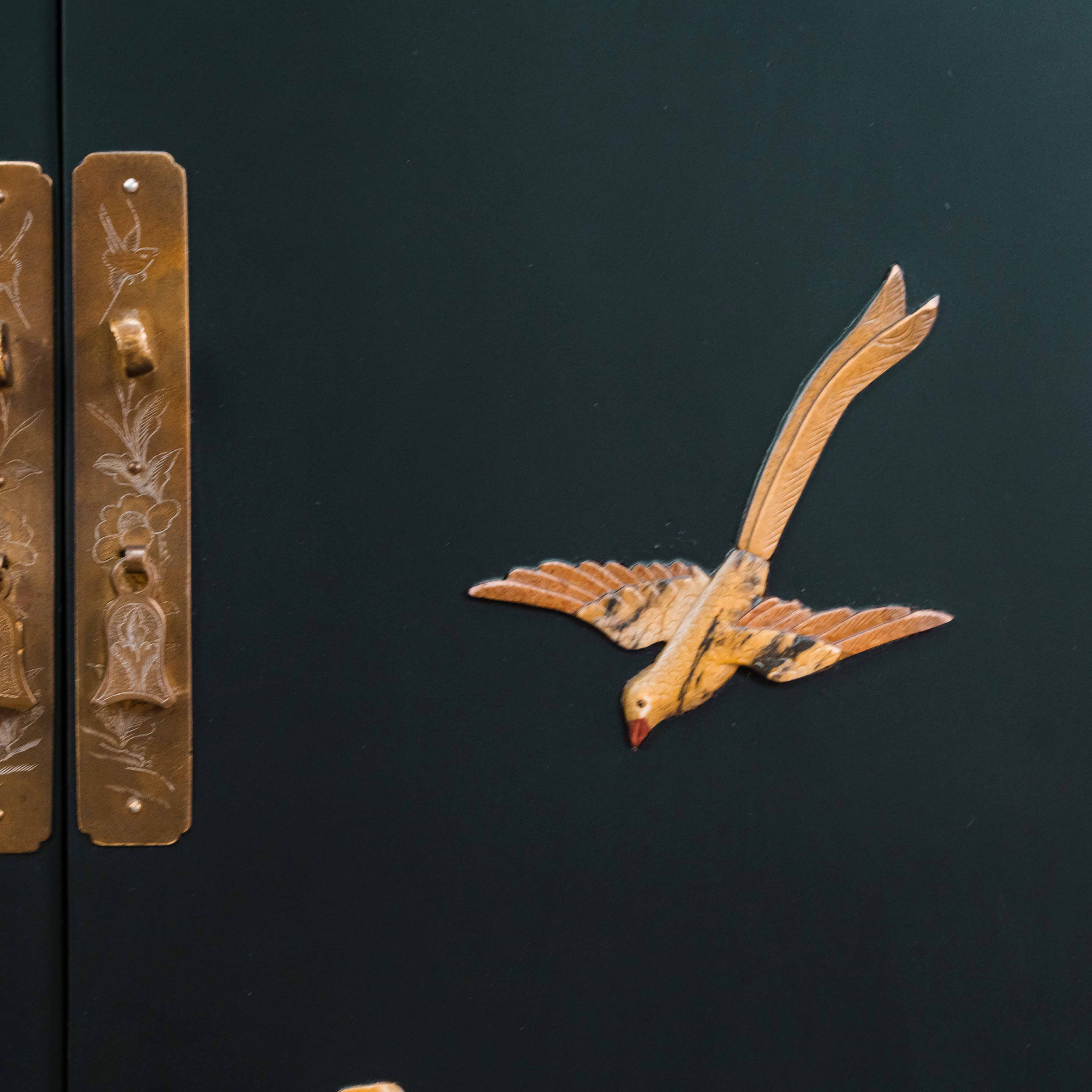 Этот антикварный двухдверный шкаф представляет собой выдающийся образец восточного искусства в стиле шинуазри, выполненный из дерева с глубоким черным лаковым покрытием. Главным украшением предмета является богатая многоцветная инкрустация или роспись, занимающая почти всю поверхность фасадов и изображающая традиционные природные мотивы: грациозных птиц в полете, цветущие деревья и пышные пионы. Декоративные элементы выполнены в теплых золотистых, кремовых и красноватых тонах, что создает выразительный контраст с темным фоном корпуса. По периметру дверей и вдоль кромок шкафа нанесен сложный геометрический и растительный орнамент, который служит декоративной рамкой для центральной композиции. В центре, на стыке дверей, расположены лаконичные вертикальные металлические ручки-пластины. Шкаф установлен на невысокое основание с элегантно изогнутыми ножками, также украшенными тонкими золотистыми завитками, что придает массивной конструкции визуальную легкость и завершенность.