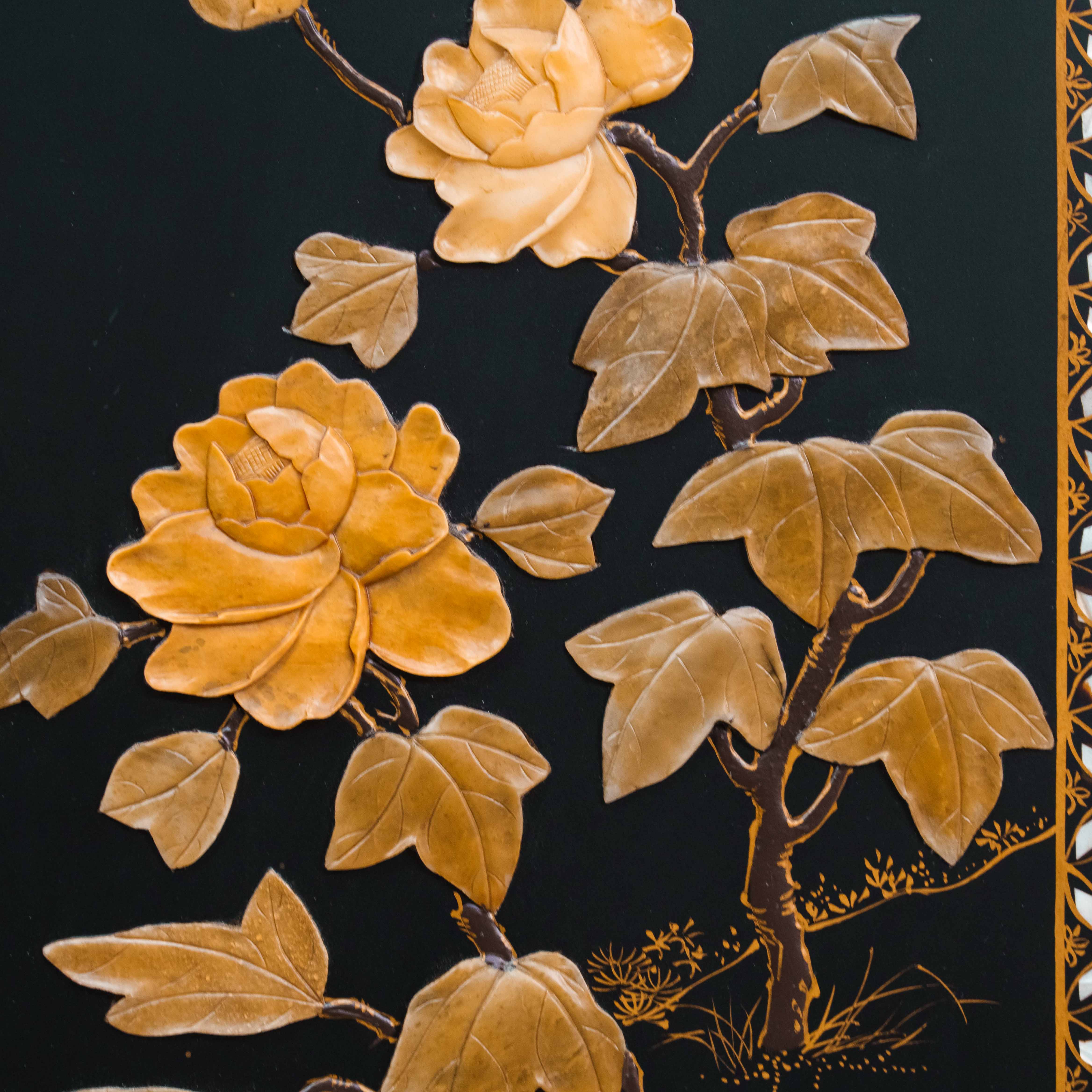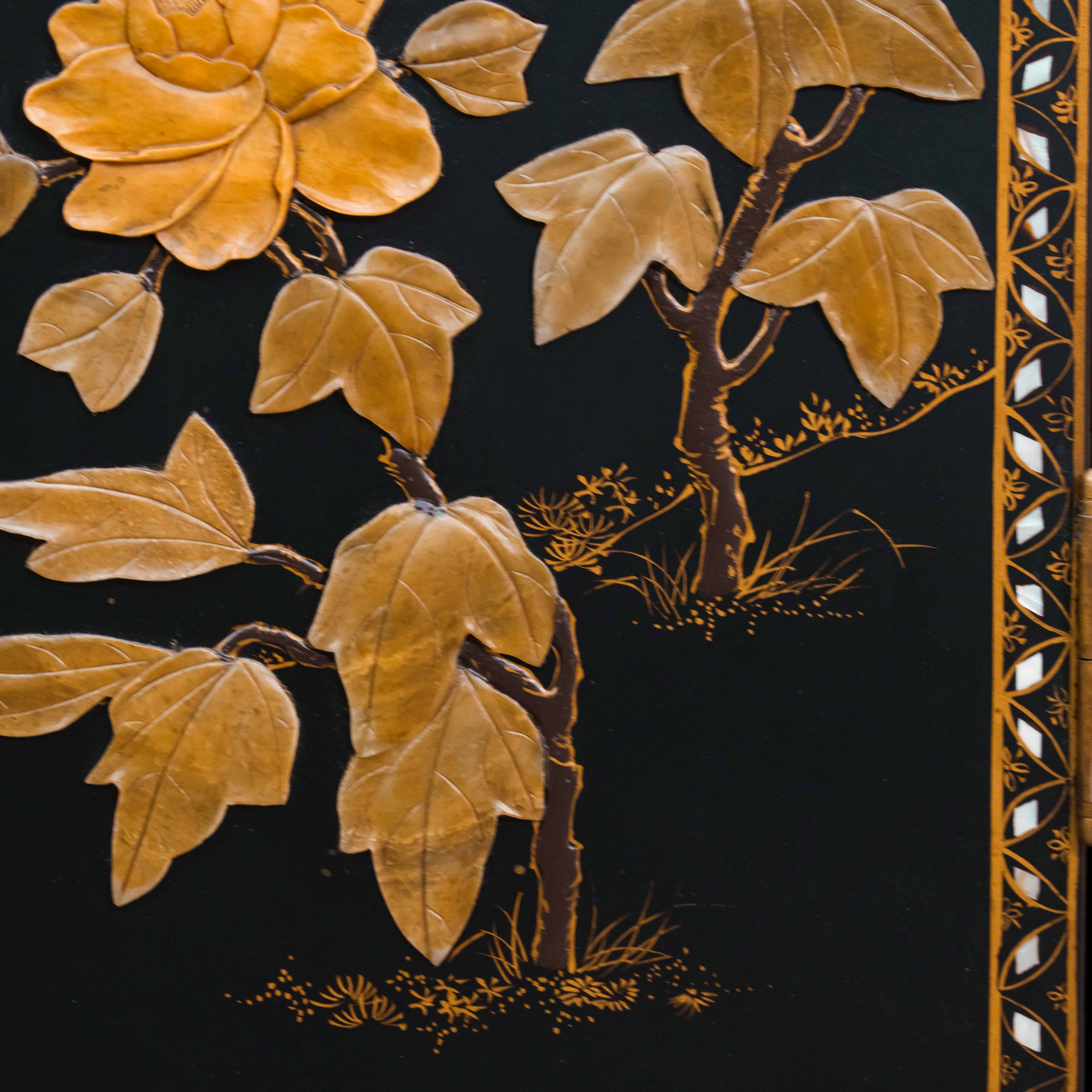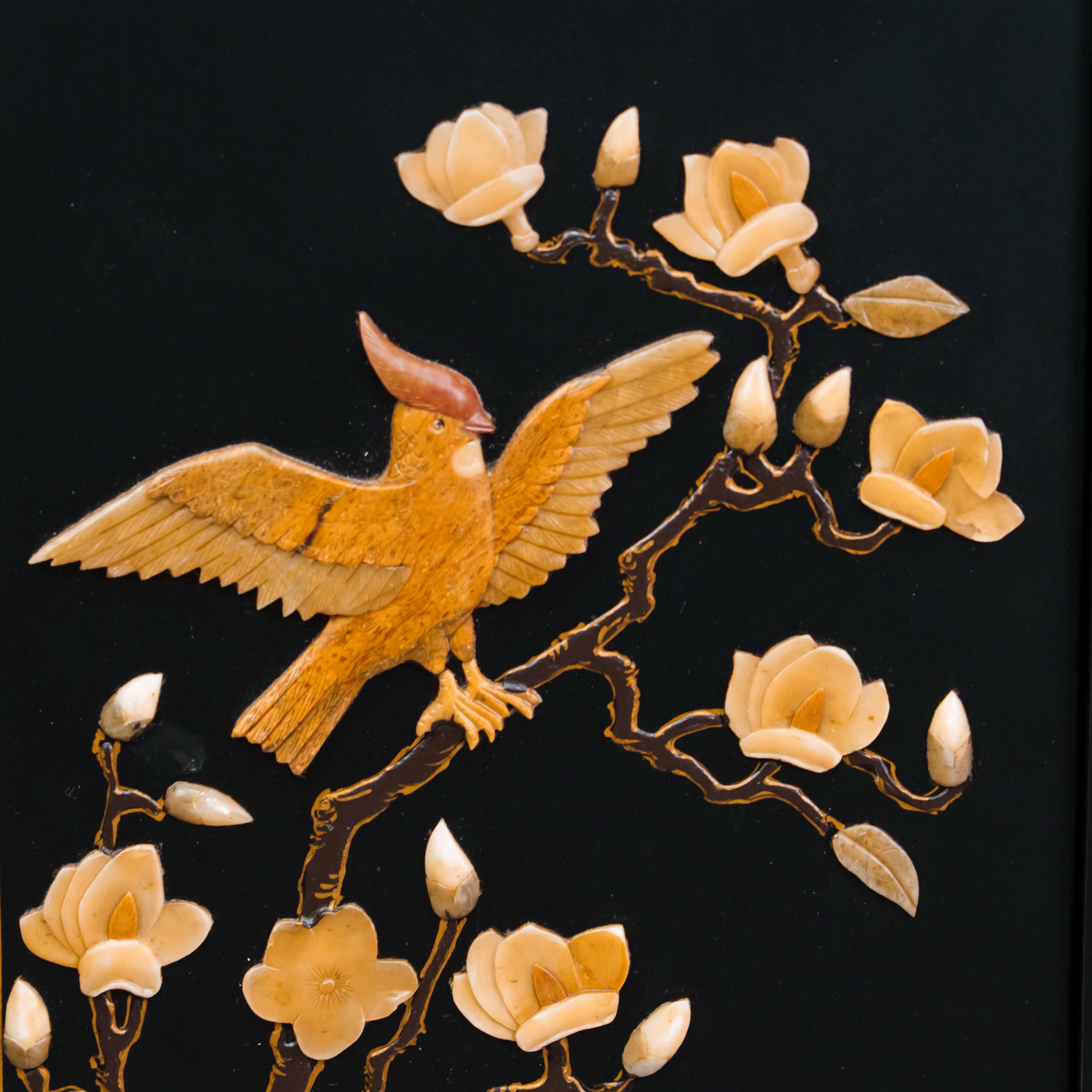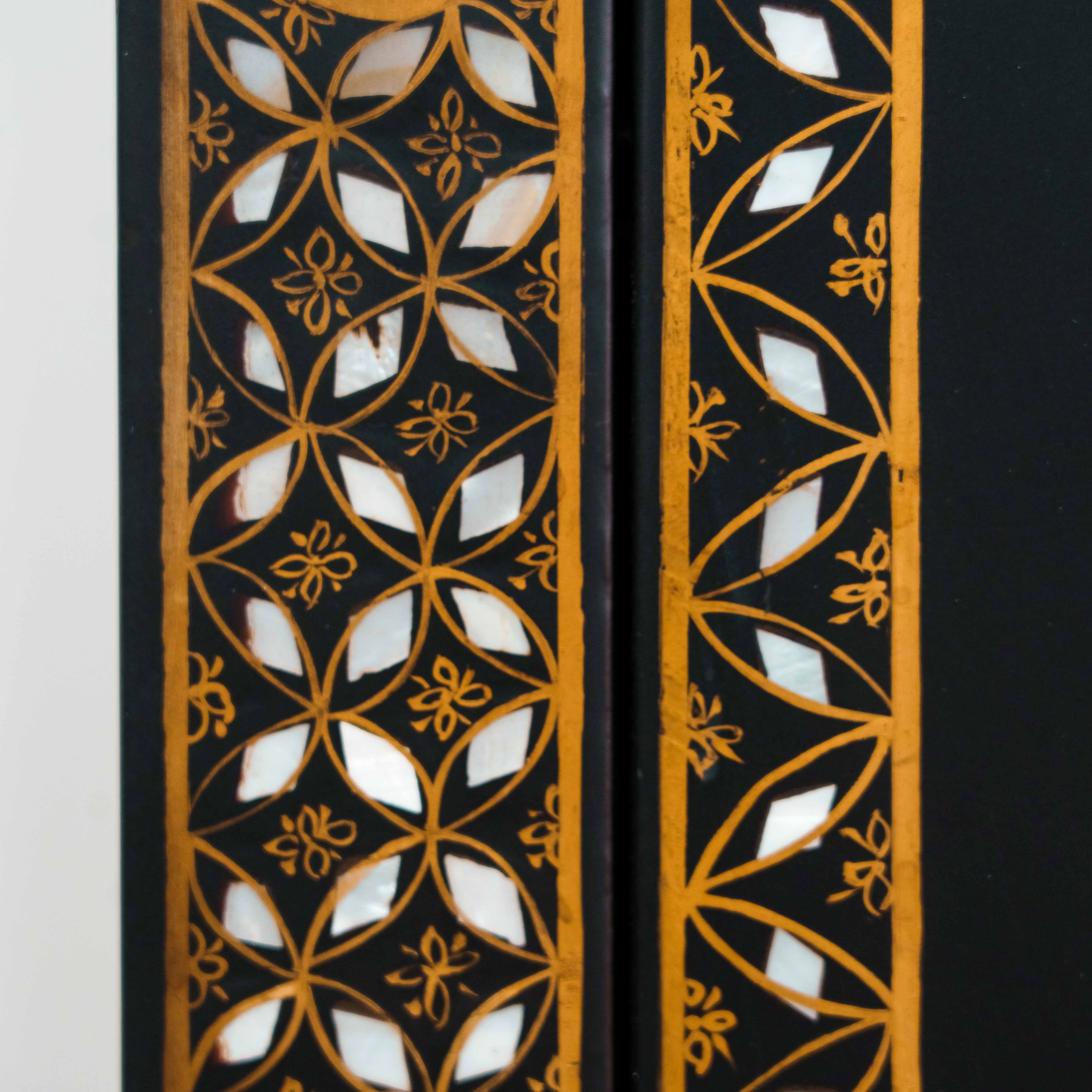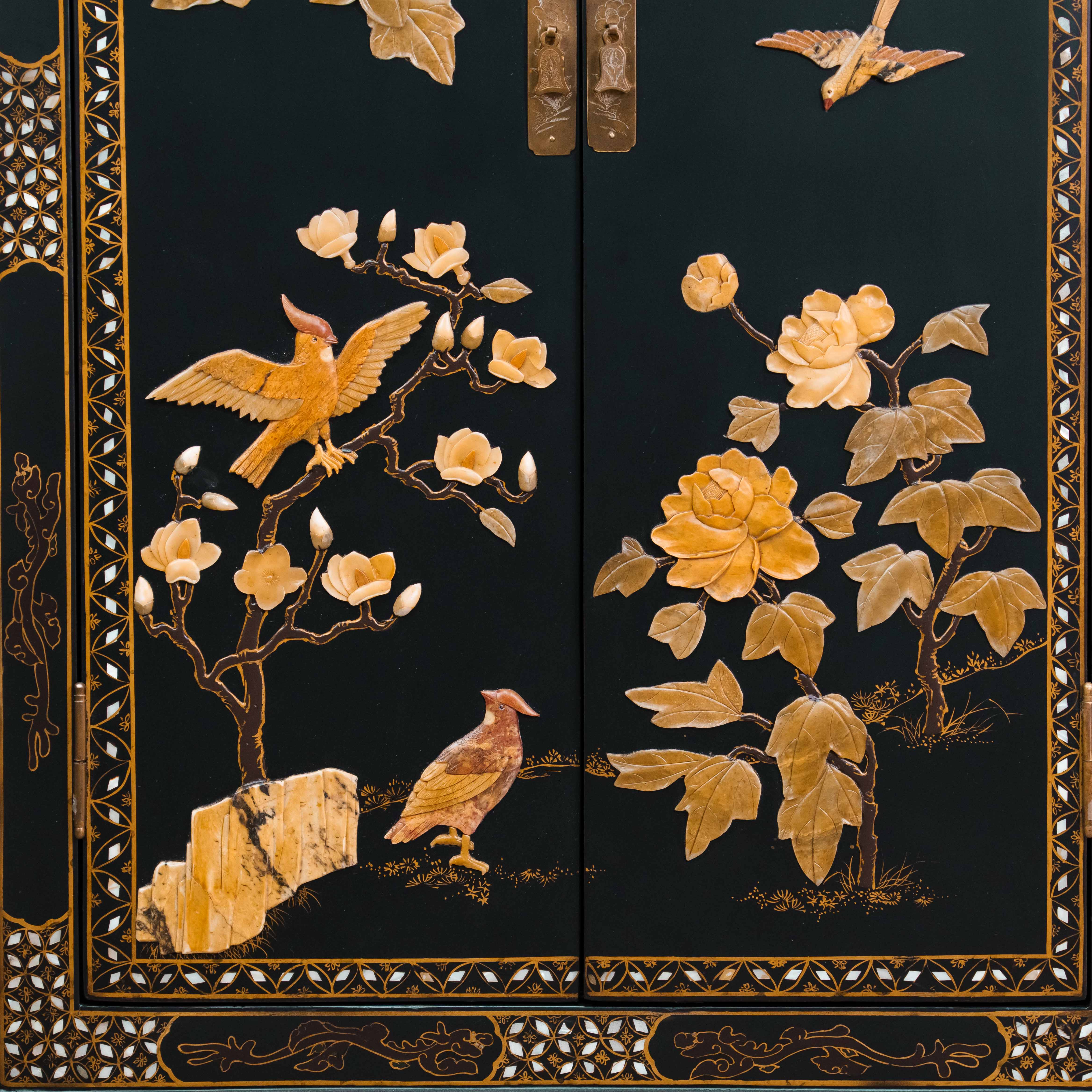 Этот антикварный двухдверный шкаф представляет собой выдающийся образец восточного искусства в стиле шинуазри, выполненный из дерева с глубоким черным лаковым покрытием. Главным украшением предмета является богатая многоцветная инкрустация или роспись, занимающая почти всю поверхность фасадов и изображающая традиционные природные мотивы: грациозных птиц в полете, цветущие деревья и пышные пионы. Декоративные элементы выполнены в теплых золотистых, кремовых и красноватых тонах, что создает выразительный контраст с темным фоном корпуса. По периметру дверей и вдоль кромок шкафа нанесен сложный геометрический и растительный орнамент, который служит декоративной рамкой для центральной композиции. В центре, на стыке дверей, расположены лаконичные вертикальные металлические ручки-пластины. Шкаф установлен на невысокое основание с элегантно изогнутыми ножками, также украшенными тонкими золотистыми завитками, что придает массивной конструкции визуальную легкость и завершенность.