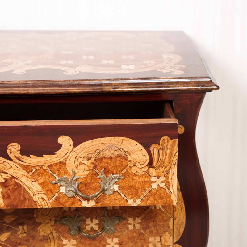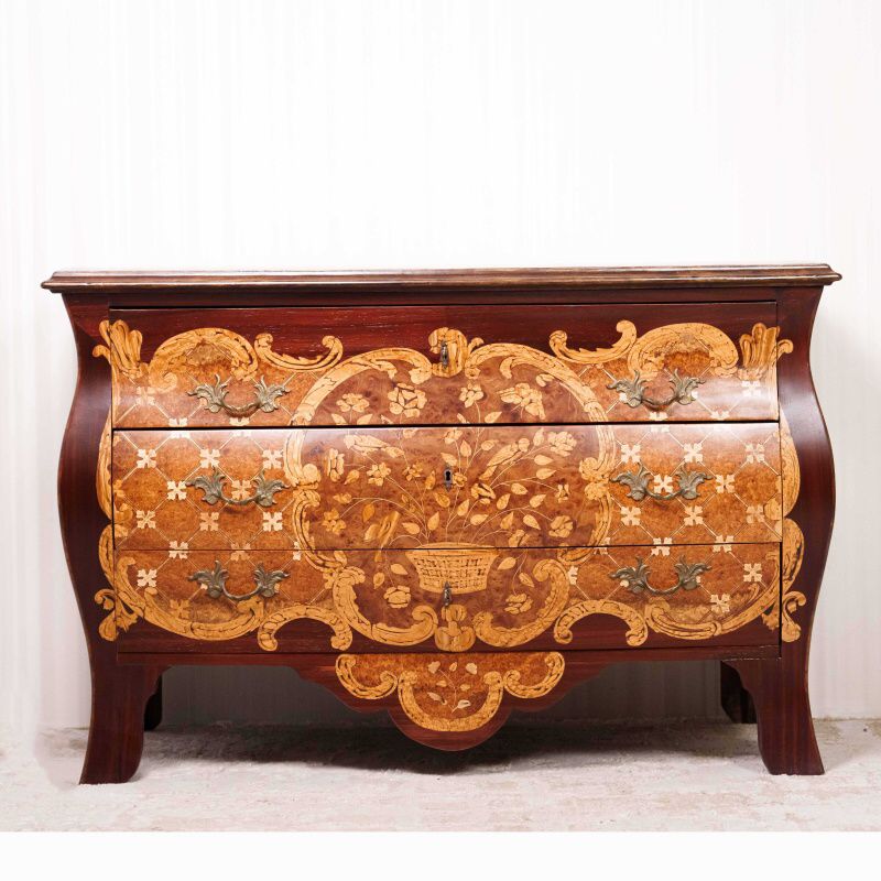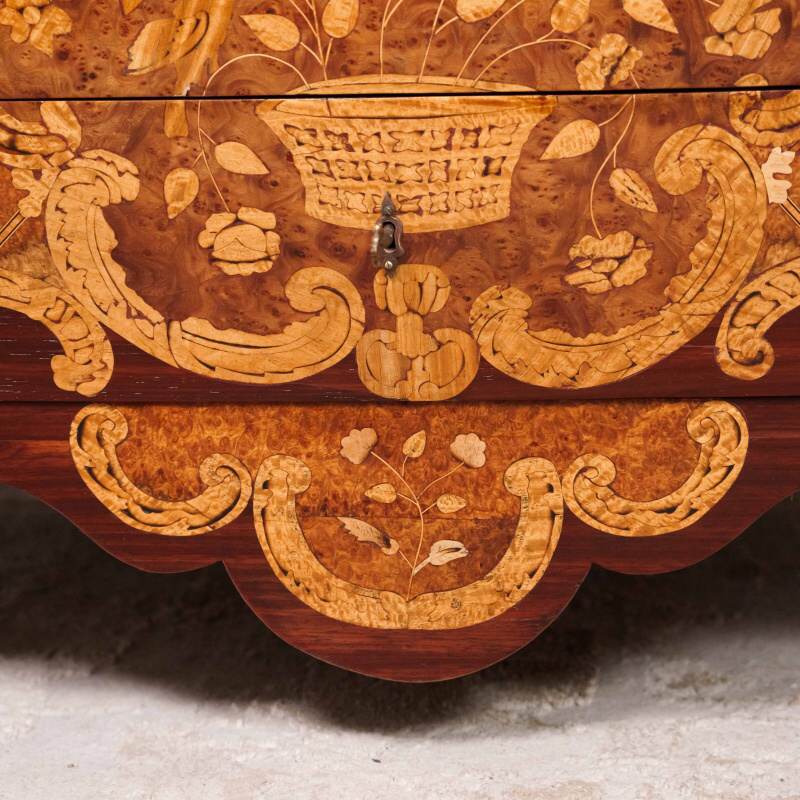 Комод выполнен из ценных пород древесины, таких как орех, палисандр или махагони, с изысканной инкрустацией шпоном различных оттенков. Фасад украшен богатым маркетри — художественной мозаикой из дерева, изображающей пышный букет цветов в вазе, обрамлённый сложными завитками и орнаментами в виде аканта, гирлянд и рокайлей.