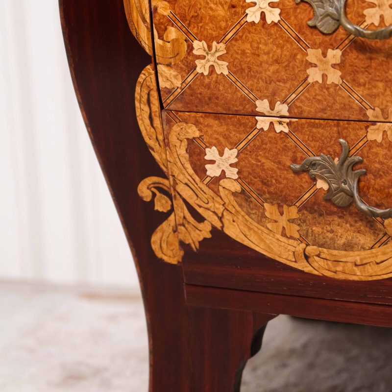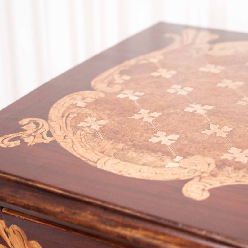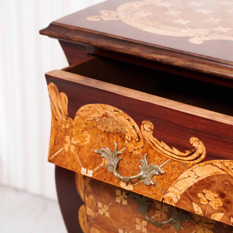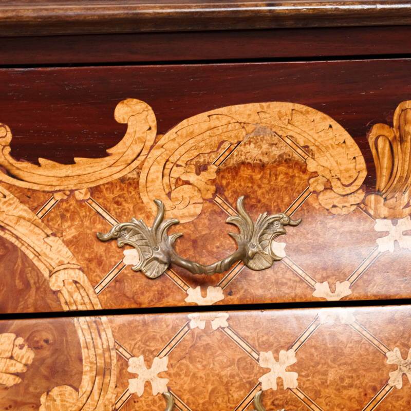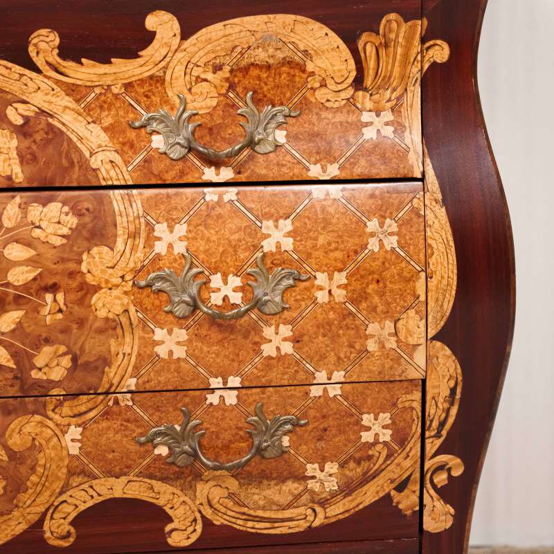 Подобные комоды были символом богатства и утончённого вкуса, нередко украшали будуары, салонные комнаты или дворцовые интерьеры. Каждый элемент — от формы до узора — подчёркивает стремление к роскоши и гармонии.