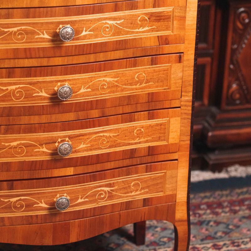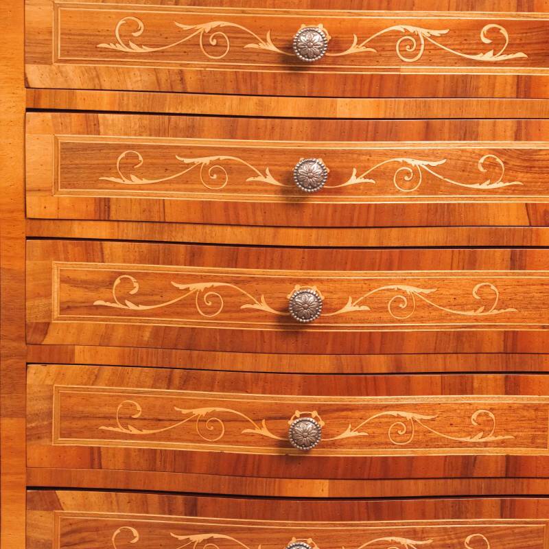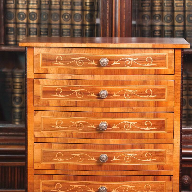 Такой комод предназначался для хранения белья, мелких предметов или бумаг и мог занимать достойное место как в гостиной, так и в спальне или кабинете.