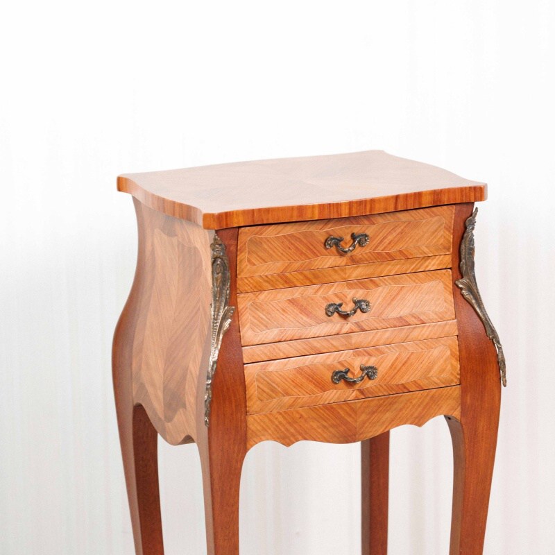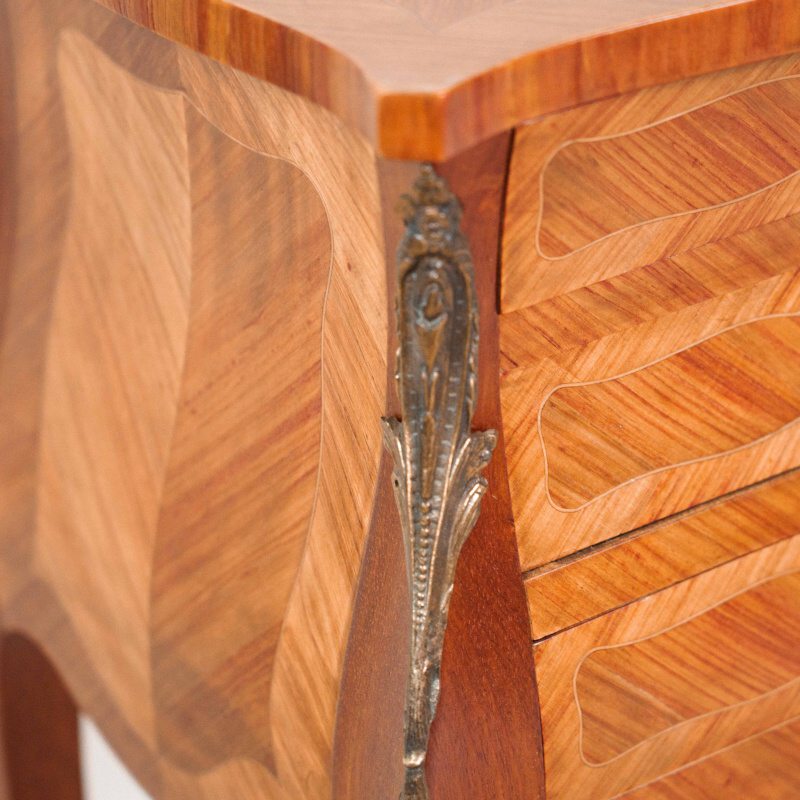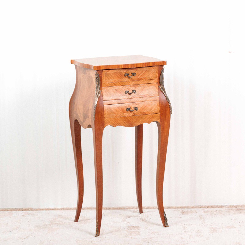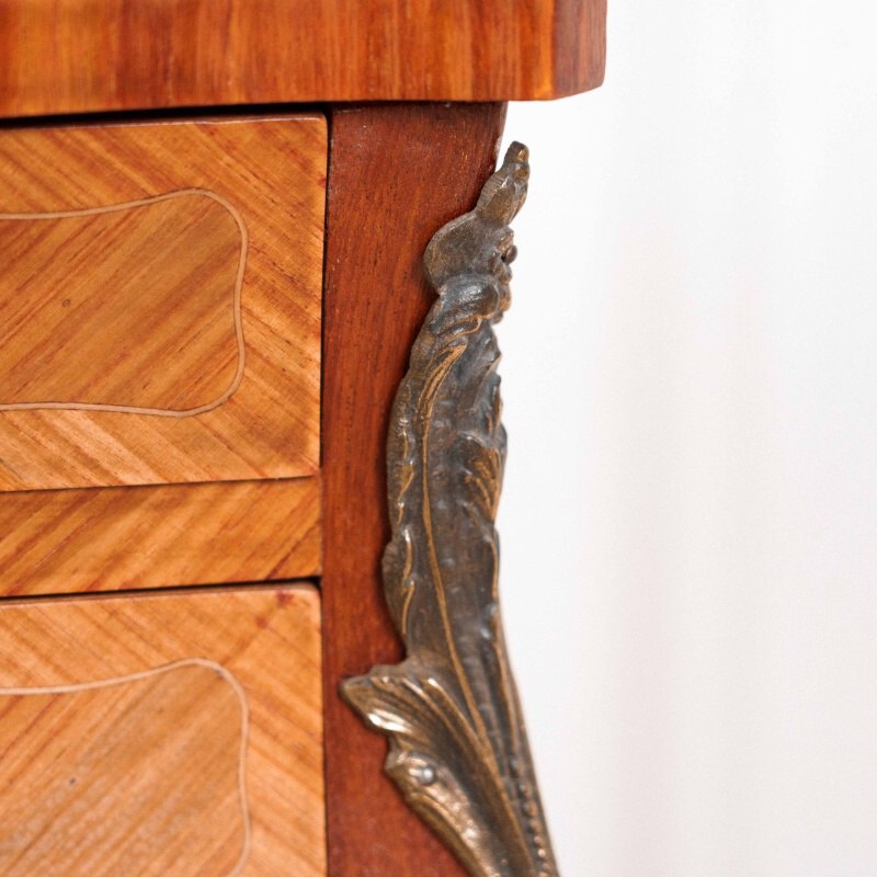На фасаде расположены три небольших выдвижных ящика, украшенных миниатюрными латунными ручками и накладками в виде рокайлей. Верхняя крышка покрыта лаком, подчеркивающим теплый оттенок дерева и благородную патину времени.