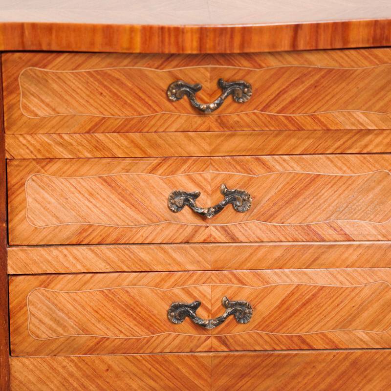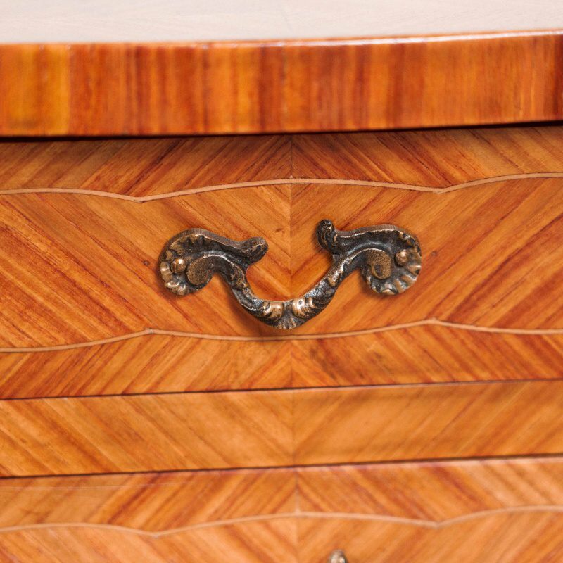 Антикварный комод в изящном французском стиле Людовика XV, выполненный из массива и шпона ценных пород древесины. Компактная форма и изогнутые линии корпуса придают ему лёгкость и утончённость, характерные для мебели XVIII-века.