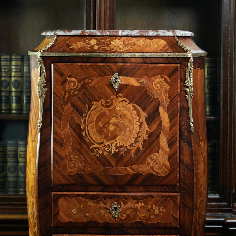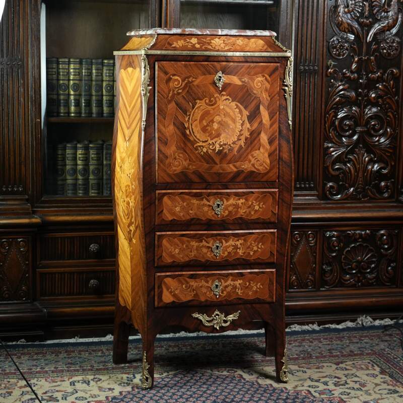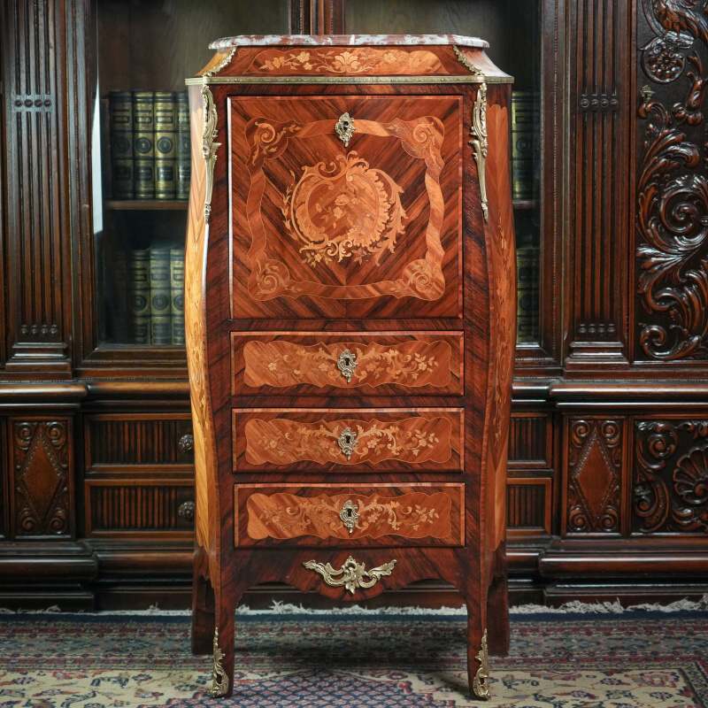 Антикварный комод-секретер выполнен в изысканной классической манере, характерной для европейской мебели XVIII–XIX веков, где главную роль играет утончённая декоративность и тщательная работа по дереву. Его корпус имеет изогнутые боковые линии и слегка расширяющуюся кверху форму, придающую изделию элегантный, струящийся силуэт. Поверхность отделана тонким наборным шпоном насыщенных пород древесины, уложенным сложным геометрическим рисунком «елочкой» и обрамлённым плавными контурами. В центральной части фасада выделяется круглая маркетри — декоративная инкрустация светлыми породами дерева, изображающая цветочный мотив с витиеватыми листьями, что подчёркивает ручную работу и высокий художественный уровень мастера.