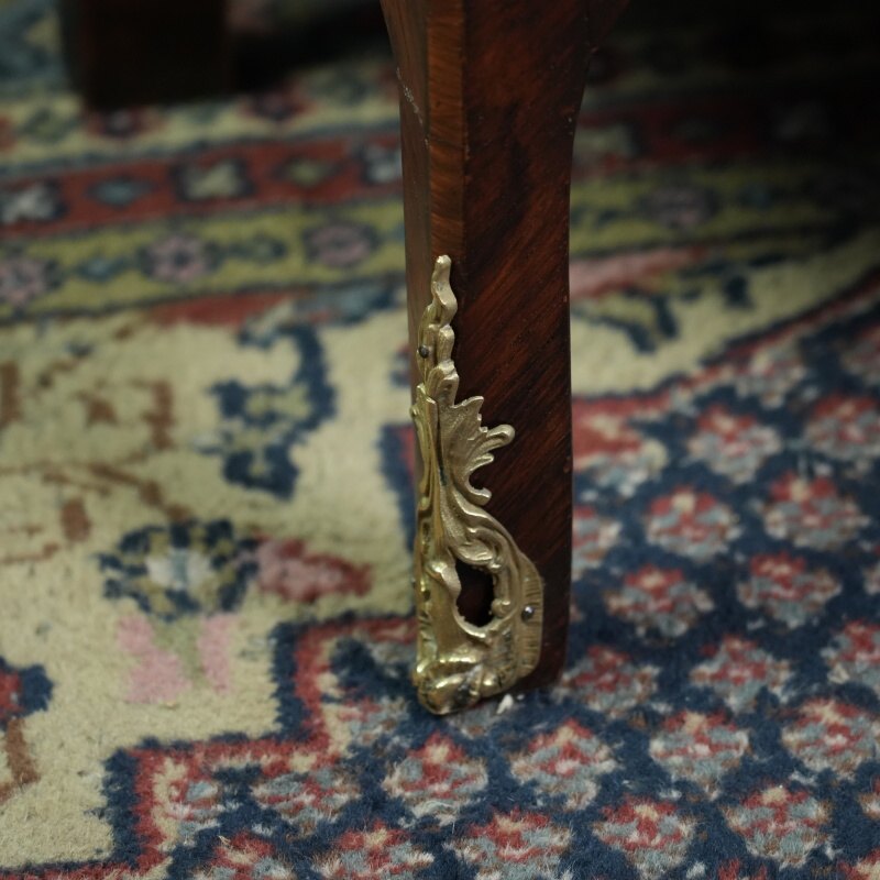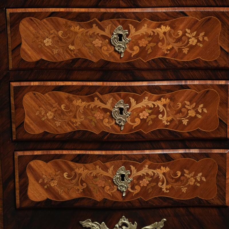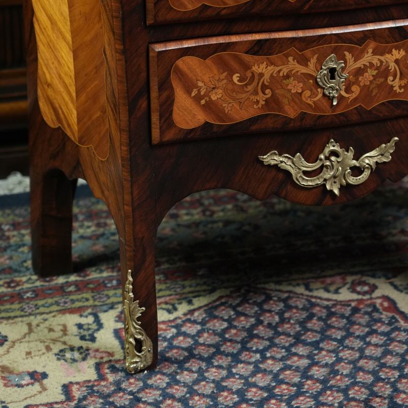 Комод состоит из нескольких выдвижных ящиков, каждый из которых украшен растительными орнаментами в технике инкрустации. Замочные скважины имеют фигурные накладки из металла, что не только подчёркивает стиль, но и добавляет предмету подлинности. Нижняя часть декорирована бронзовыми накладками в виде изящных завитков и стилизованных раковин, характерных для рокайльной эстетики. Ножки тонкие, слегка изогнутые, на концах украшены металлическими накладками, придающими устойчивость и благородный блеск. Верхняя плита комода имеет плавно загнутые края и мраморную отделку, гармонично завершающую композицию. В целом комод выглядит как роскошный предмет интерьера, созданный для аристократического дома, и сочетает в себе художественную ценность, мастерство исполнения и редкую декоративную выразительность.
