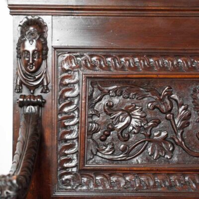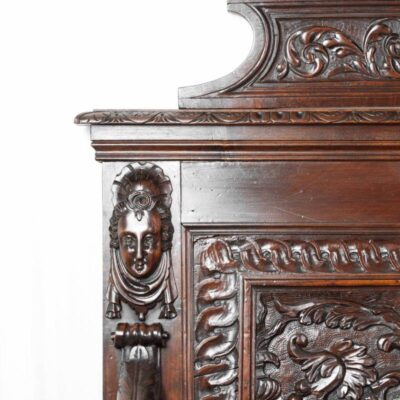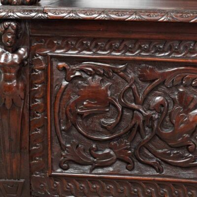 Изящный комод с богатым декором из бронзы. Фронтальные части богато украшены геометрическими узорами в технике маркетри. Элементы маркетри украшают также боковые части комода. Столешница изготовлена из натурального камня. Боковые накладки из бронзы исполнены в виде фигур воинов в старинных доспеха, что придает уникальность данному предмету.