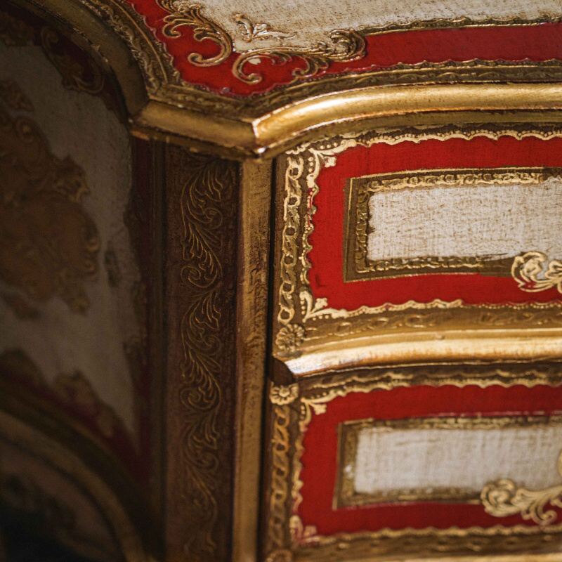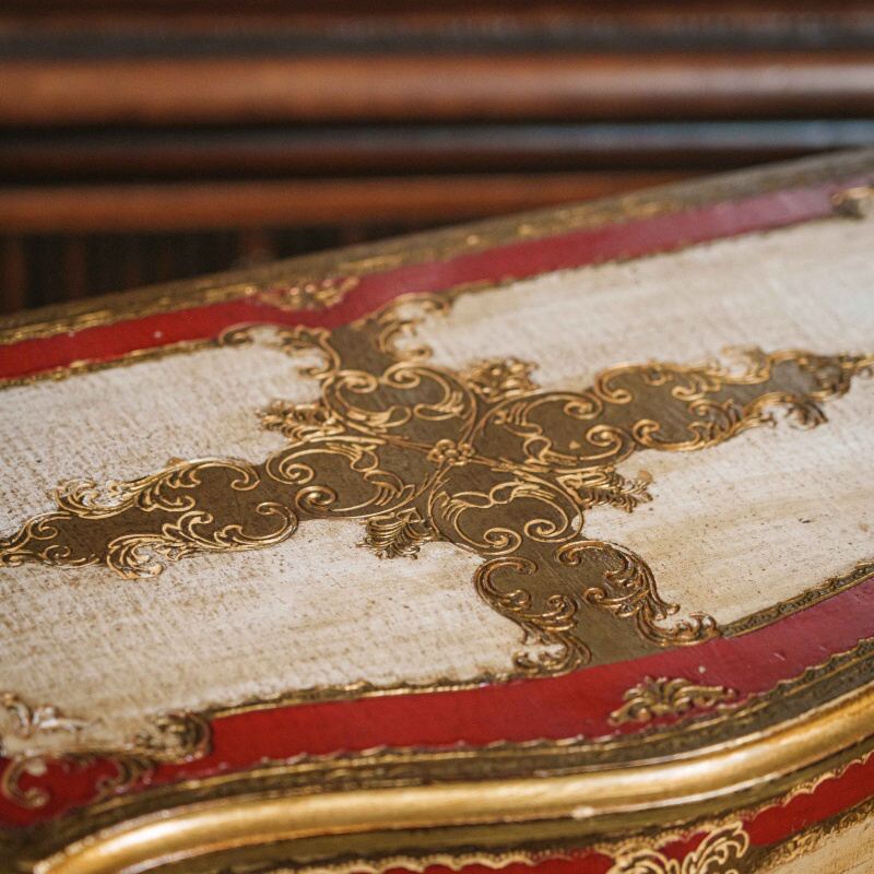 Комод во флорентийском стиле представляет собой изящное антикварное изделие, выполненное в характерной для Флоренции манере декоративной росписи и изогнутых силуэтов. Его корпус имеет волнообразный профиль с мягко выгнутой линией крышки и фасада, подчёркивающий барочную пластичность и плавность формы. Верхняя плоскость комода богато украшена традиционной флорентийской полихромной отделкой: на светлом фоне выделяются яркие красные и золотые орнаментальные поля, выполненные в технике имитации золочёной мозаики и старинной лаковой росписи. Эти орнаменты создают ощущение изысканности и ручной художественной работы, напоминающей изделия флорентийских мастерских XX века.