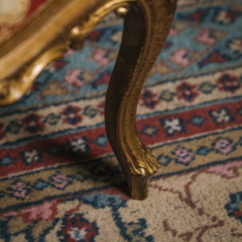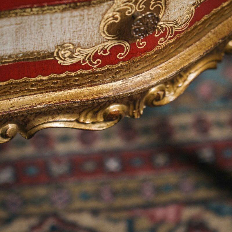 Комод стоит на высоких изогнутых ножках кабриоль, что визуально делает его лёгким и изящным, несмотря на насыщенность декора. В целом предмет производит впечатление декоративного объекта, созданного скорее для украшения интерьера, чем для активного использования. Он типичен для флорентийской мебели середины XX века, выполненной в стиле «Firenze» — сочетание резных мягких линий, пастельной росписи, золочёных акцентов и эффектных декоративных поверхностей.