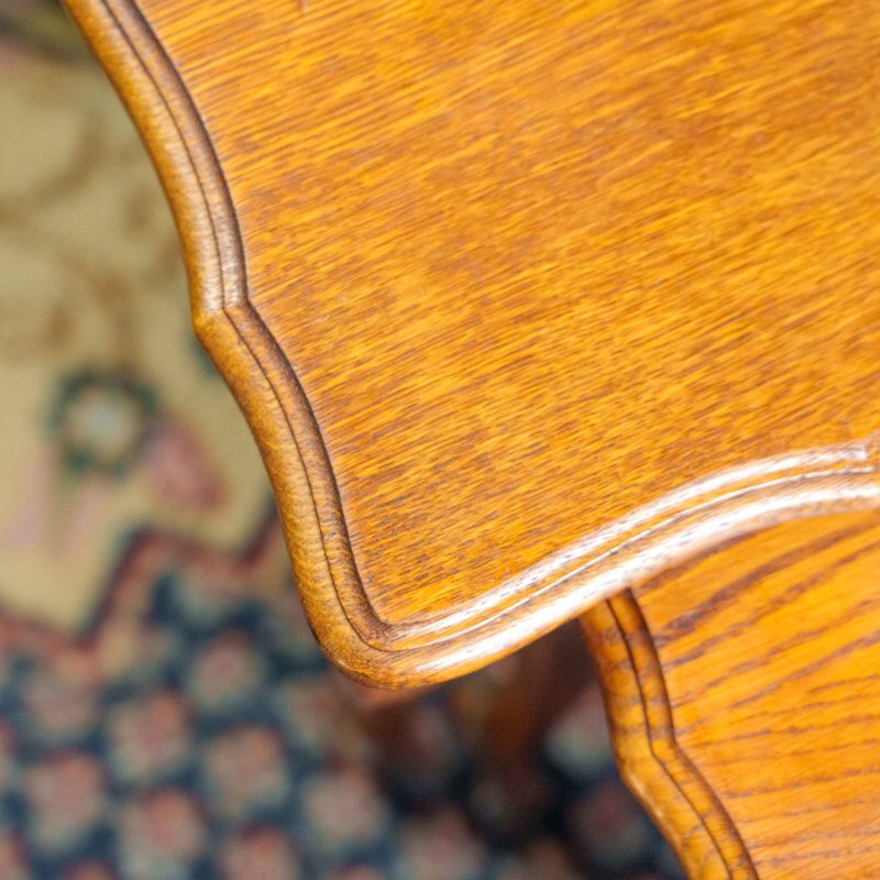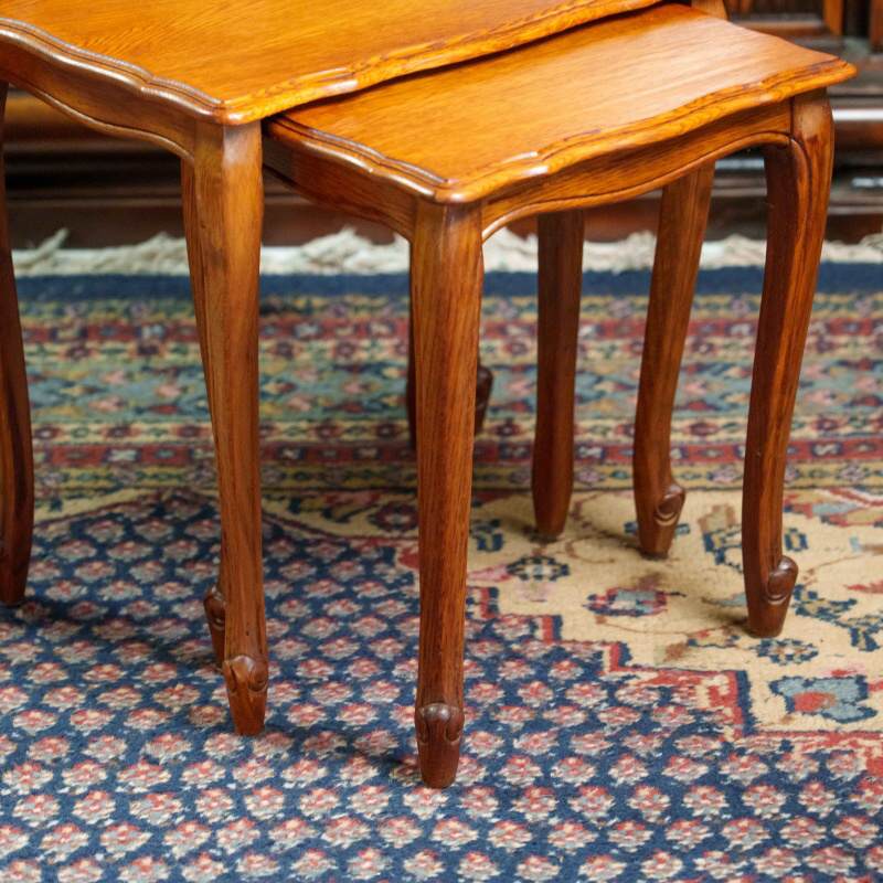 Каждый столик имеет прямоугольную столешницу с изящным волнистым краем, подчеркивающим утончённость форм. Конструкция опирается на изогнутые ножки кабриоль с плавным изгибом и характерными завитками у основания, что является отличительной чертой стиля.