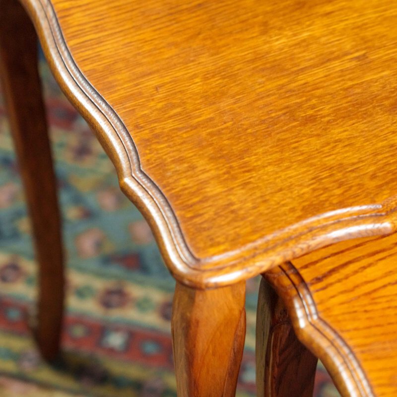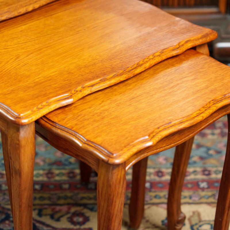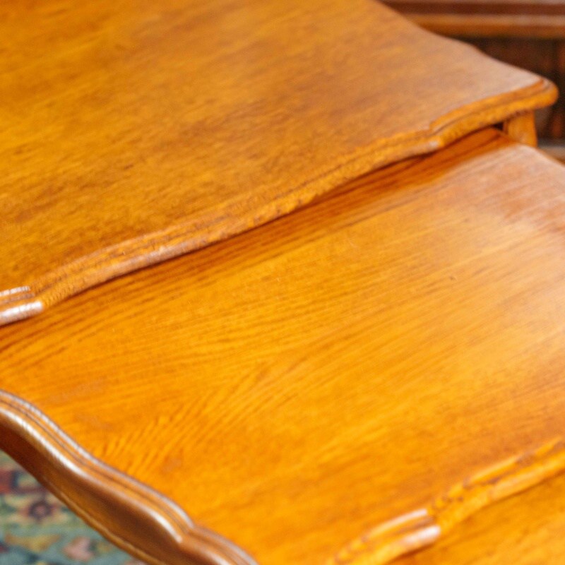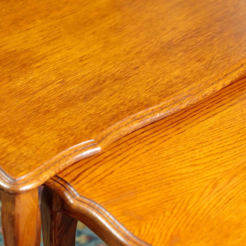Столики выполнены из дерева тёплого оттенка, поверхность отполирована и подчёркивает естественную текстуру древесины. Комплект отличается функциональностью: столики могут использоваться как по отдельности, так и в сложенном виде, экономя пространство. Изделия представляют собой гармоничное сочетание практичности и декоративной выразительности, характерной для английской мебели XVIII века.