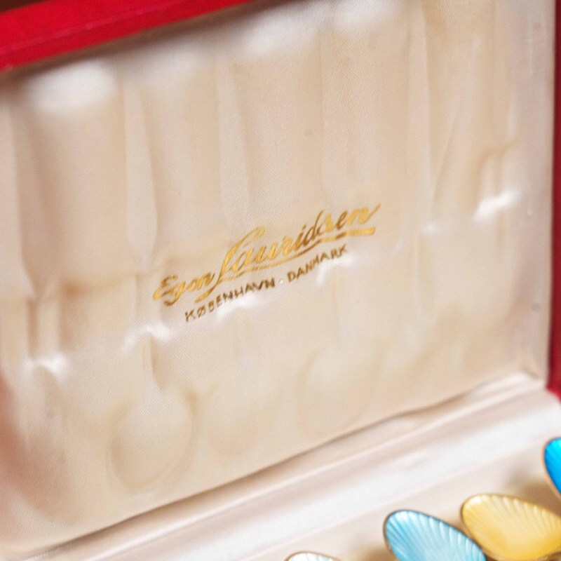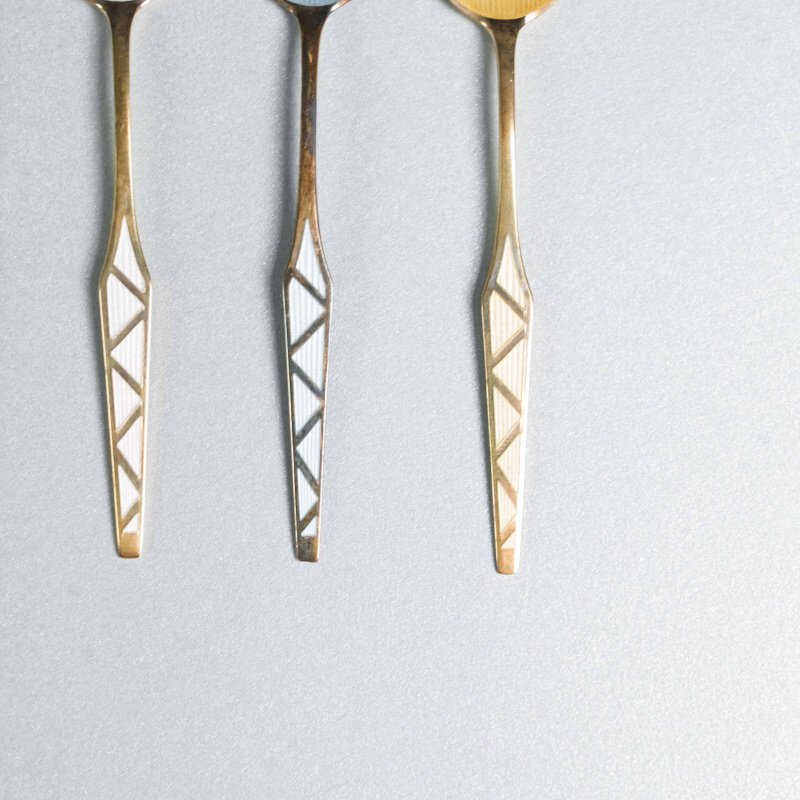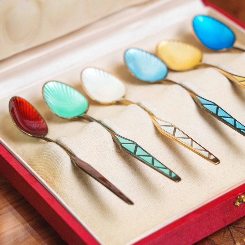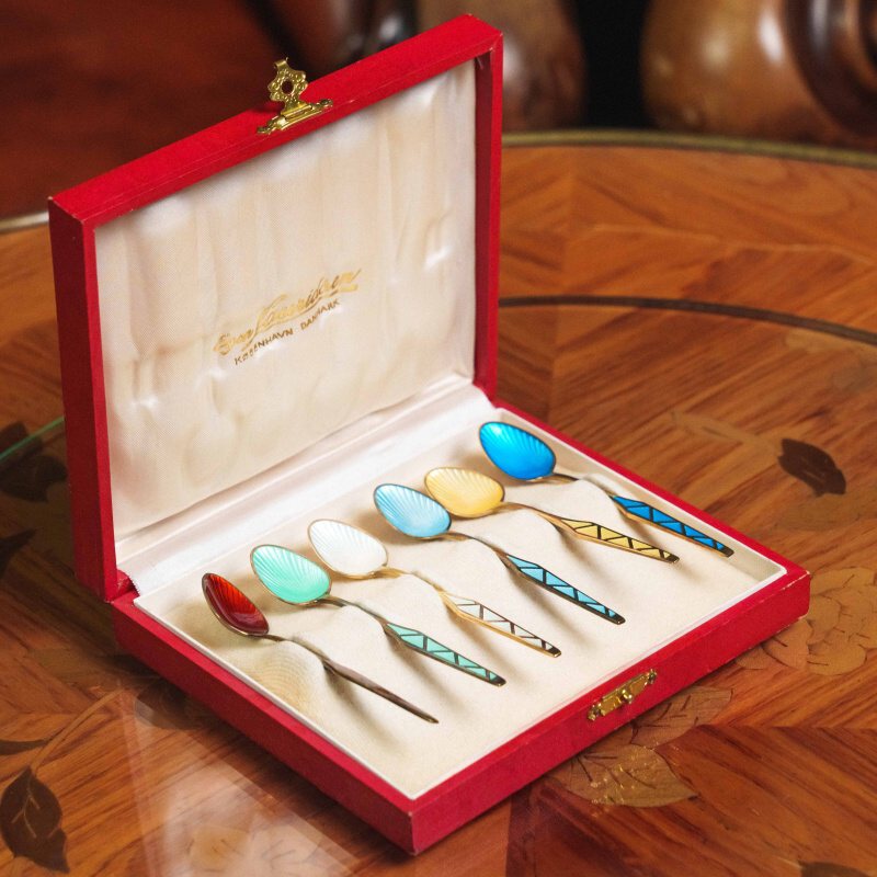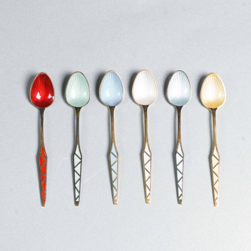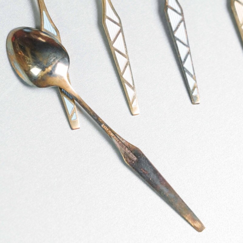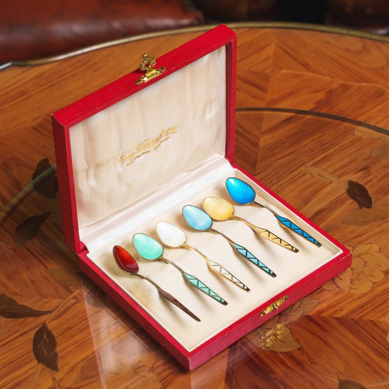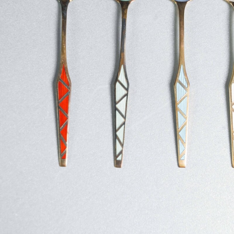 Ложки выполнены из серебра 925 пробы с позолотой и украшены полихромной прозрачной эмалью нежных оттенков — от глубокого красного до небесно-голубого и золотистого. Каждая ложка декорирована геометрическим орнаментом на ручке и рельефным рисунком раковины в чашечке, характерным для датского модерна середины XX века. Изделия отличаются утончённостью формы, высоким качеством эмали и безупречной ювелирной техникой, присущей мастерской Lauridsen, одной из ведущих в Копенгагене своего времени. Комплект представлен в оригинальной футлярной коробке.