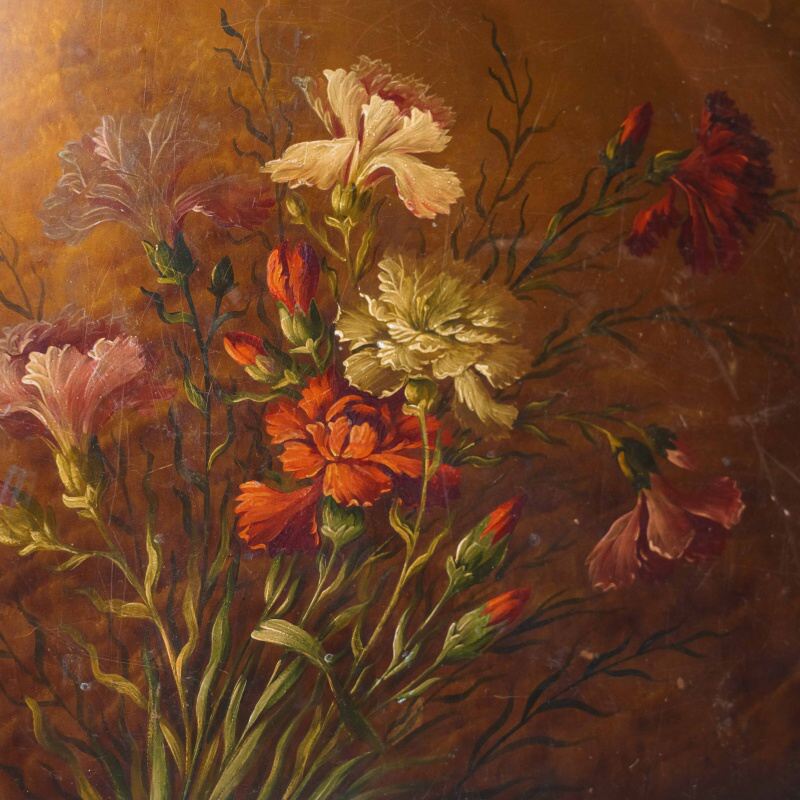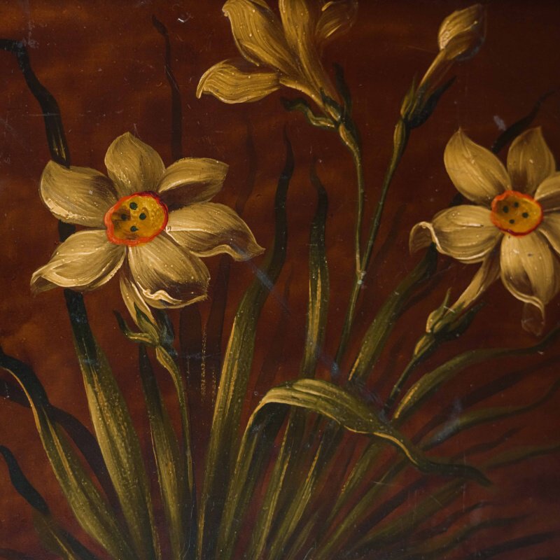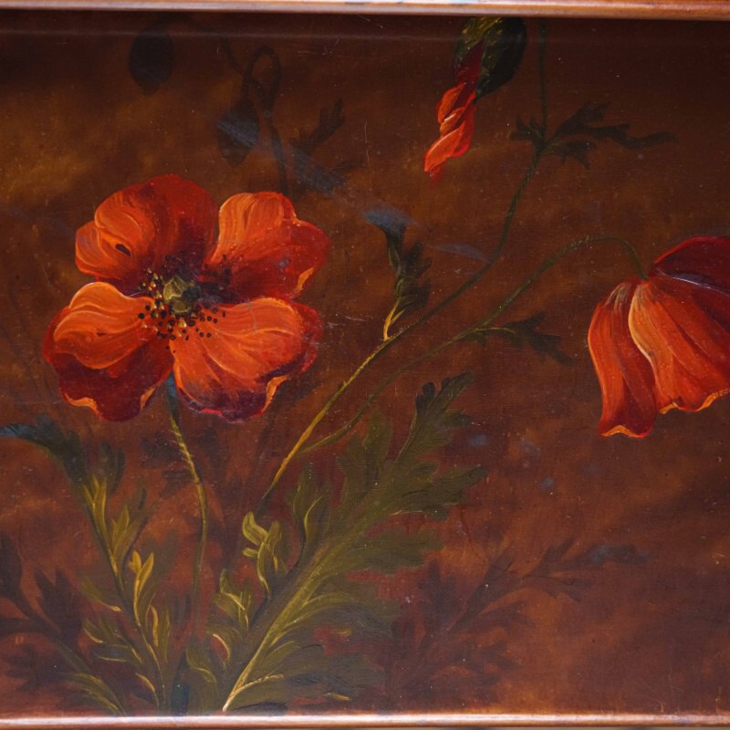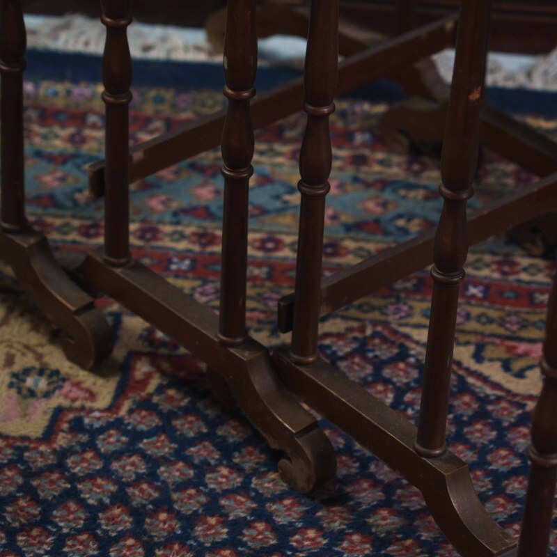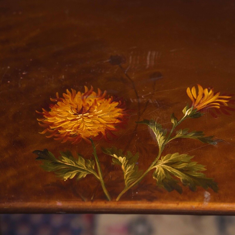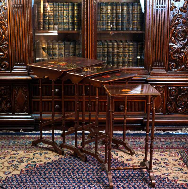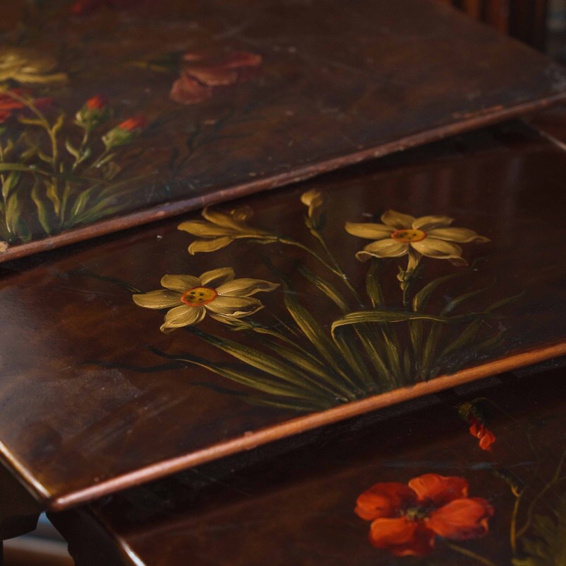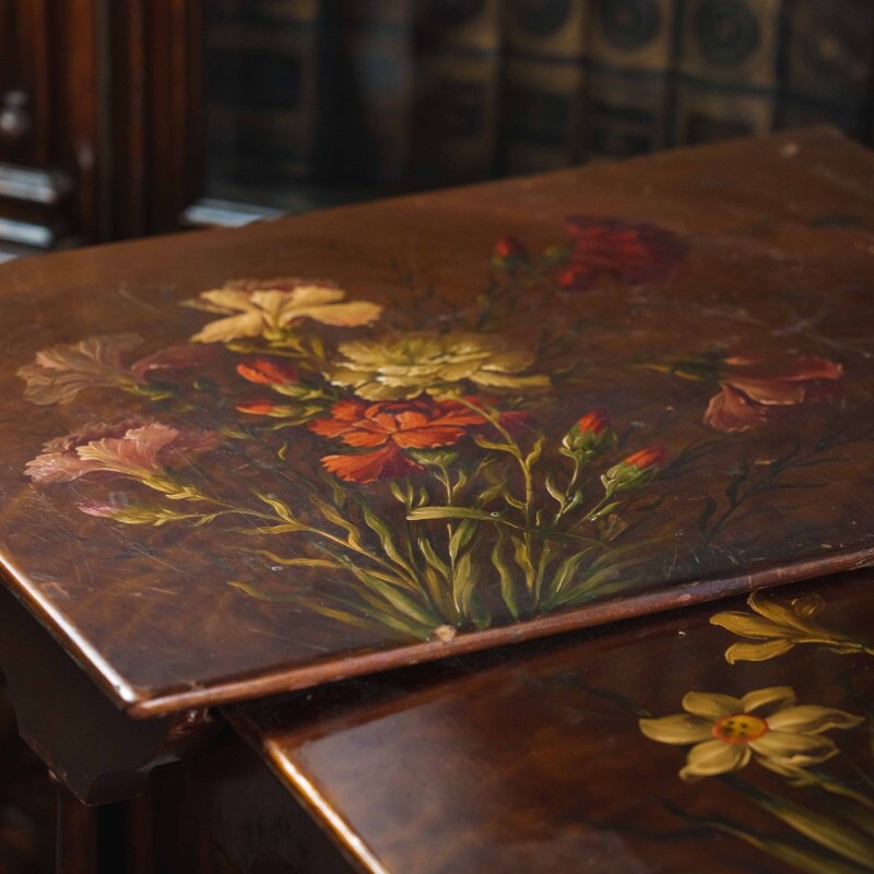Столешницы выполнены из дерева и украшены декоративной росписью с флористическими мотивами в тёплой цветовой гамме, что придаёт мебели особый шарм и художественную ценность. Ножки стройные, точёные, соединённые фигурными перекладинами, что усиливает устойчивость конструкции и подчёркивает мастерство исполнения.