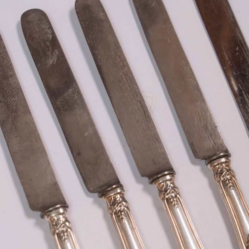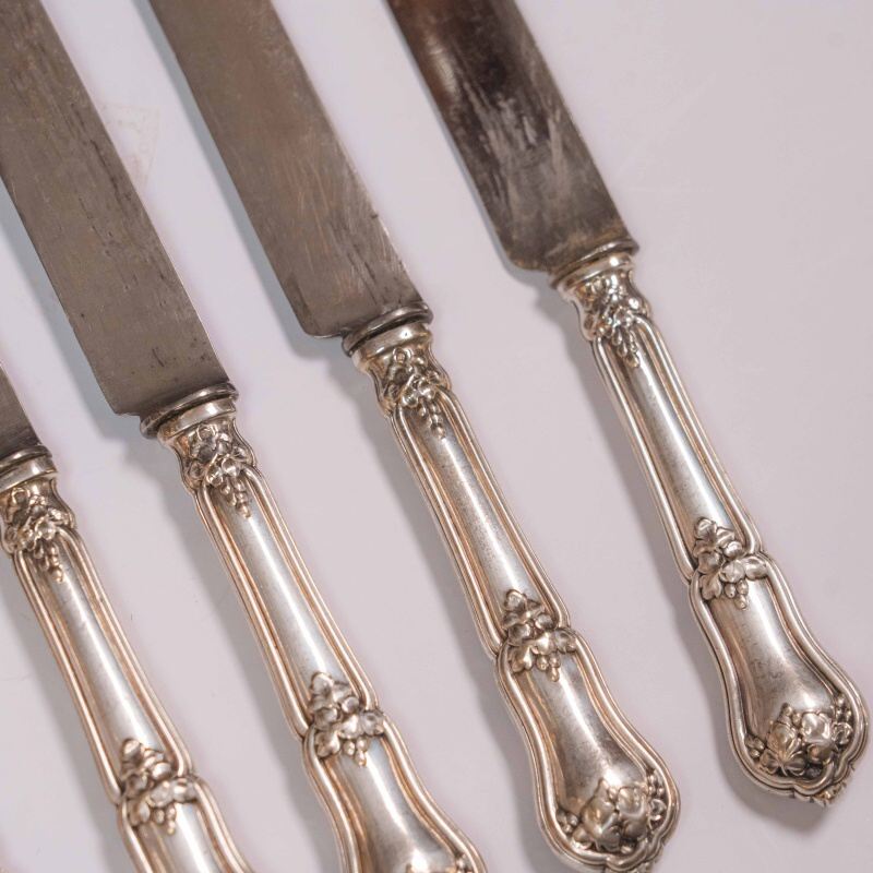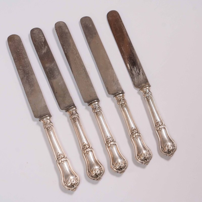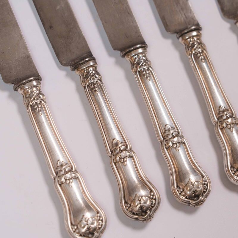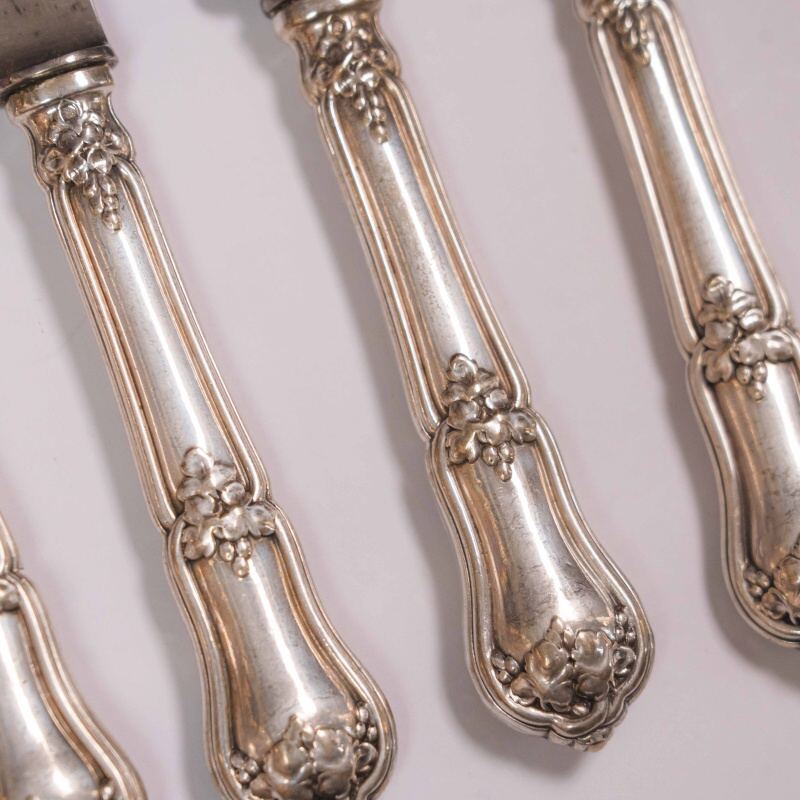 В ассортименте представлены антикварные, винтажные столовые ножи Christofle в количестве 5 штук, выполненными в характерном для бренда стиле с орнаментированными посеребренными рукоятками.