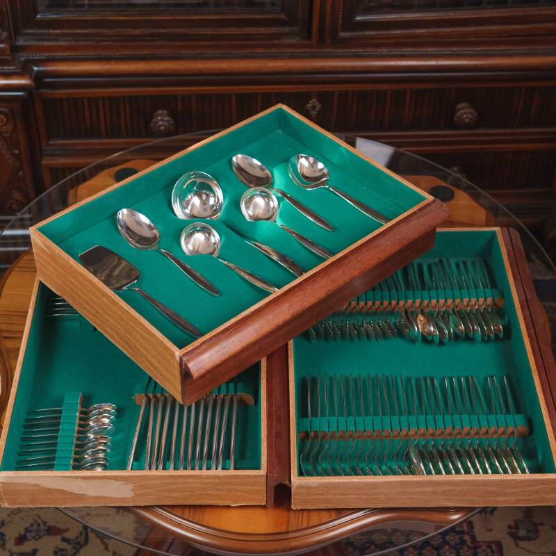 Комплект содержит 96 основных предметов и 7 вспомогательных: столовые ложки, вилки и ножи, десертные и чайные приборы и сервировочные приборы. Такой состав позволяет использовать комплект как для повседневной подачи, так и для полноценной сервировки праздничного стола по европейским канонам.