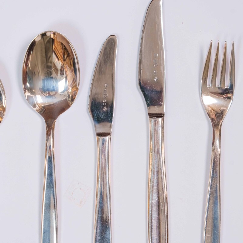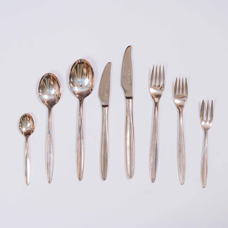 Дизайн приборов выдержан в лаконичной манере: вытянутые пропорции, мягко зауженные ручки и деликатная геометрия форм подчеркивают универсальность и аккуратный внешний вид. Отсутствие избыточного декора делает комплект уместным в любом интерьере — от классического до современного. Полированная поверхность придает приборам аккуратный блеск, усиливая ощущение чистоты и порядка на столе.