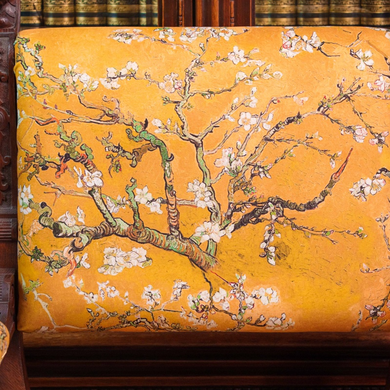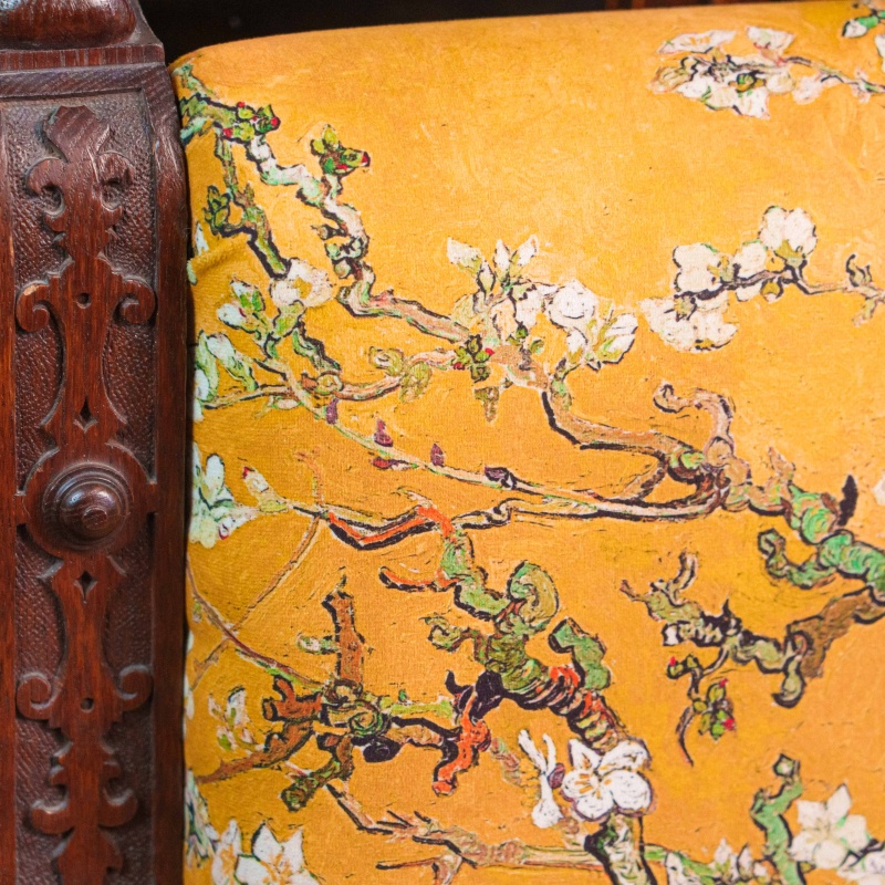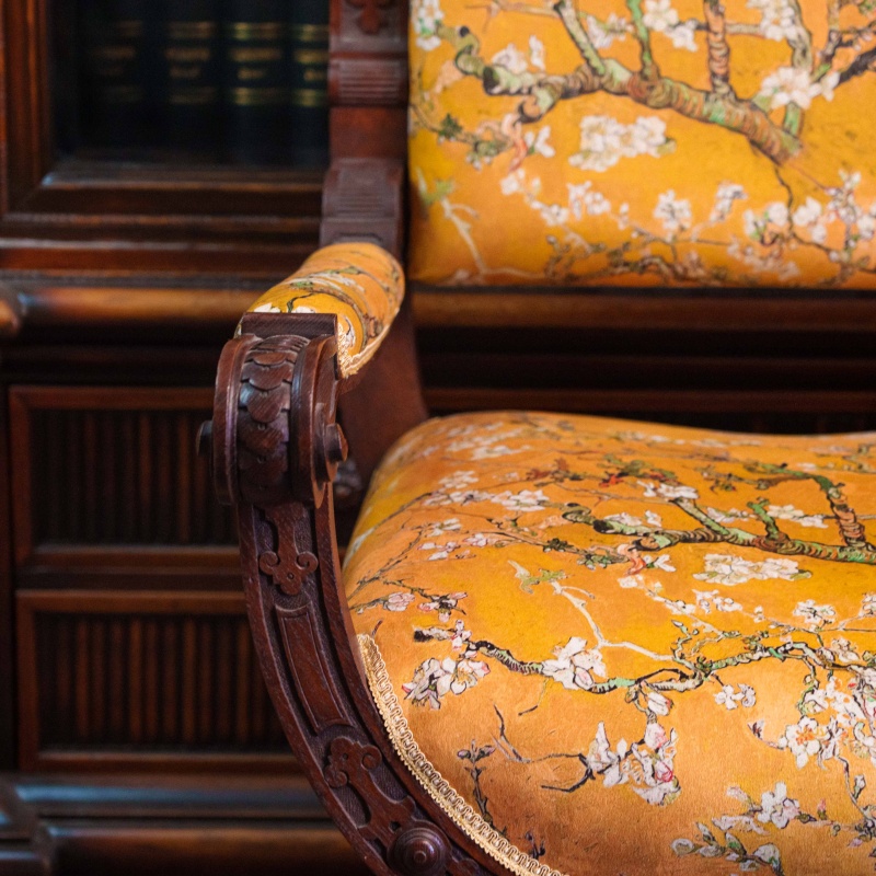 Обивка выполнена из ткани насыщенного горчично-золотистого оттенка. Материал украшен изящным цветочным орнаментом с ветвями и мелкими белыми цветами, что создаёт контраст с тёмным деревом и придаёт креслу мягкость и декоративную выразительность. Обивка аккуратно натянута, с чётко оформленной кромкой по краям сиденья и спинки. Подлокотники дополнительно смягчены тканевыми накладками.
