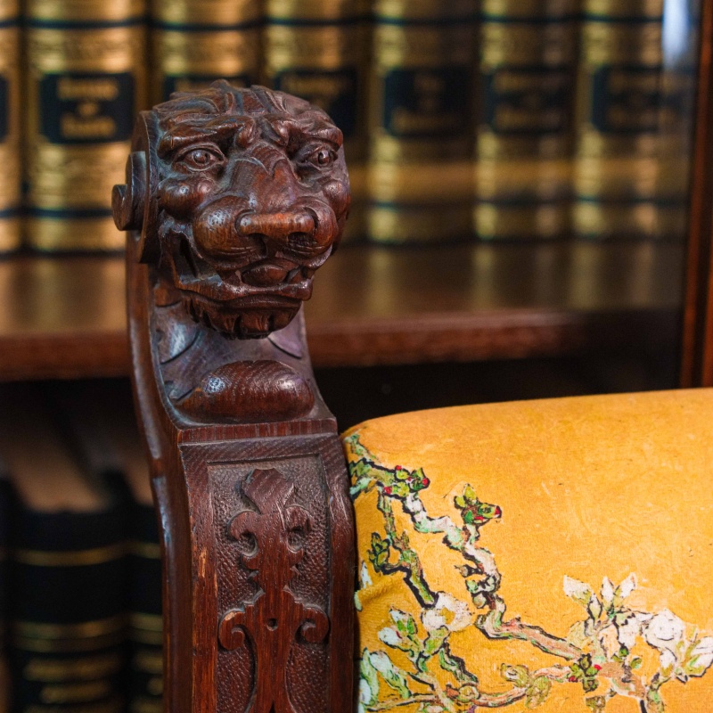 Пропорции кресла говорят о его предназначении для кабинета, библиотеки или представительского интерьера. В окружении книжных шкафов и резных панелей оно выглядит особенно органично, подчёркивая статусность и интеллектуальную атмосферу пространства.