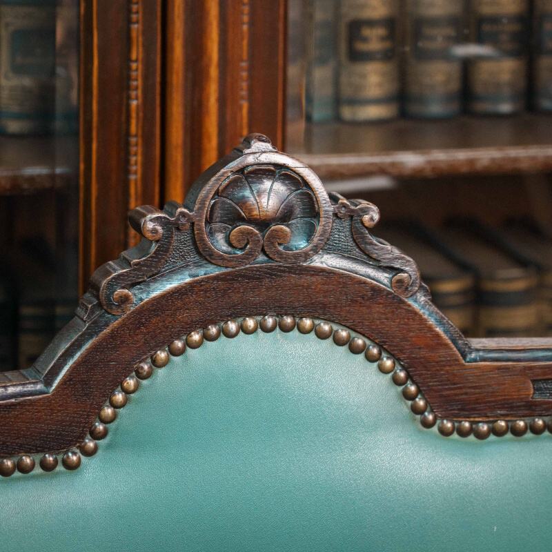 Спинка и сиденье обтянуты гладкой кожей глубокого зелёного цвета, которая отлично сочетается с тёплыми тонами древесины. Края обивки украшены рядом декоративных бронзовых гвоздей, создающих эффект изысканной рамки. Форма спинки изогнута и обрамлена резными элементами с мотивами аканта и стилизованных цветов, а в верхней части расположен резной медальон с маскароном — символом силы и мудрости.