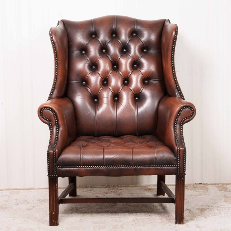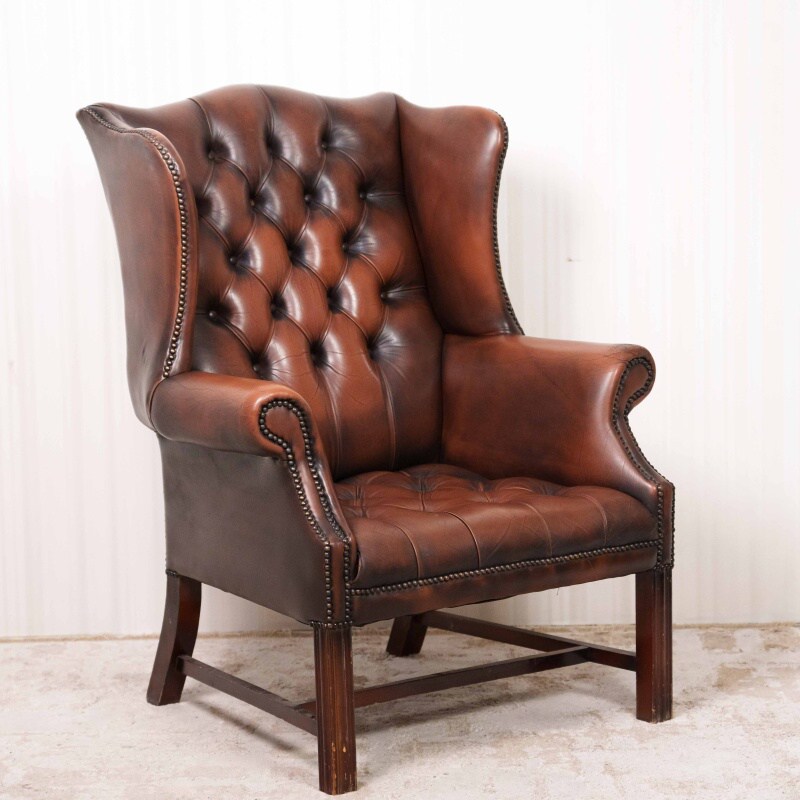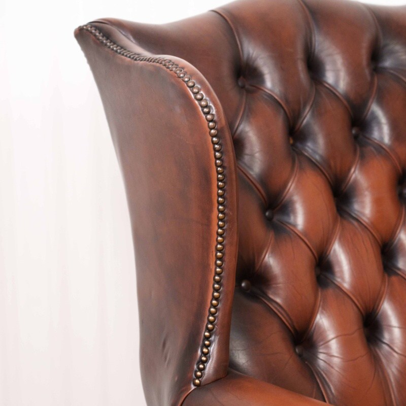 Кресло выполнено из высококачественной кожи глубокого коньячного оттенка, со временем приобретшей благородную патину. Обивка украшена характерной каретной стяжкой (deep button tufting), образующей ромбовидный узор на спинке и сиденье — неизменный символ стиля Честерфильд.