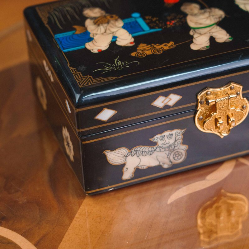 Лаковая поверхность глубокого чёрного цвета дополнена золотыми акцентами и орнаментами по периметру. Фурнитура — декоративный замочек в тёплом бронзовом оттенке, выполненный в традиционном восточном стиле.