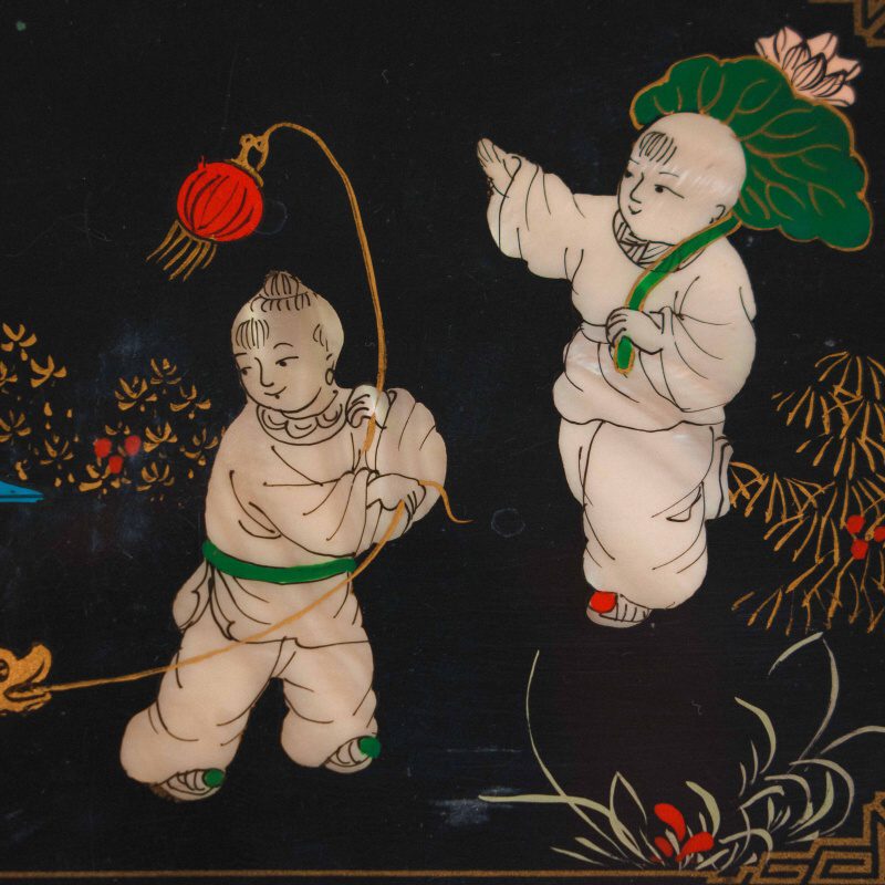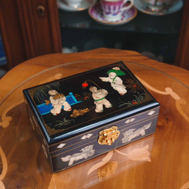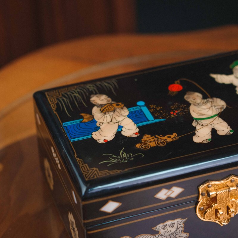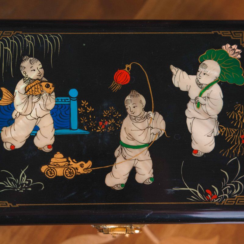 Элегантная декоративная шкатулка, выполненная в традиционной японской технике лакировки. Поверхность украшена миниатюрными сюжетными композициями: дети, играющие в саду, изображены с тонкой прорисовкой и использованием цветных вставок, что создаёт живой и яркий художественный образ. По бокам корпуса — стилизованные изображения львов-стражей (шиши), традиционных защитников дома.